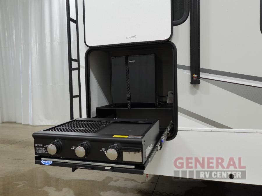 This fifth wheel is ready for adventure when you are! Once you arrive at the campground, you can put out the 16' awning, then start lunch on the exterior griddle. A booth dinette and theater sofa provide seating space inside, and there is a 50" Class HDTV to enjoy movies. The chef will also love the interior kitchen with its ample counter space, and there is plenty of storage with a hutch/pantry, second pantry, and 10 cu. ft. 12V refrigerator. Freshen up in the full bath before heading off to bed in the front private bedroom. Here, you'll find a queen bed, dual nightstands and overhead storage, plus a wardrobe with washer and dryer prep if you choose to add those appliances!