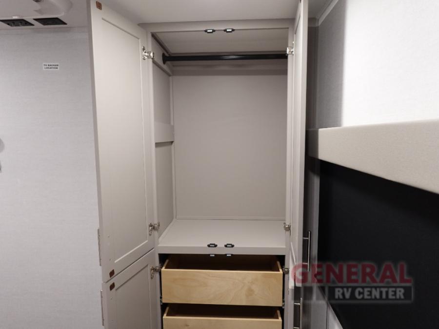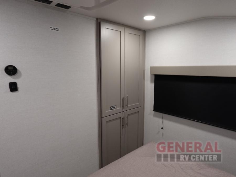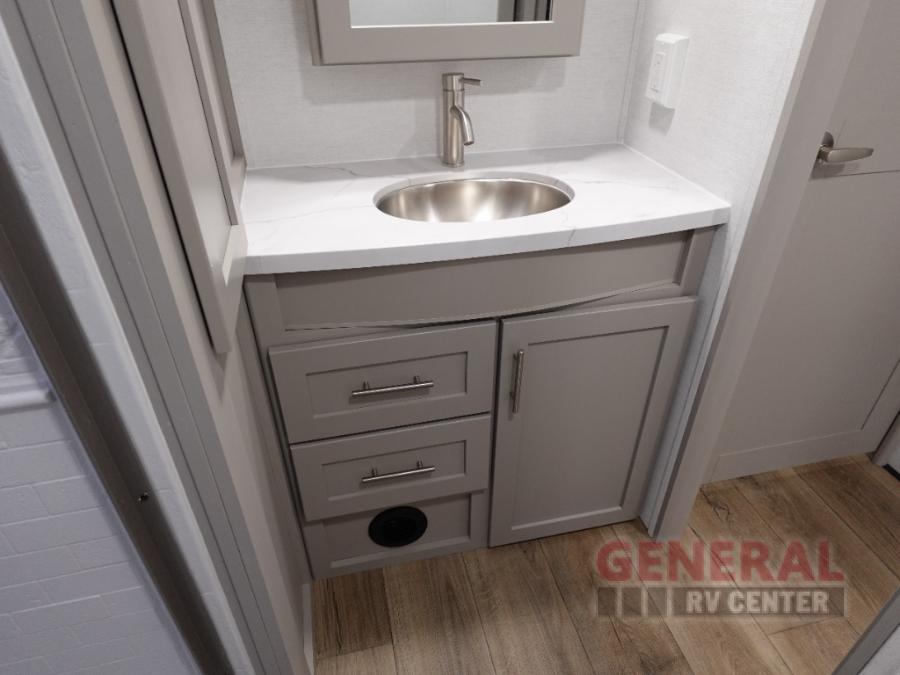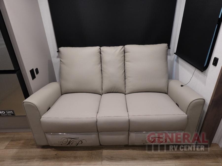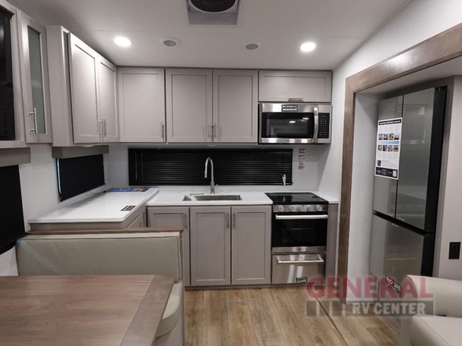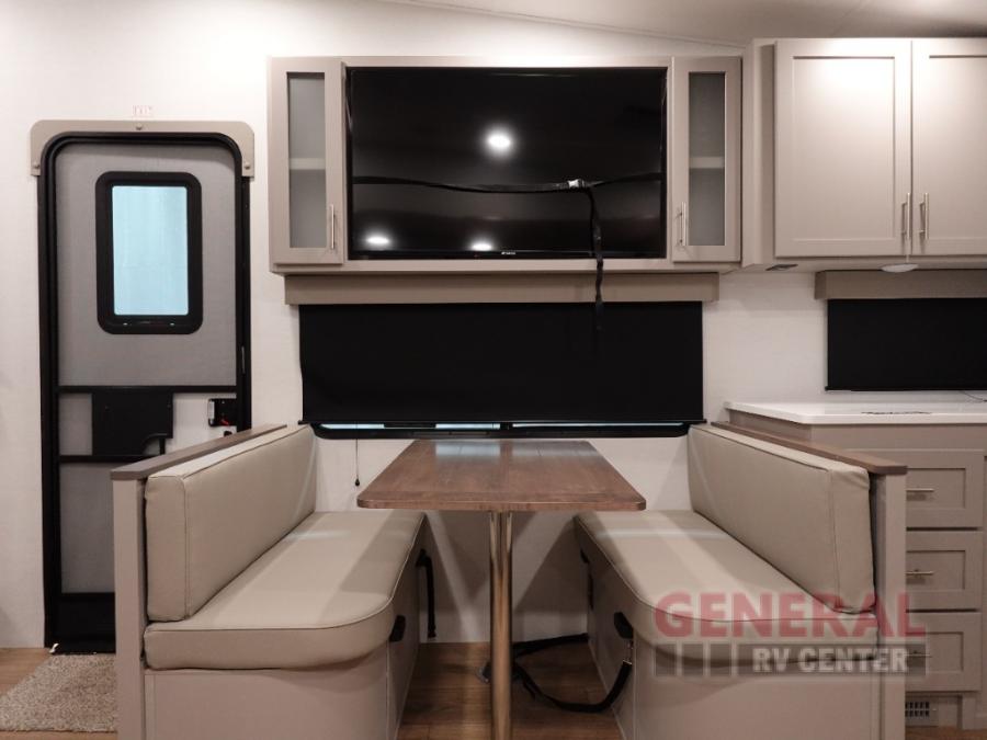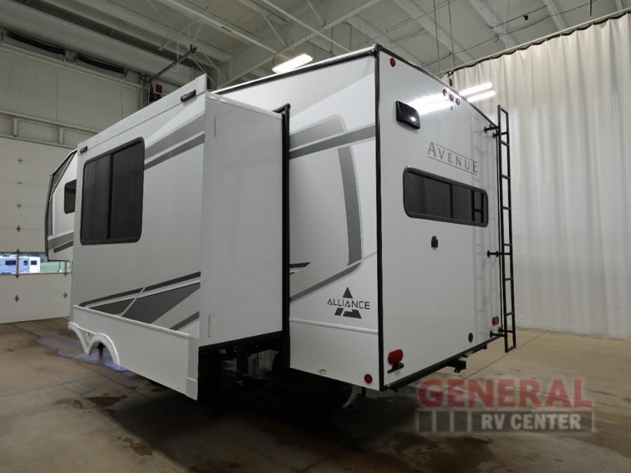 A benchmark chassis creates a space saver upper deck with each one of these Avenue All-Access fifth wheels by Alliance RV! The 101 in. wide-body construction gives you more room to walk around and the flush slide out floors throughout prevent any tripping. There are Azdel composite sidewalls inside and out, and a seamless fully walkable PVC roof for extreme durability and zero maintenance. You are sure to love no carpet throughout making each Avenue All-Access easy to clean and allergen free, not to mention pet friendly. You can maximize your space throughout with innovative storage solutions like the hidden storage behind the TV, inside the end tables, ottoman, and dinette chairs. These units also include the OTG Solar Package with a 200 watt solar panel, 15 amp MPPT charger, multiple outlets, and more to keep you powered up!