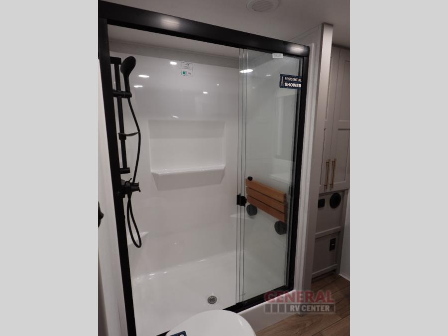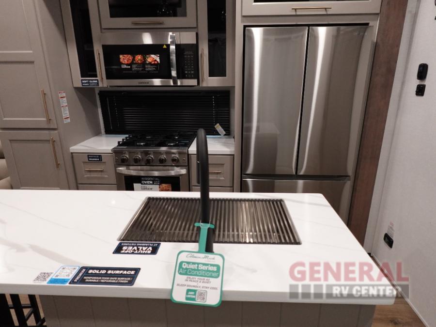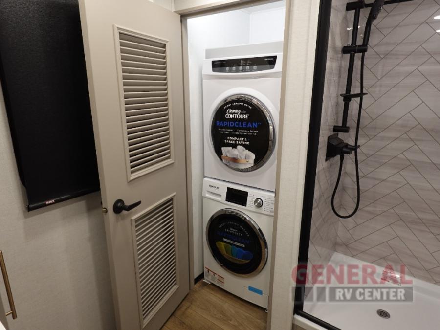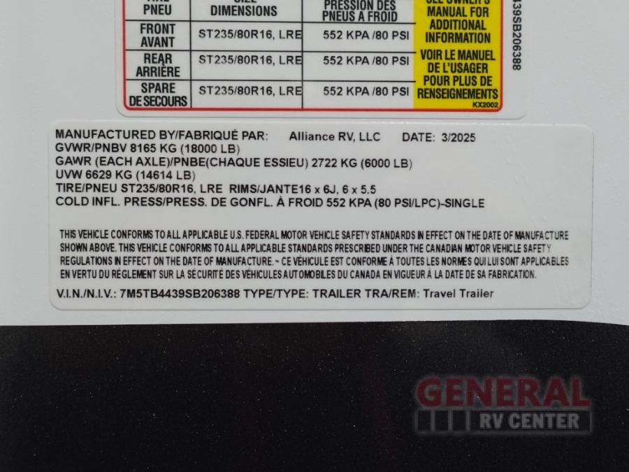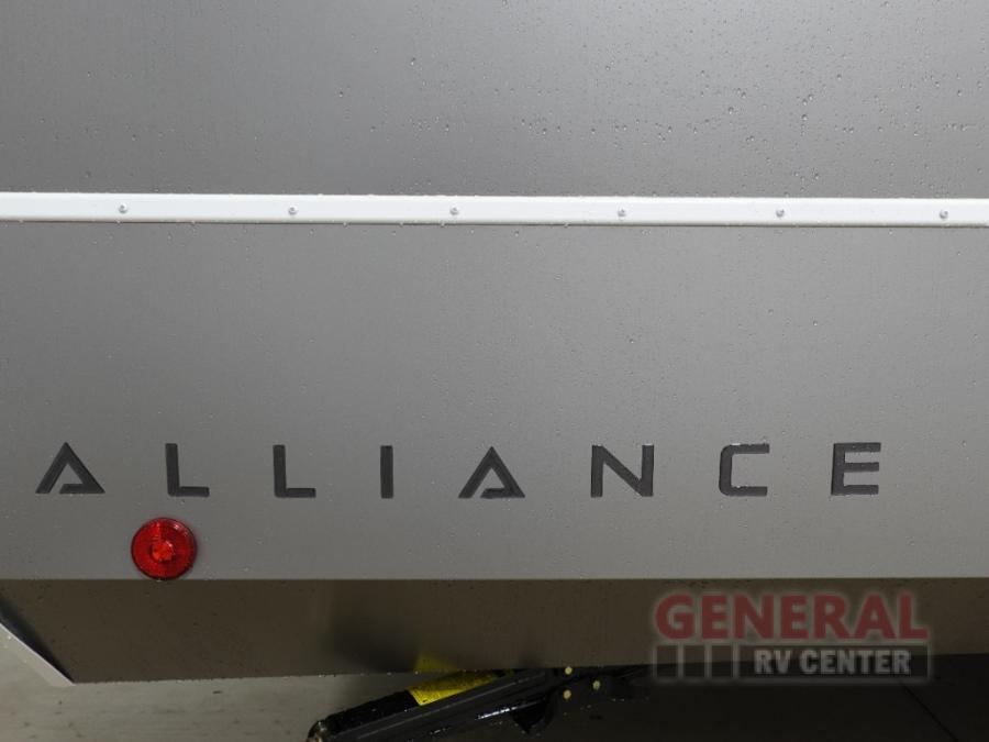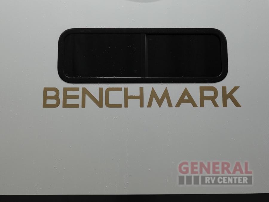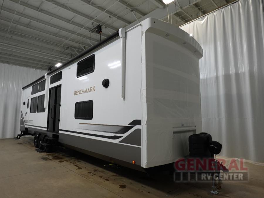 With any Benchmark destination trailer by Alliance RV, you will enjoy luxury features at every turn! The high gloss fiberglass exterior is ultra sleek, and the Azdel composite fiberglass sidewalls add durability so you can camp for years to come. You'll also find a residential exterior garden hose connection outside, along with a powder coated aluminum rear ladder, and an auxiliary LP tank hook up if you want to bring your grill along. Head inside to find hardwood cabinetry, solid surface countertops throughout, oversized windows in all rooms, and MCD roller shades throughout. The 45,000 BTU A/C and 60,000 BTU furnace will keep you comfortable year around, and there is a stackable washer and dryer to make full-time RV living easier than ever!
