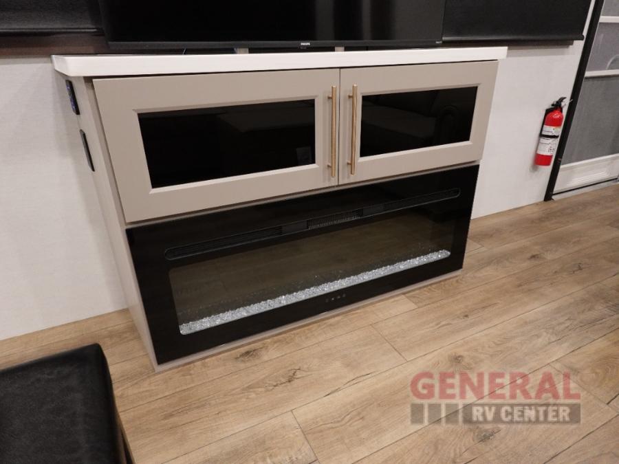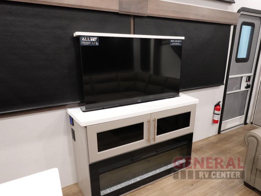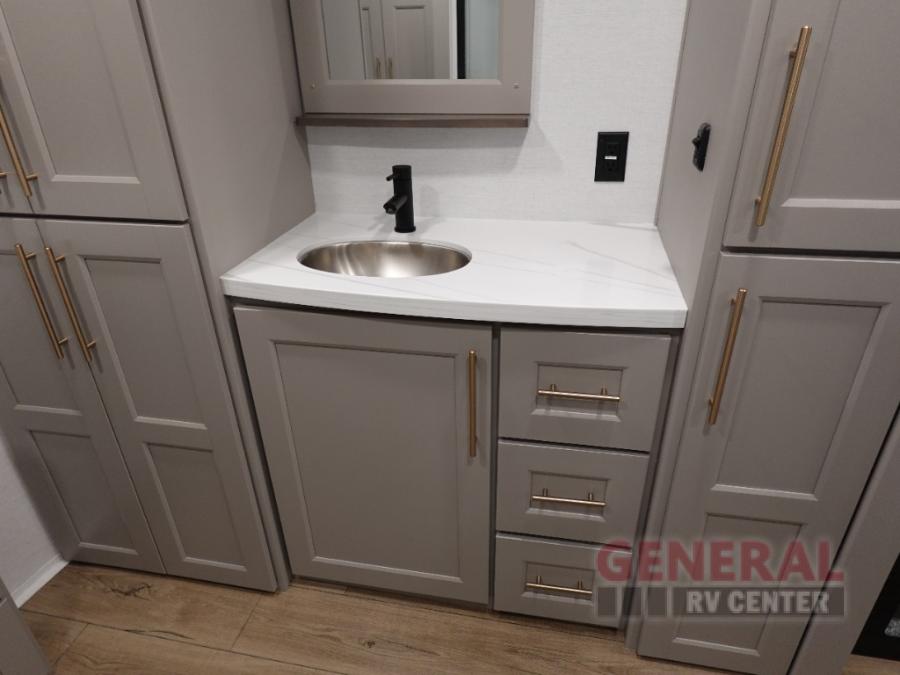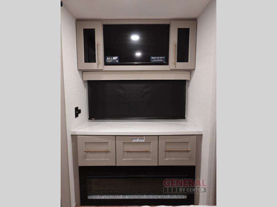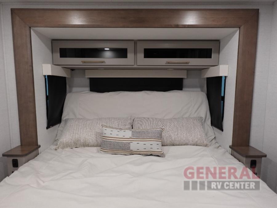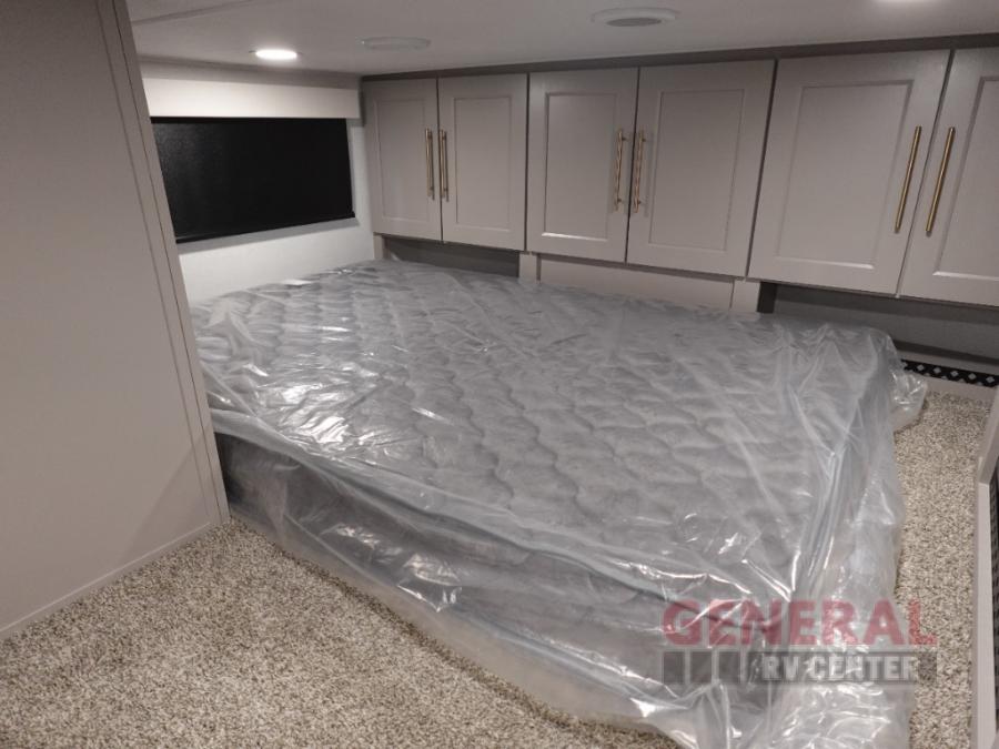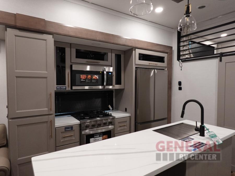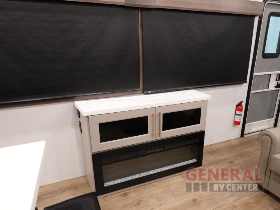 With any Benchmark destination trailer by Alliance RV, you will enjoy luxury features at every turn! The high gloss fiberglass exterior is ultra sleek, and the Azdel composite fiberglass sidewalls add durability so you can camp for years to come. You'll also find a residential exterior garden hose connection outside, along with a powder coated aluminum rear ladder, and an auxiliary LP tank hook up if you want to bring your grill along. Head inside to find hardwood cabinetry, solid surface countertops throughout, oversized windows in all rooms, and MCD roller shades throughout. The 45,000 BTU A/C and 60,000 BTU furnace will keep you comfortable year around, and there is a stackable washer and dryer to make full-time RV living easier than ever!