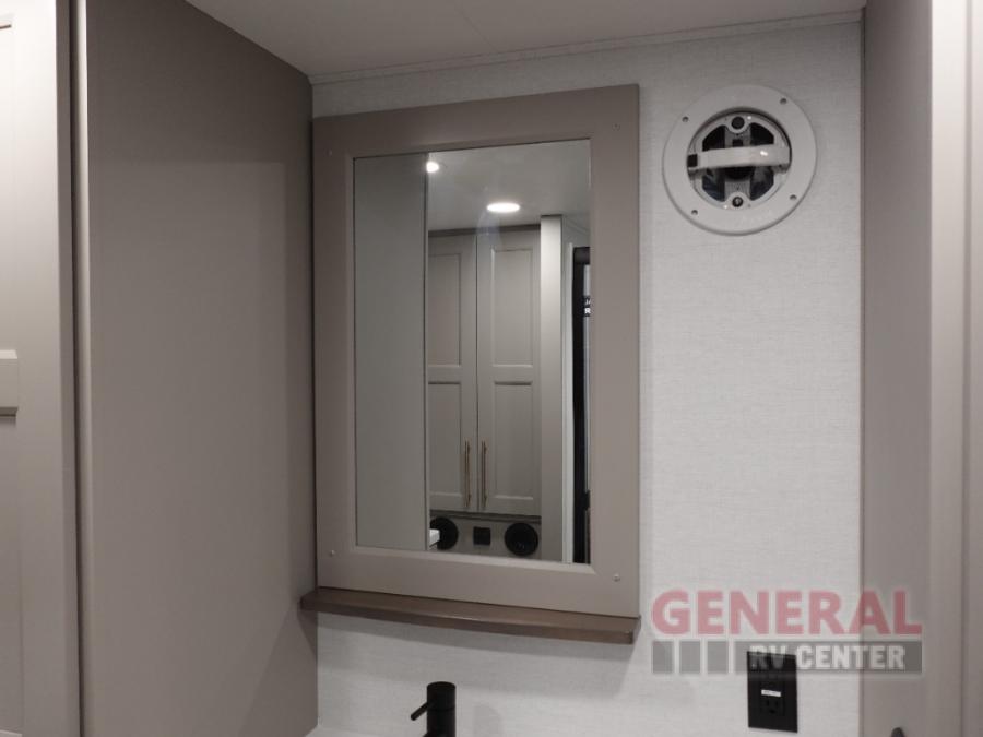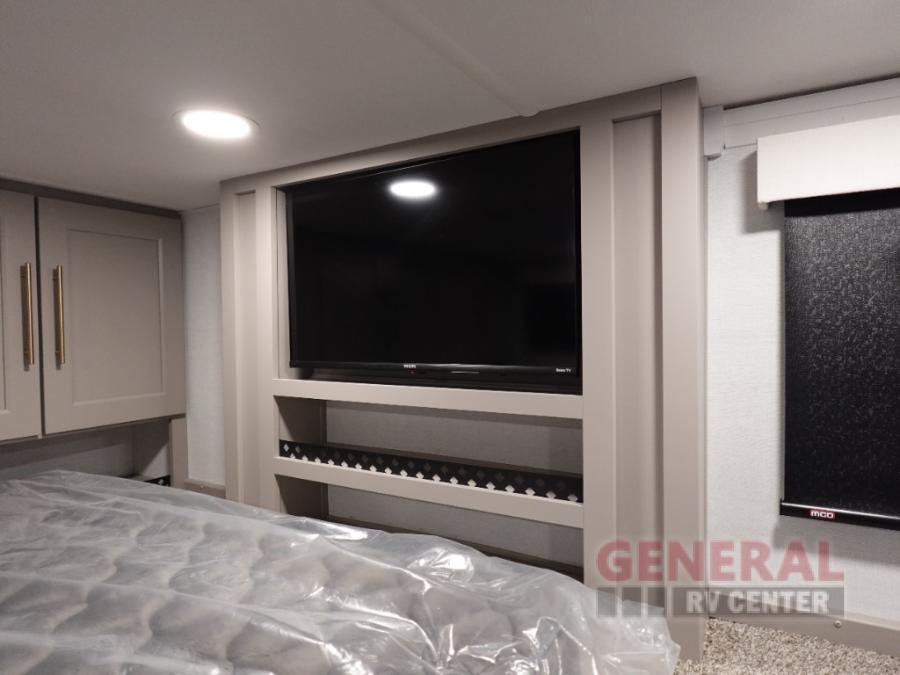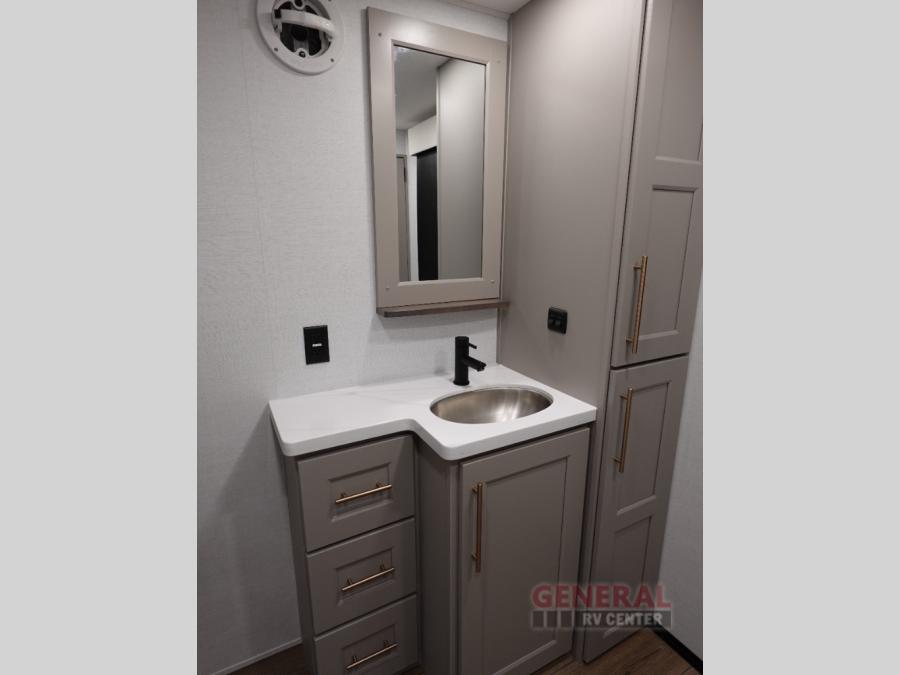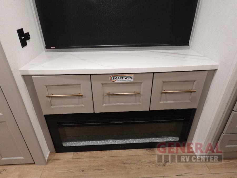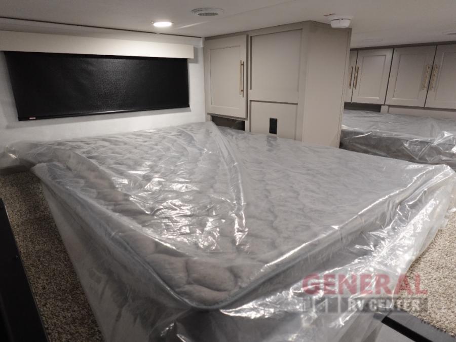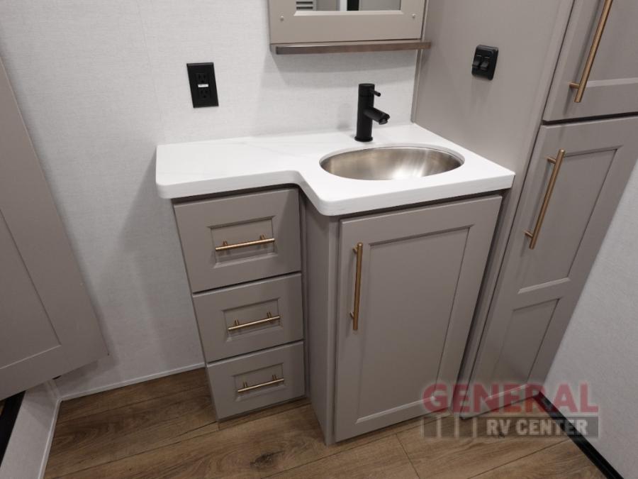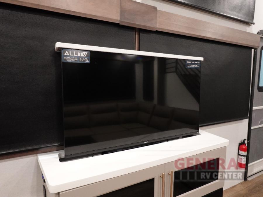 With any Benchmark destination trailer by Alliance RV, you will enjoy luxury features at every turn! The high gloss fiberglass exterior is ultra sleek, and the Azdel composite fiberglass sidewalls add durability so you can camp for years to come. You'll also find a residential exterior garden hose connection outside, along with a powder coated aluminum rear ladder, and an auxiliary LP tank hook up if you want to bring your grill along. Head inside to find hardwood cabinetry, solid surface countertops throughout, oversized windows in all rooms, and MCD roller shades throughout. The 45,000 BTU A/C and 60,000 BTU furnace will keep you comfortable year around, and there is a stackable washer and dryer to make full-time RV living easier than ever!
