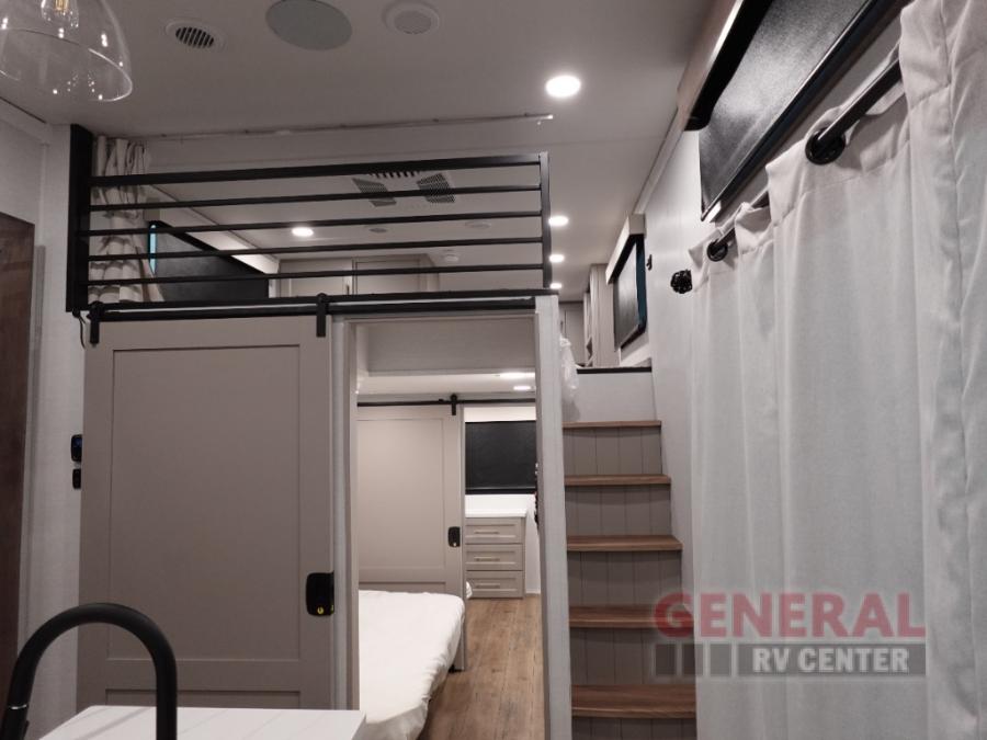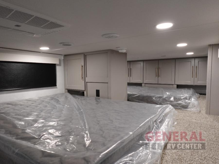 This destination trailer is perfect for a big crowd since it has one Power Tiling king bed, three mattress and an L- shape sofa where 10 people can easily fit. Experience the in-home feeling with the amazing kitchen and living room, furnished with a Kitchen island, L- shape sofa and a residential 110 V fridge. Also, you can sense the extreme coziness thanks to the dual fire places and get 24/7 entertainment due to the four TVs along the trailer. Plenty of place can be found in the front and rear loft bedrooms with three wardrobes in total. Lastly the two full bathrooms will allow you to comfortably take a shower after a long day.