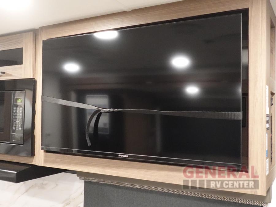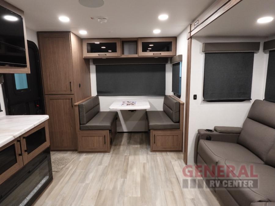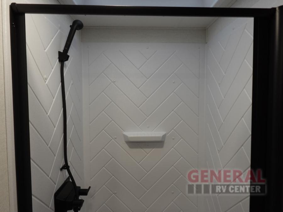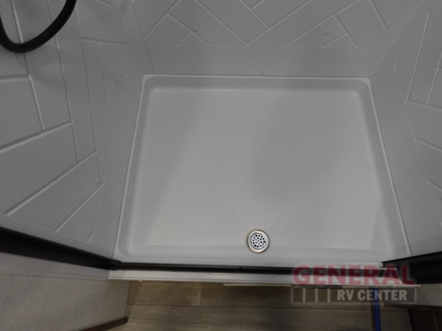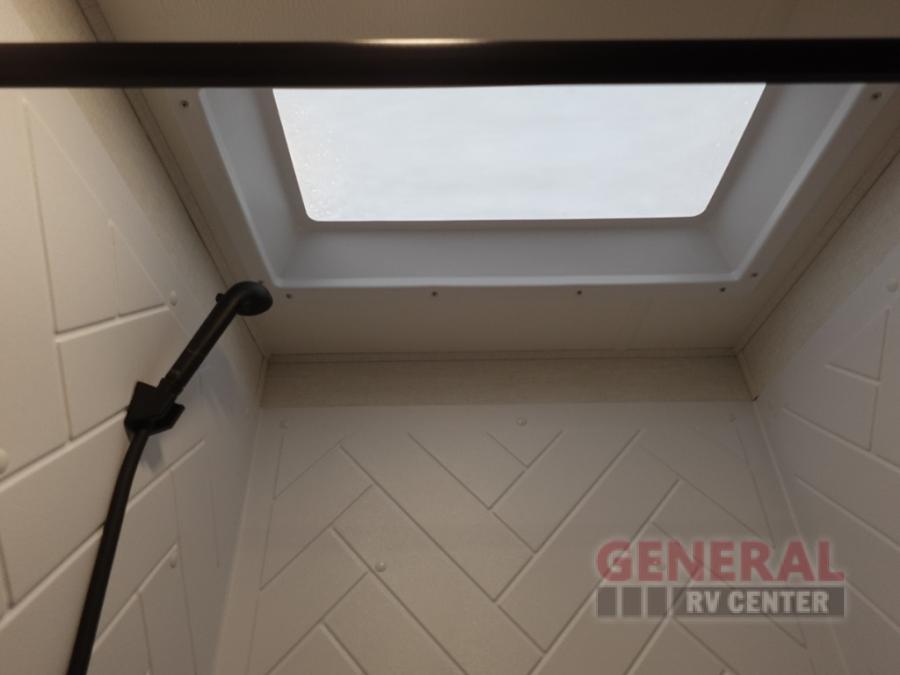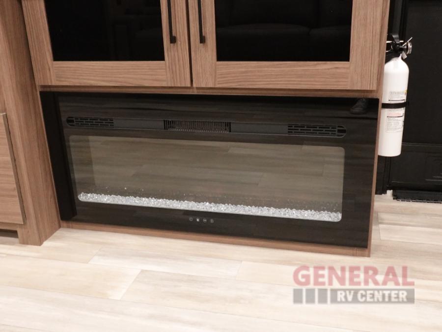 Grab your hiking boots and your sense of adventure for fun camping trips in this single slide out travel trailer. The rear booth dinette includes overhead storage for your things and the sofa slide out is in great view of the 40" HDTV. There is also a fireplace here that will make your space feel more like home plus more storage space, including an entryway closet and storage above the 10 cu. ft. 12V refrigerator. A walk-through bath will take you to the front master bedroom with a queen bed, wardrobe nightstands, plus its own exterior entry door!