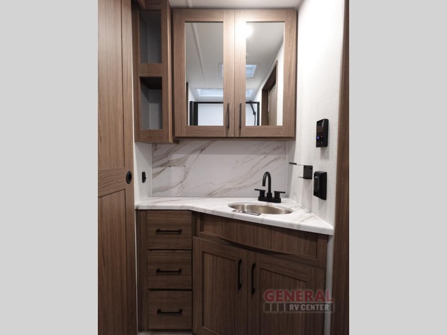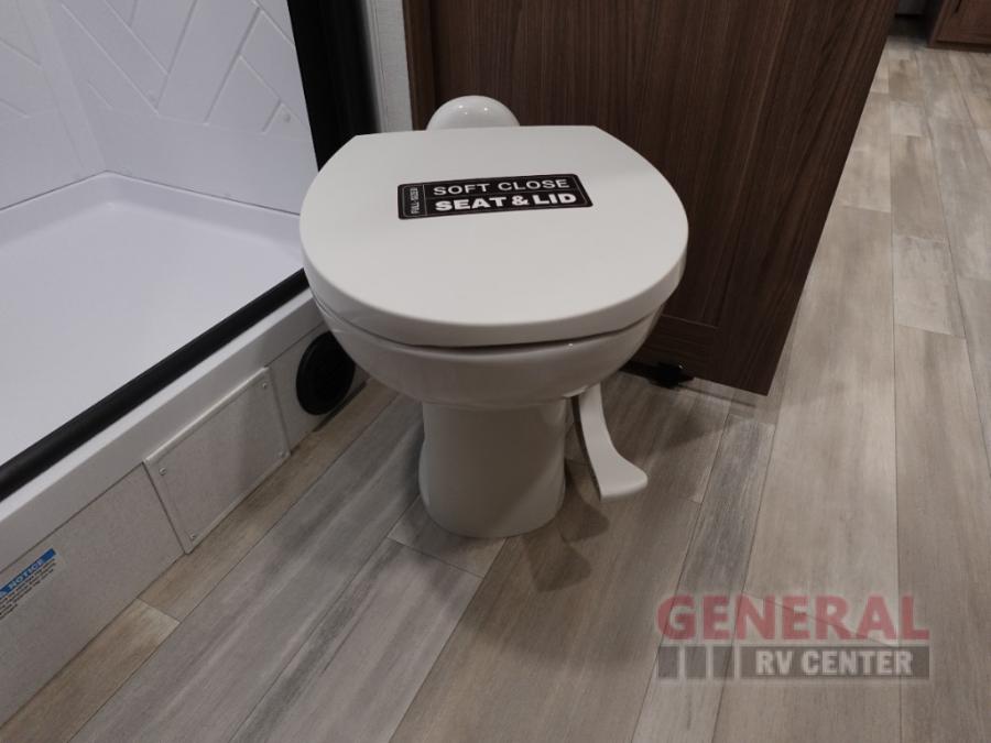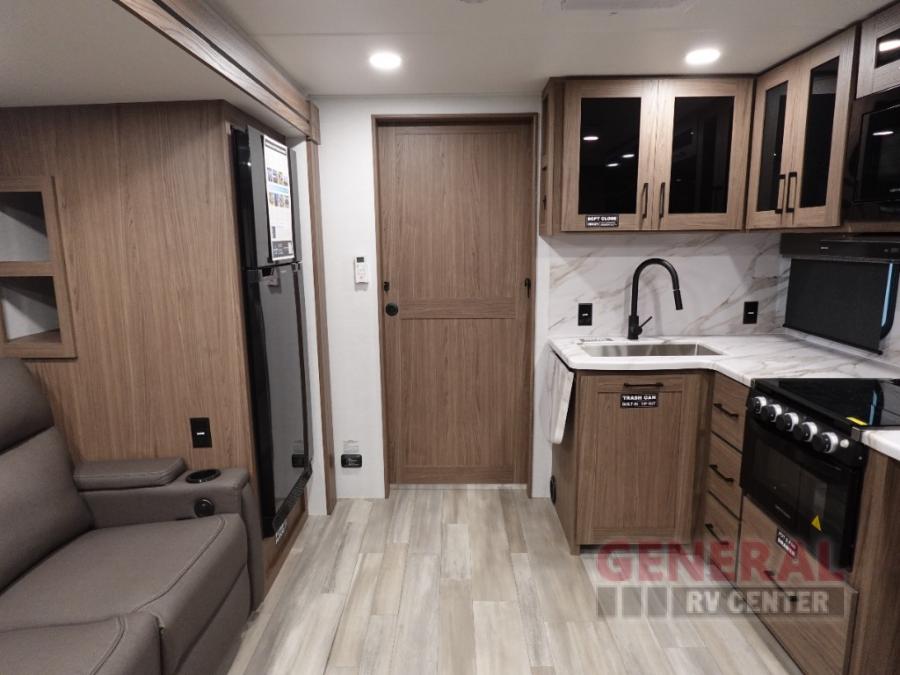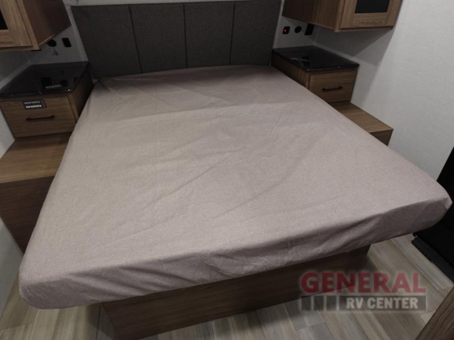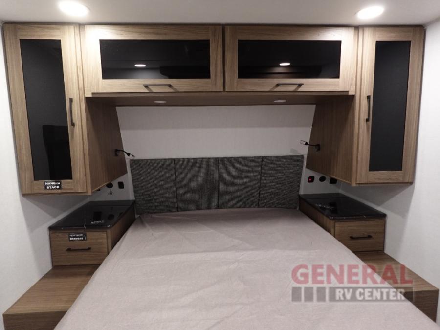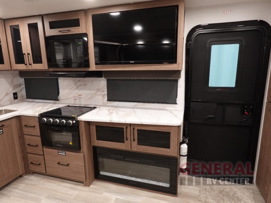 Grab your hiking boots and your sense of adventure for fun camping trips in this single slide out travel trailer. The rear booth dinette includes overhead storage for your things and the sofa slide out is in great view of the 40" HDTV. There is also a fireplace here that will make your space feel more like home plus more storage space, including an entryway closet and storage above the 10 cu. ft. 12V refrigerator. A walk-through bath will take you to the front master bedroom with a queen bed, wardrobe nightstands, plus its own exterior entry door!