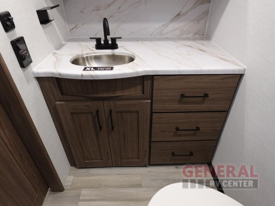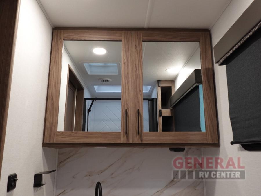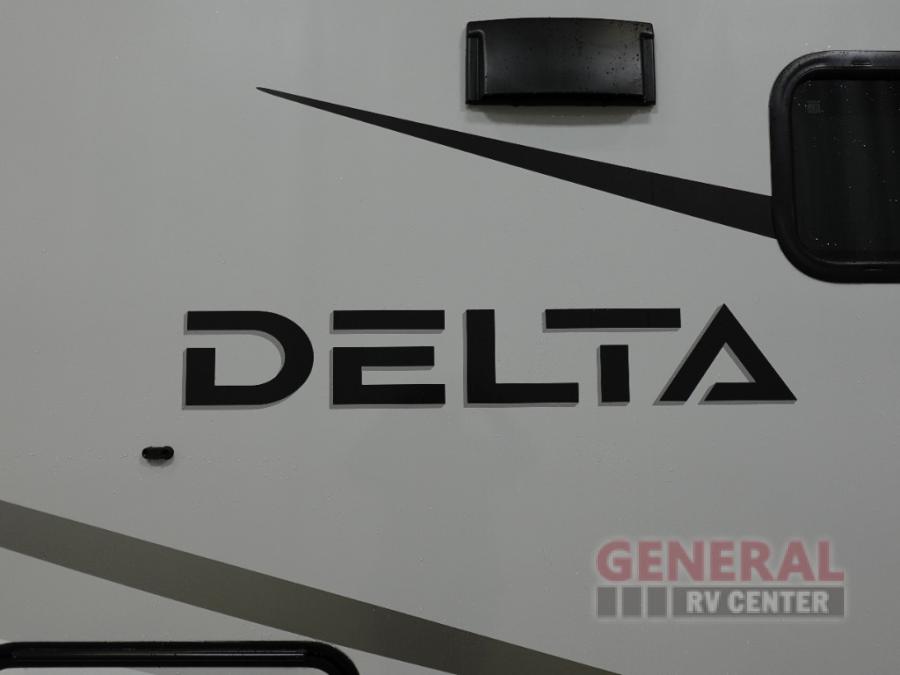 You will love all of your adventures with this Delta travel trailer in tow! This unit is perfect for a couple or even a family of four with a queen bed in the front private bedroom, and also using the U-shaped dinette once converted for more sleeping space. The U-shaped dinette is great for gathering for meals, a board game or game of cards, and the theater seat sofa is directly opposite a 40" HDTV which makes viewing enjoyable. You can easily prepare all of your favorite meals and snacks with the kitchen amenities provided inside. A three burner range allows you to easily cook indoors, or you can cook outside using the outdoor griddle/grill if you like. There is a 10 cu. ft. 12V refrigerator to keep all of your perishables and drinks nice and cold, plus a large sink for dishes and cleaning up, and a convenient pull-out trash can and flip-up counter extension as well. You will also appreciate the full rear bath featuring a 30" x 36" shower, toilet, vanity with sink, and linen cabinet for your towels and toiletries.