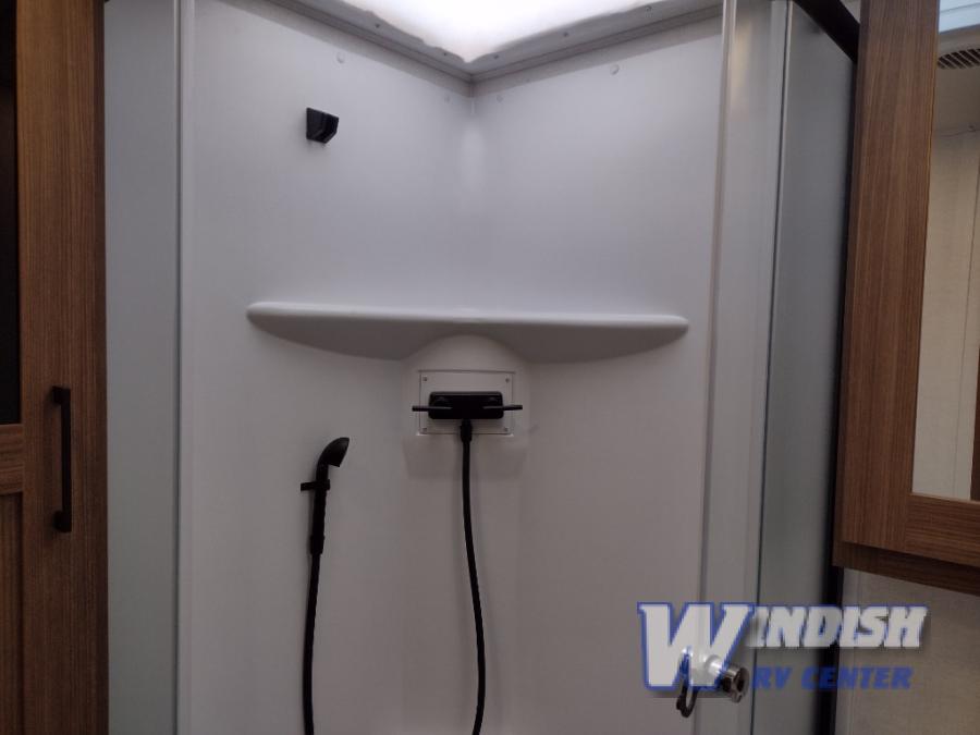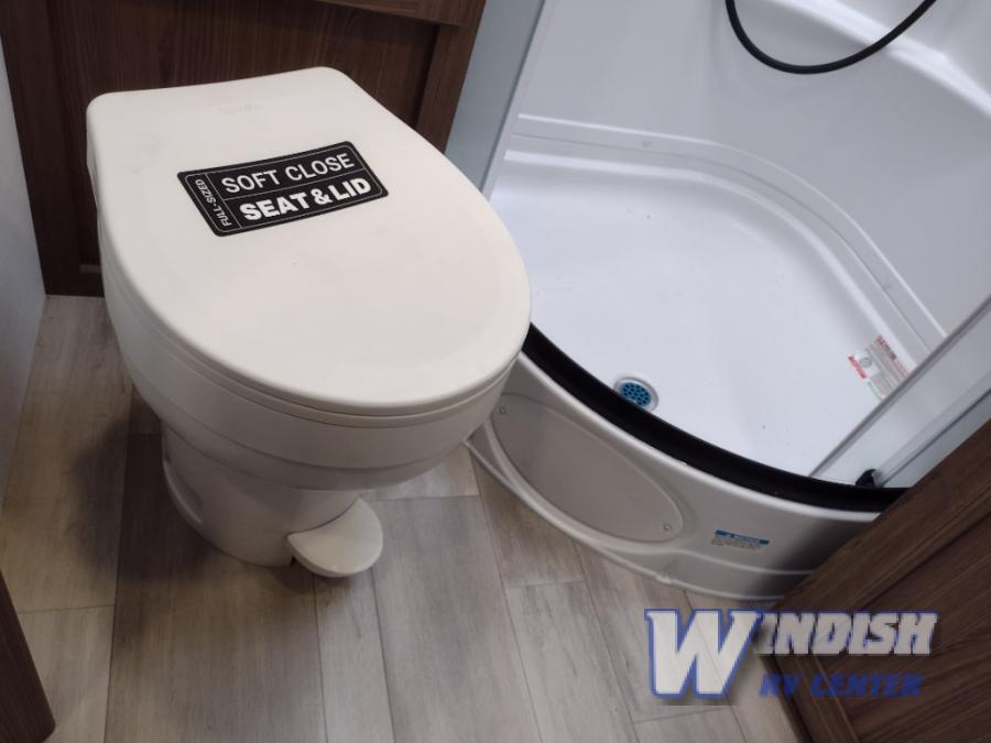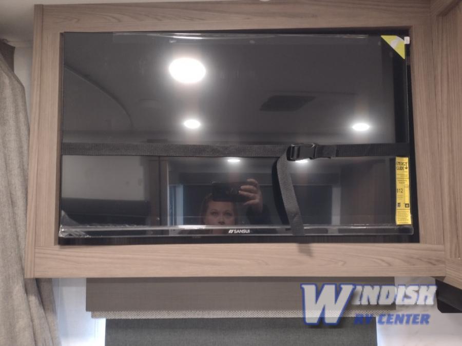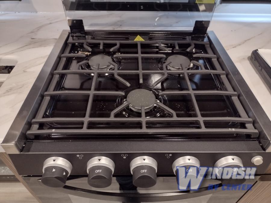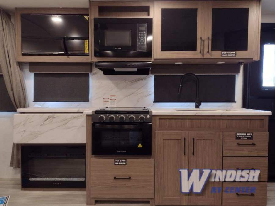 This couple's trailer is perfect for weekend trips to your favorite campground. The theater seat slide will provide comfort and space, while the fireplace across the room will have you feeling right at home. There are also two tables for the sofa and a flip-up extension by the fireplace for more counter space. All of your meals can be made on the three burner cooktop, and clean up will be a breeze with the large kitchen sink. A full bath is complete with a toilet, sink, 32" shower and a linen closet, and the front queen bed with a privacy curtain is sure to provide a great night's rest. You'll also find dual wardrobes and nightstands, along with overhead storage to keep everything organized!