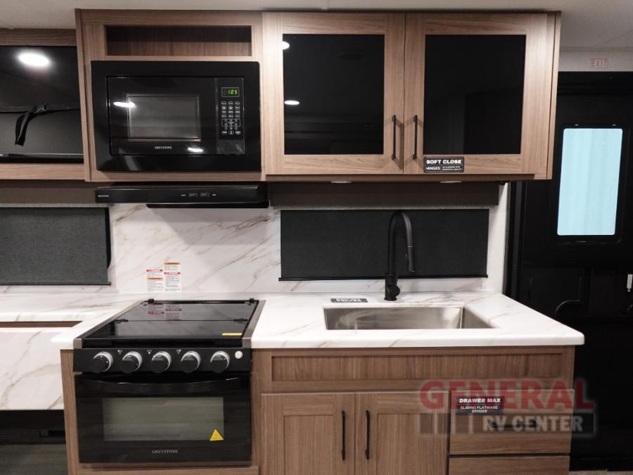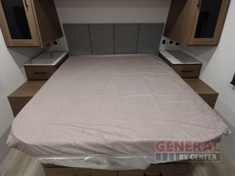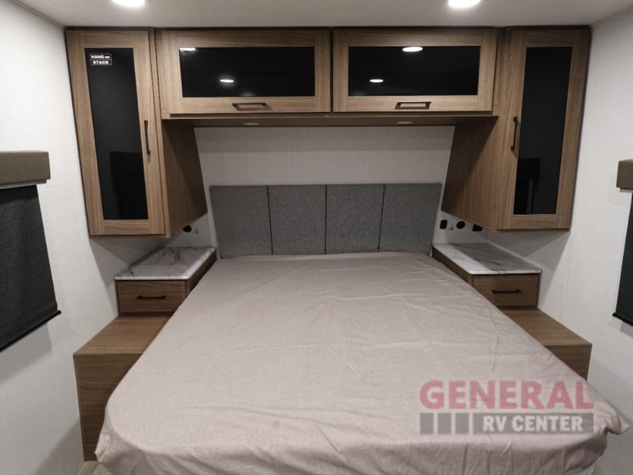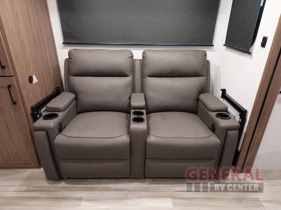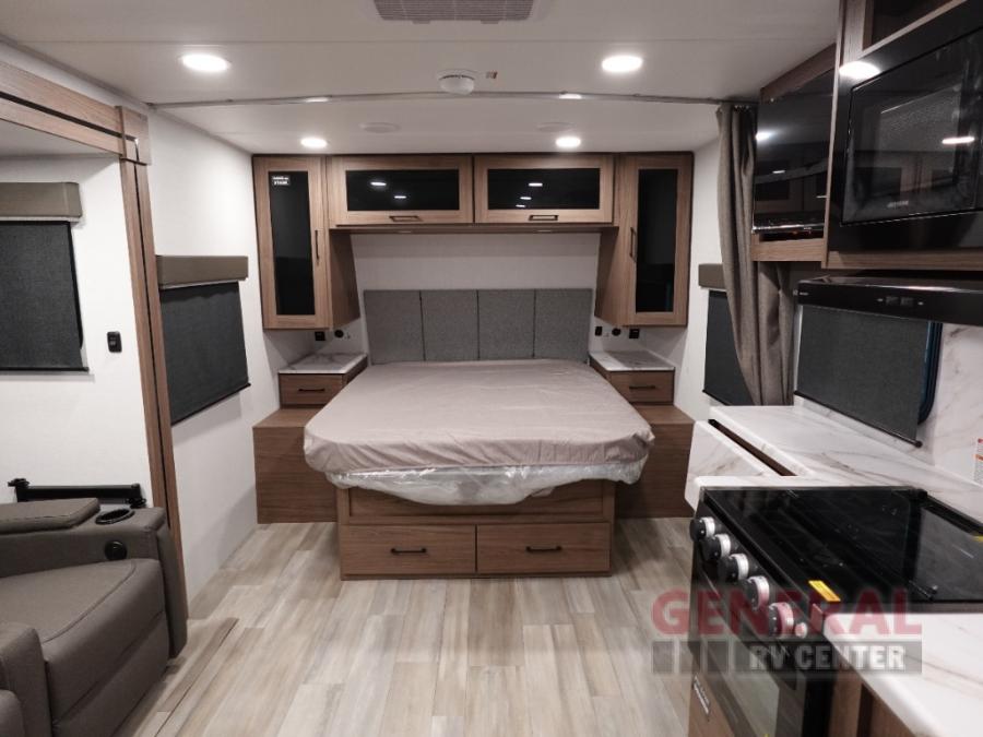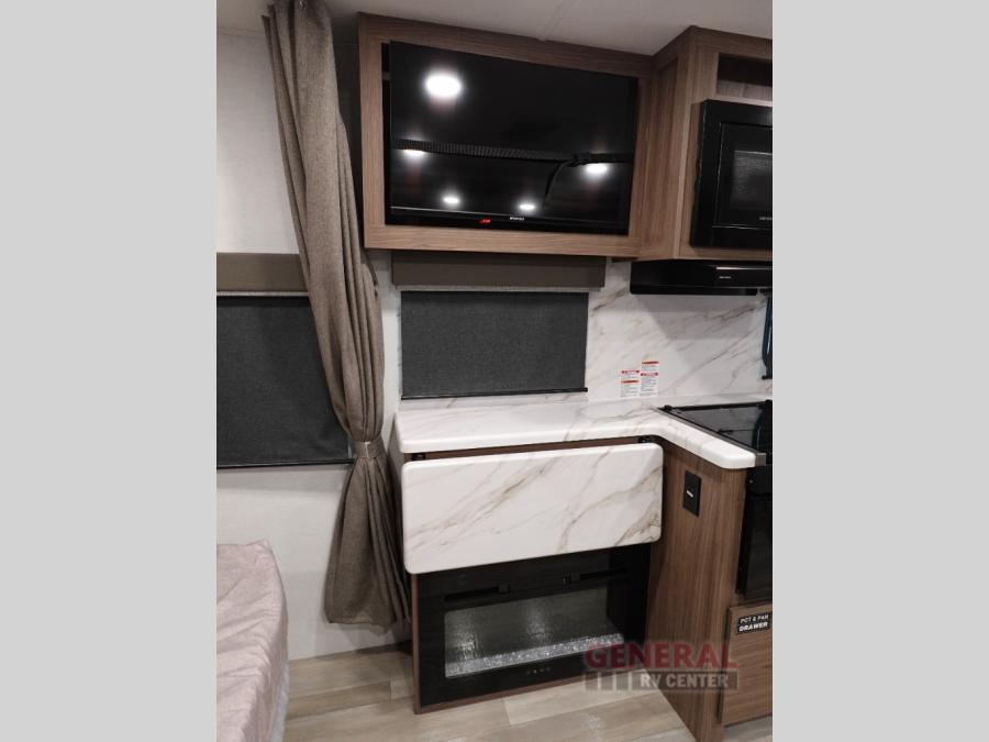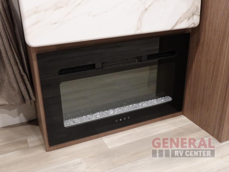 This couple's trailer is perfect for weekend trips to your favorite campground. The theater seat slide will provide comfort and space, while the fireplace across the room will have you feeling right at home. There are also two tables for the sofa and a flip-up extension by the fireplace for more counter space. All of your meals can be made on the three burner cooktop, and clean up will be a breeze with the large kitchen sink. A full bath is complete with a toilet, sink, 32" shower and a linen closet, and the front queen bed with a privacy curtain is sure to provide a great night's rest. You'll also find dual wardrobes and nightstands, along with overhead storage to keep everything organized!