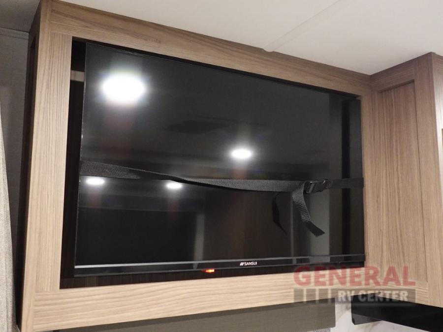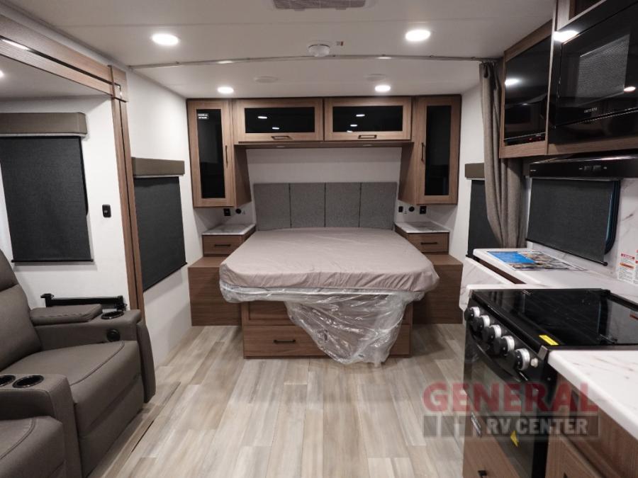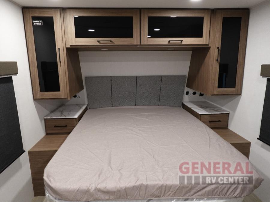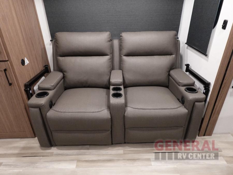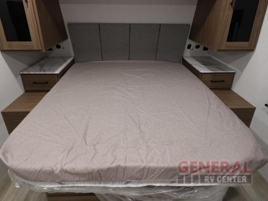 This couple's trailer is perfect for weekend trips to your favorite campground. The theater seat slide will provide comfort and space, while the fireplace across the room will have you feeling right at home. There are also two tables for the sofa and a flip-up extension by the fireplace for more counter space. All of your meals can be made on the three burner cooktop, and clean up will be a breeze with the large kitchen sink. A full bath is complete with a toilet, sink, 32" shower and a linen closet, and the front queen bed with a privacy curtain is sure to provide a great night's rest. You'll also find dual wardrobes and nightstands, along with overhead storage to keep everything organized!