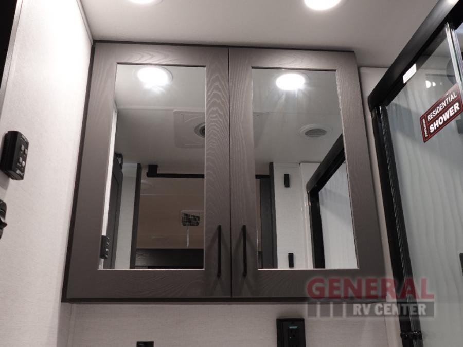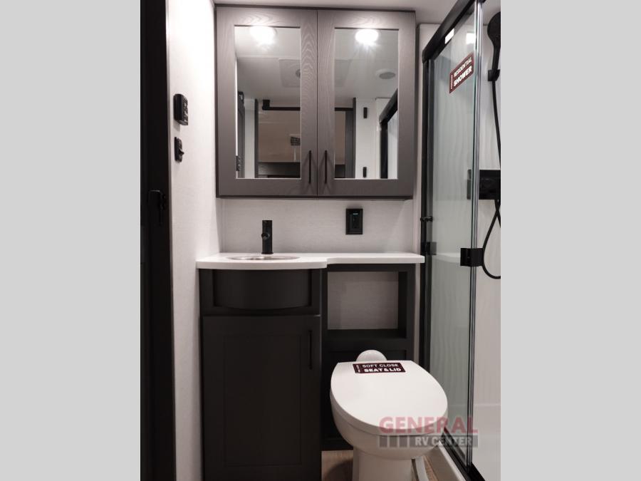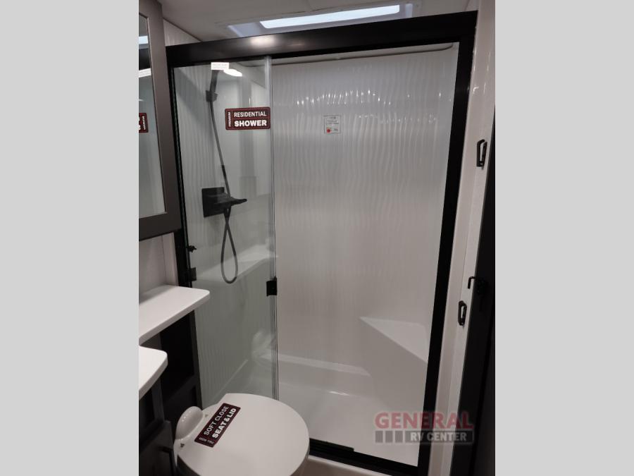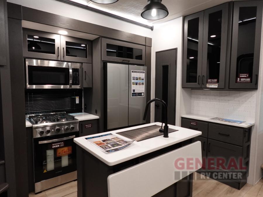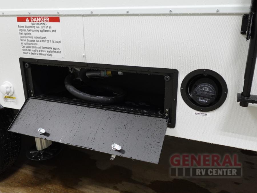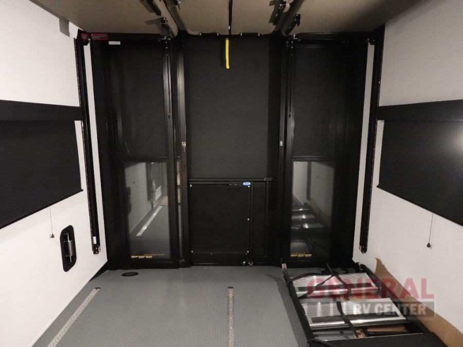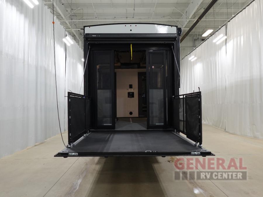 The whole family will have a fun time camping in this toy hauler! You can easily load up your toys into the 11' garage area with the 8' weather resistant ramp door and keep them filled with the dual 30 gallon fuel tanks. Once you unload your toys from the garage area, you can set up the opposing HappiJac sofas with a queen mattress above them, the loft that opens to the living room, and the half bathroom. The kitchen has everything you need to prepare your best meals including two hutches, three pantries, and a kitchen island with two bar stools to enjoy your morning coffee and eggs. The dual entry bathroom has a 48" x 30" shower and leads directly into the front private bedroom. Inside the bedroom is a king bed slide for more floor space, a flip top dresser, and a front wardrobe with washer and dryer prep!