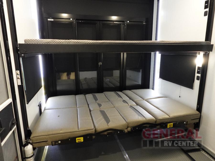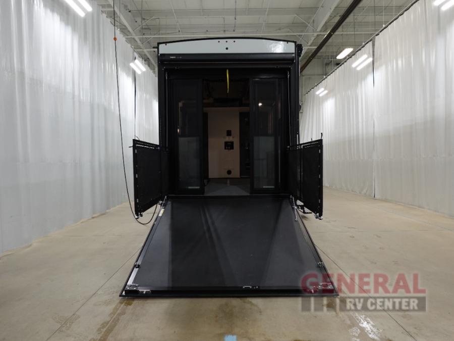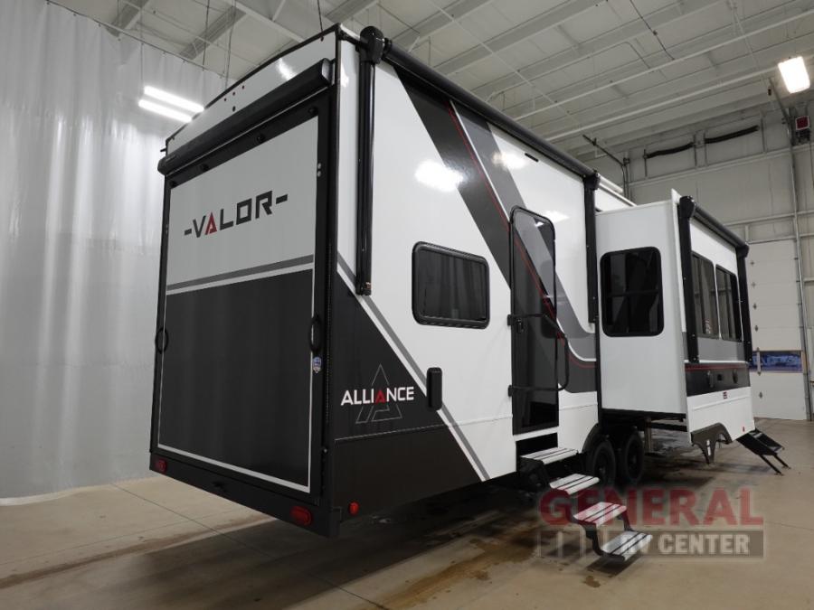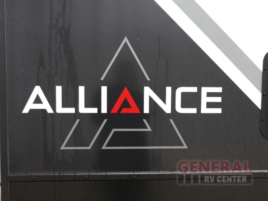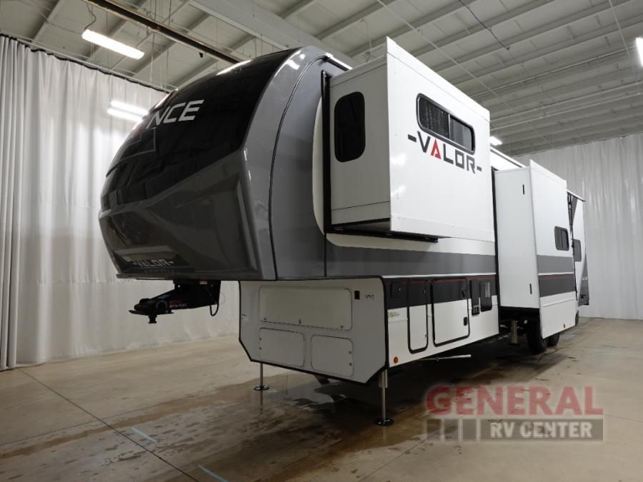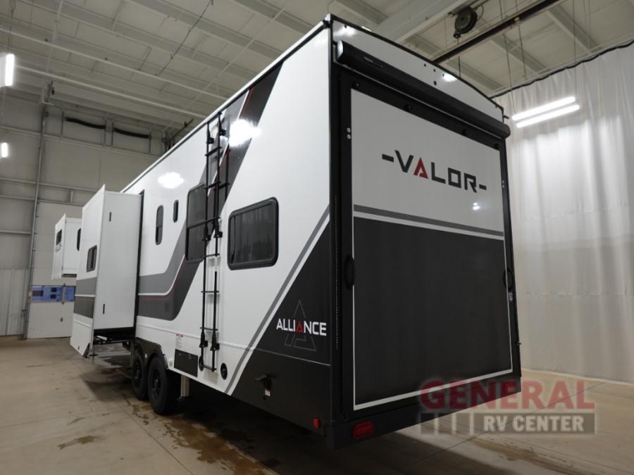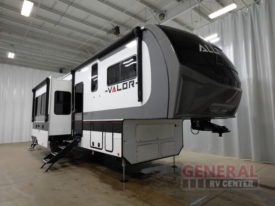You can bring your toys with you wherever you go with any one of these Alliance RV Valor toy hauler fifth wheels! They are adventure-ready with a quality build from the walk on roof with seamless PVC roof covering to the commercial grade vinyl flooring and MorRyde CRE3000 suspension system. The Performance Running Gear package comes with a 101" wide-body benchmark chassis platform, 7,000 lb. Dexter axles, and a space enhancing drop frame storage compartment to pack in all your riding gear. You can even go off-gridding thanks to the Off the Grid Pack that has two 400 watt solar panels, generator prep, a 40 amp charge controller, and a 100 amp hour lithium iron phosphate battery. Some of the interior comforts you will enjoy are the hardwood cabinet doors and drawers, solid surface kitchen countertops, and commercial grade vinyl flooring with no carpet to make clean up a breeze. The Valor toy haulers are also the Masters of 12 Volt with USB charging station throughout, a stainless steel refrigerator, and more 12 volt features to make camping hassle-free!