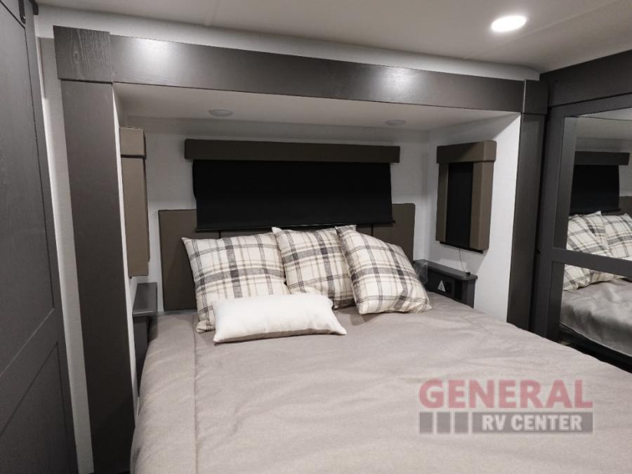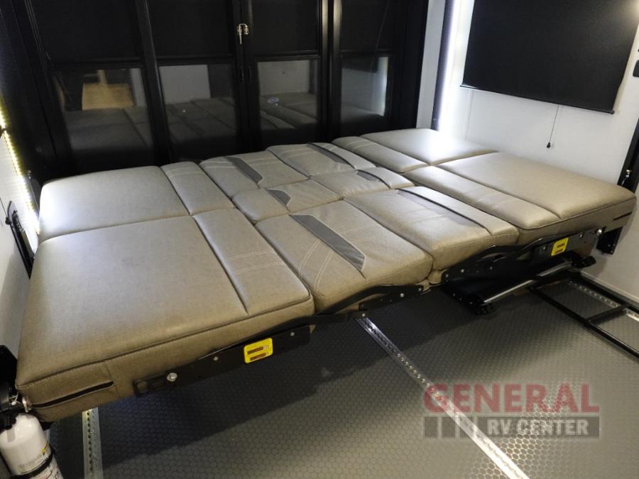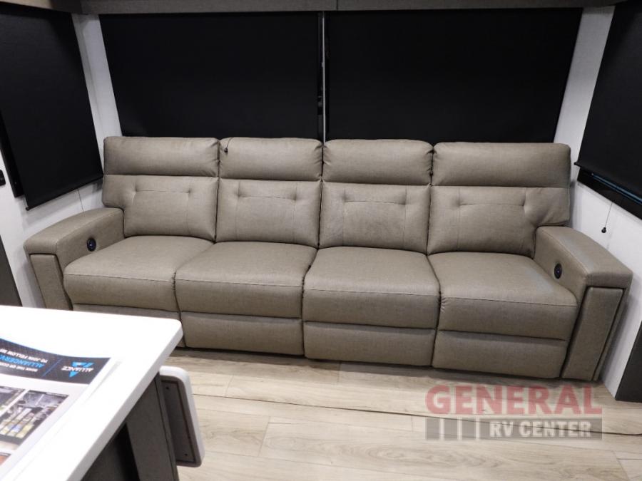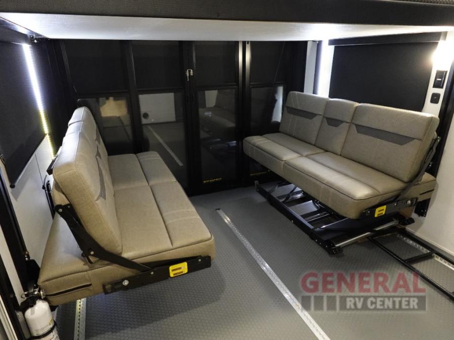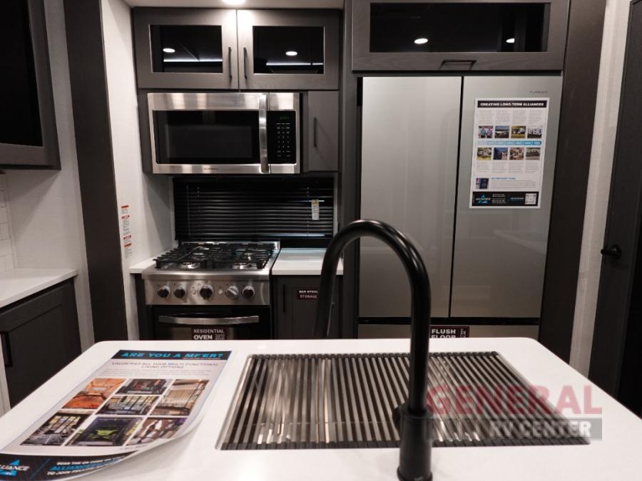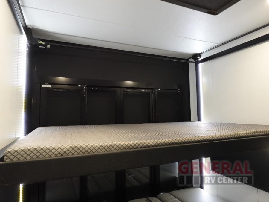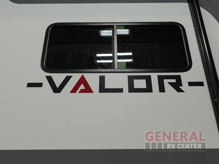 You can bring your toys with you wherever you go with any one of these Alliance RV Valor toy hauler fifth wheels! They are adventure-ready with a quality build from the walk on roof with seamless PVC roof covering to the commercial grade vinyl flooring and MorRyde CRE3000 suspension system. The Performance Running Gear package comes with a 101" wide-body benchmark chassis platform, 7,000 lb. Dexter axles, and a space enhancing drop frame storage compartment to pack in all your riding gear. You can even go off-gridding thanks to the Off the Grid Pack that has two 400 watt solar panels, generator prep, a 40 amp charge controller, and a 100 amp hour lithium iron phosphate battery. Some of the interior comforts you will enjoy are the hardwood cabinet doors and drawers, solid surface kitchen countertops, and commercial grade vinyl flooring with no carpet to make clean up a breeze. The Valor toy haulers are also the Masters of 12 Volt with USB charging station throughout, a stainless steel refrigerator, and more 12 volt features to make camping hassle-free!