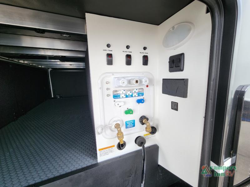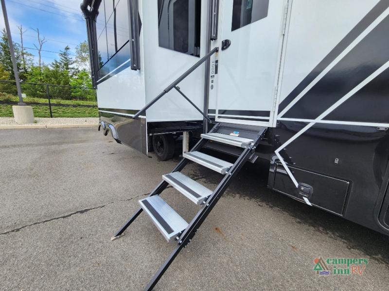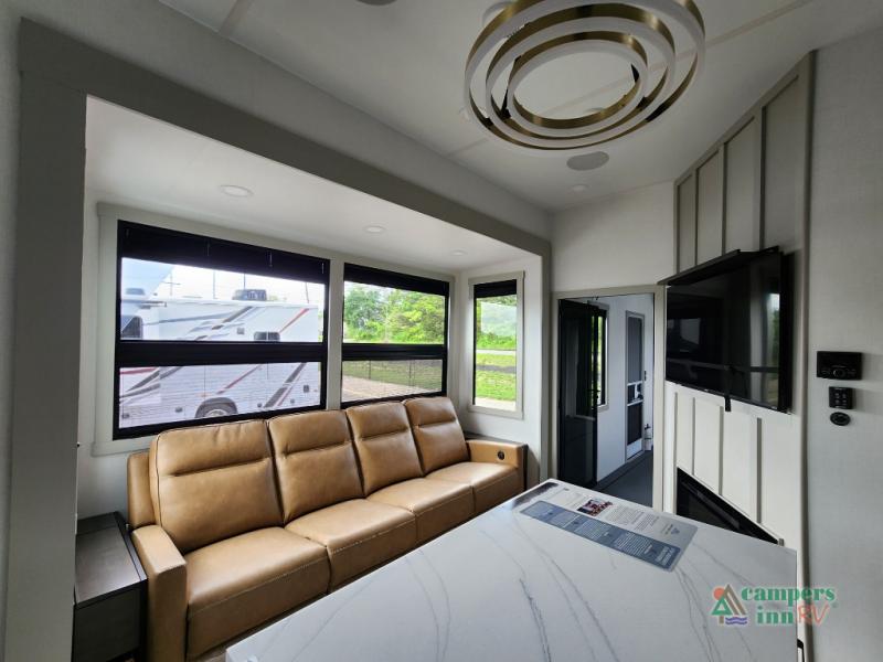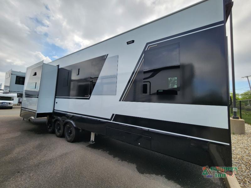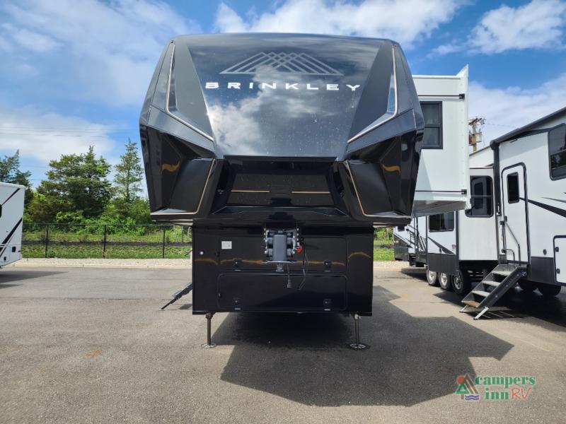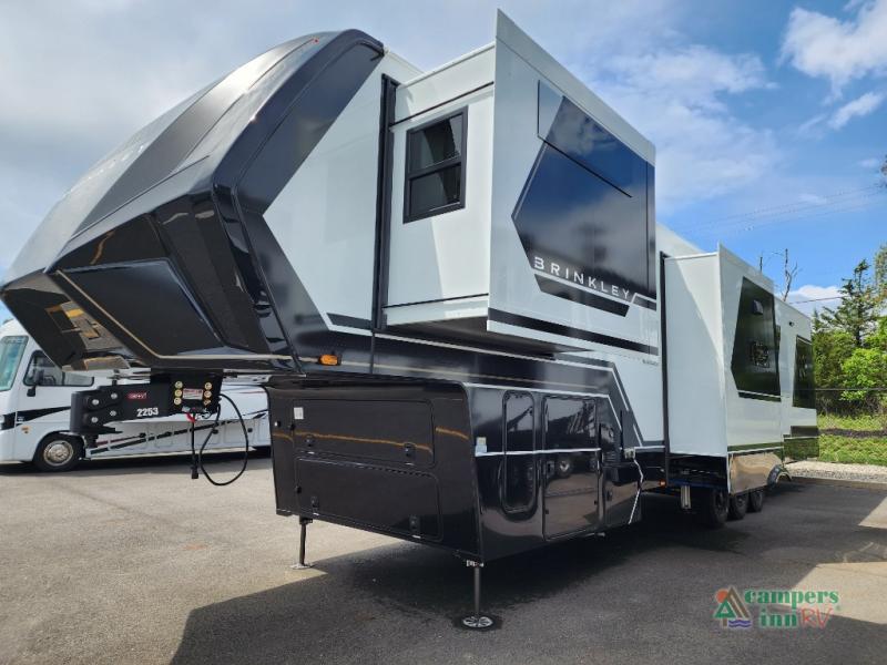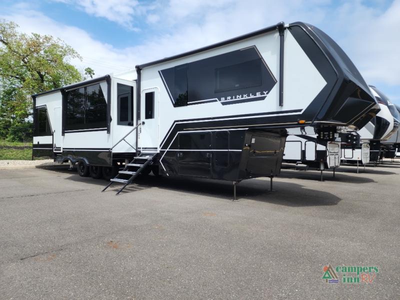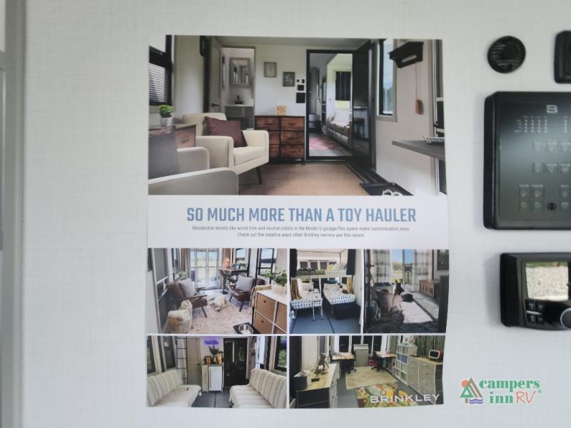 With any Model G toy hauler fifth wheel by Brinkley you will enjoy luxurious amenities, tons of storage space, and innovative features that have been developed and tested in the real world. Durable construction includes an industry leading PDI process, an industry best insulation package, and reinforced and walkable slide roofs. Some of the exterior features you'll find are a 3-way pass-through with a multi-functional flip-up bulkhead wall, under I-beam storage, a MAX-Vision reverse lighting system, and a low-maintenance roof to name a few. A Rockford Fosgate audio system comes standard, along with a OneControl app system that lets you control your fifth wheel's functions right from your mobile device. You will find the solar system with a designated storage area to be ultra convenient, plus there is a FlexPower 5500 with a dual fuel inverter generator for all your power needs. Head inside to find a residential interior with Brinkley's CraftSense wood trim construction, floating entrance steps, integrated window screens and insulated blackout blinds, and residential solid surface countertops plus backsplash. You will also enjoy the neon shower lighting and recessed medicine cabinets in the bath, plus motion activated LED bed lights and dual bedside outlets in the bedroom. Choose a Model G toy hauler fifth wheel to experience all the luxury it has to offer!