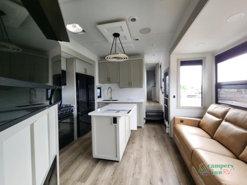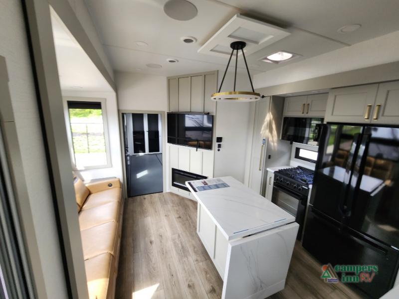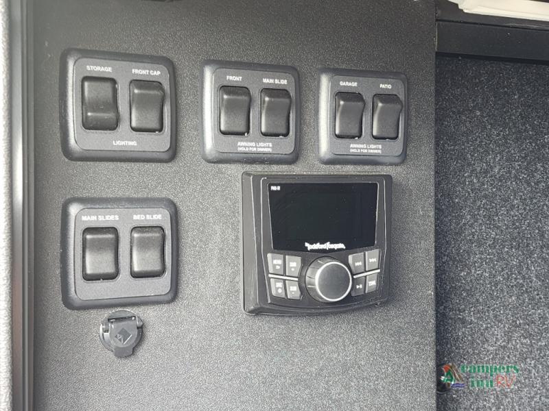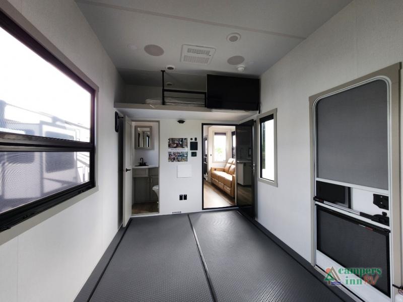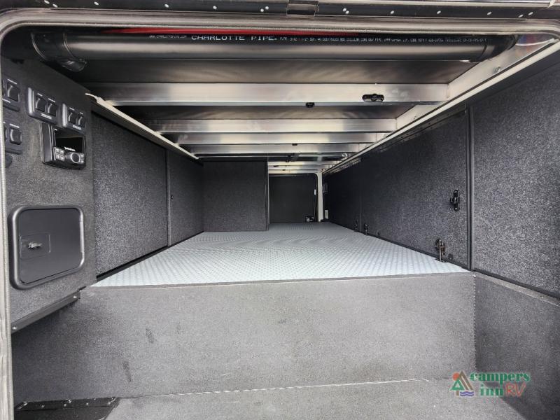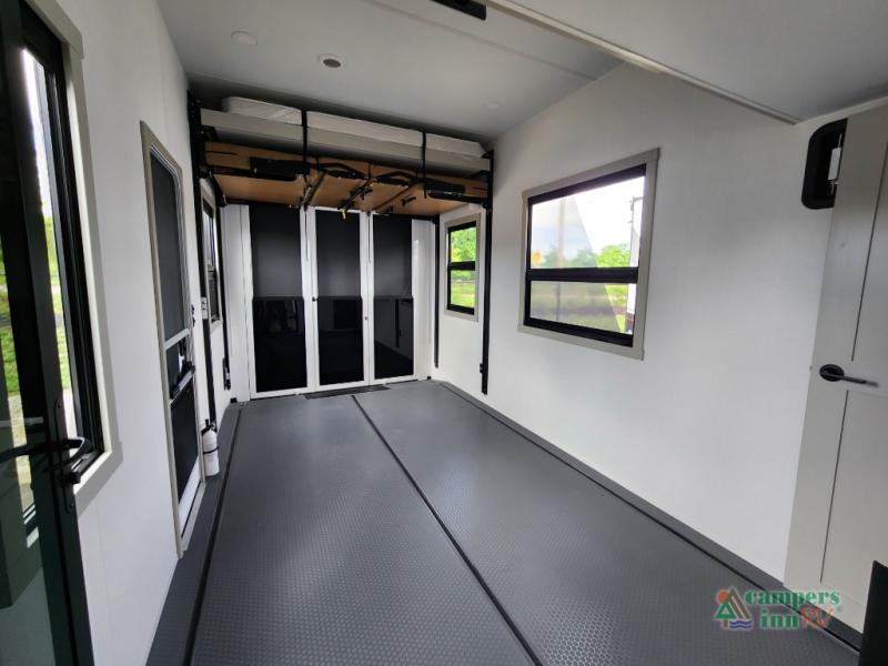 Prepare to be amazed by all the features packed into this toy hauler! There are triple slides that will provide your crew with more space, a 16' separate garage flex area that can sleep five with the loft included, plus a bath and a half for added convenience. The chef in your group will love the middle kitchen with a waterfall island that converts to a counter peninsula, a pull-out pantry, a GE Energy Star 19 cu. ft. refrigerator with ice and filtered water, and much more. In the combined kitchen and living area you'll find a spacious sofa with heat and massage, a fireplace, a TV, plus convenient dog bowls and shoe storage. After your toys are unloaded from the garage, you can relax on the independent dual couches with a Fold-N-Stow table in between. You will find the front private bedroom with a king bed slide out will provide a great night's rest, and you'll also find a walk-in closet, under-bed storage, and a sliding dresser top with hidden storage for special belongings.