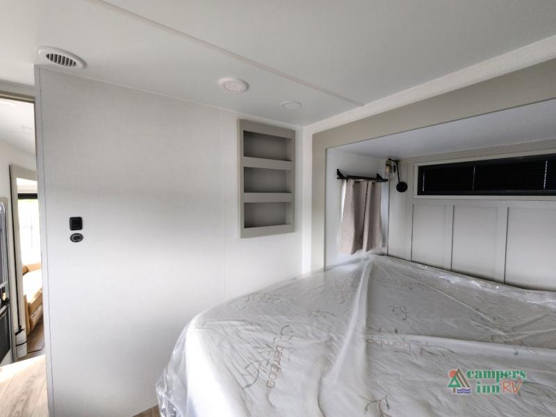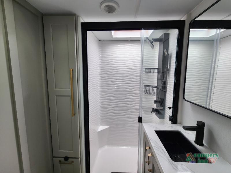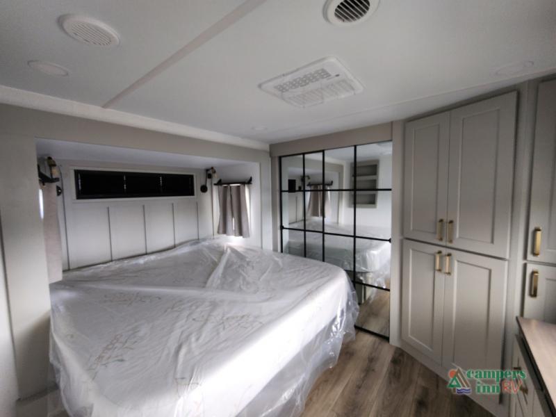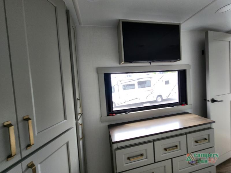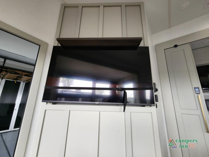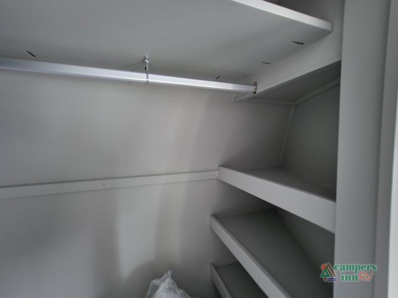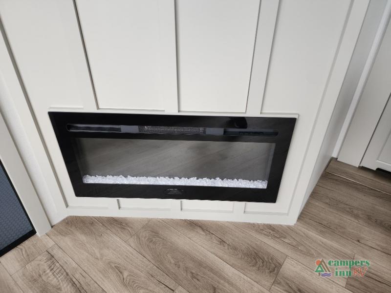 Prepare to be amazed by all the features packed into this toy hauler! There are triple slides that will provide your crew with more space, a 16' separate garage flex area that can sleep five with the loft included, plus a bath and a half for added convenience. The chef in your group will love the middle kitchen with a waterfall island that converts to a counter peninsula, a pull-out pantry, a GE Energy Star 19 cu. ft. refrigerator with ice and filtered water, and much more. In the combined kitchen and living area you'll find a spacious sofa with heat and massage, a fireplace, a TV, plus convenient dog bowls and shoe storage. After your toys are unloaded from the garage, you can relax on the independent dual couches with a Fold-N-Stow table in between. You will find the front private bedroom with a king bed slide out will provide a great night's rest, and you'll also find a walk-in closet, under-bed storage, and a sliding dresser top with hidden storage for special belongings.