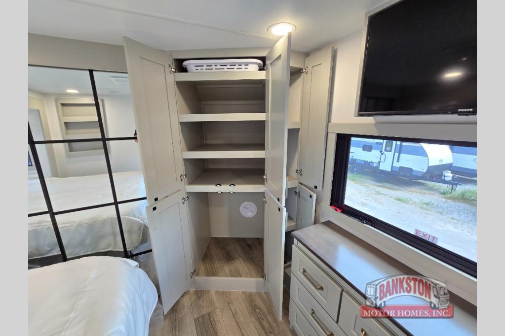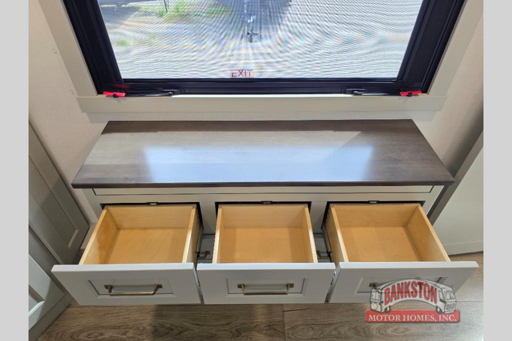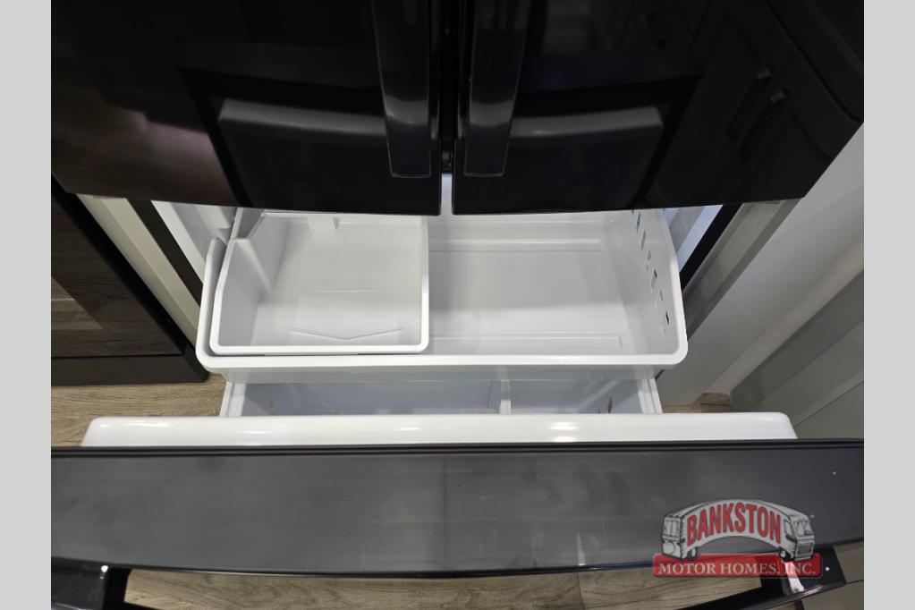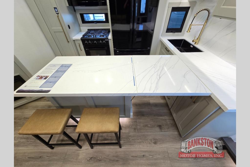 Prepare to be amazed by all the features packed into this toy hauler! There are triple slides that will provide your crew with more space, a 16' separate garage flex area that can sleep five with the loft included, plus a bath and a half for added convenience. The chef in your group will love the middle kitchen with a waterfall island that converts to a counter peninsula, a pull-out pantry, a GE Energy Star 19 cu. ft. refrigerator with ice and filtered water, and much more. In the combined kitchen and living area you'll find a spacious sofa with heat and massage, a fireplace, a TV, plus convenient dog bowls and shoe storage. After your toys are unloaded from the garage, you can relax on the independent dual couches with a Fold-N-Stow table in between. You will find the front private bedroom with a king bed slide out will provide a great night's rest, and you'll also find a walk-in closet, under-bed storage, and a sliding dresser top with hidden storage for special belongings.