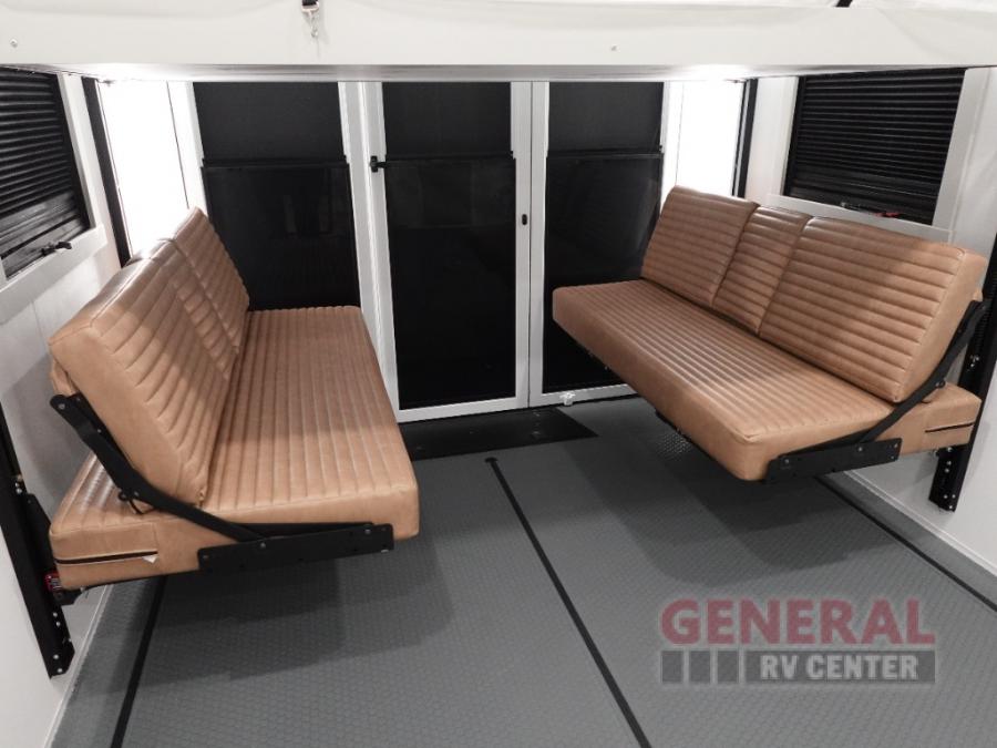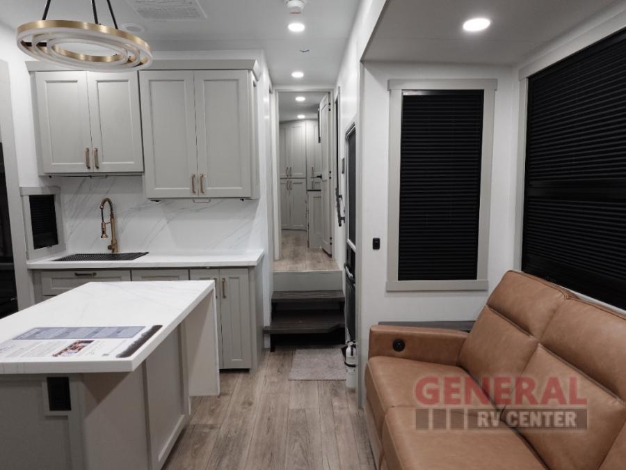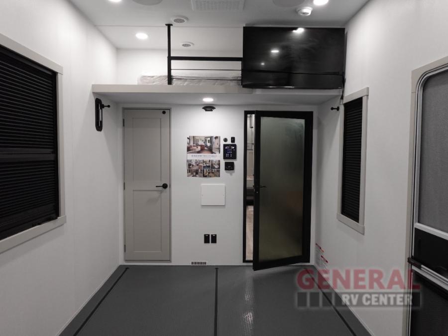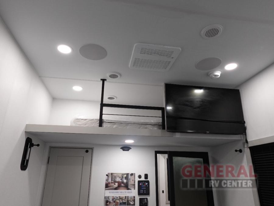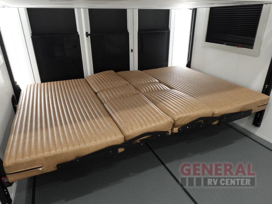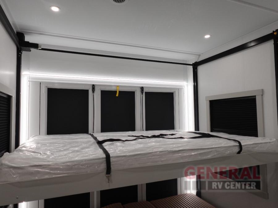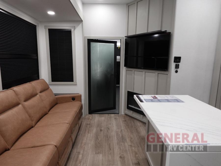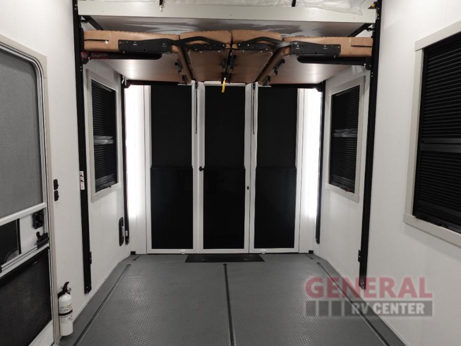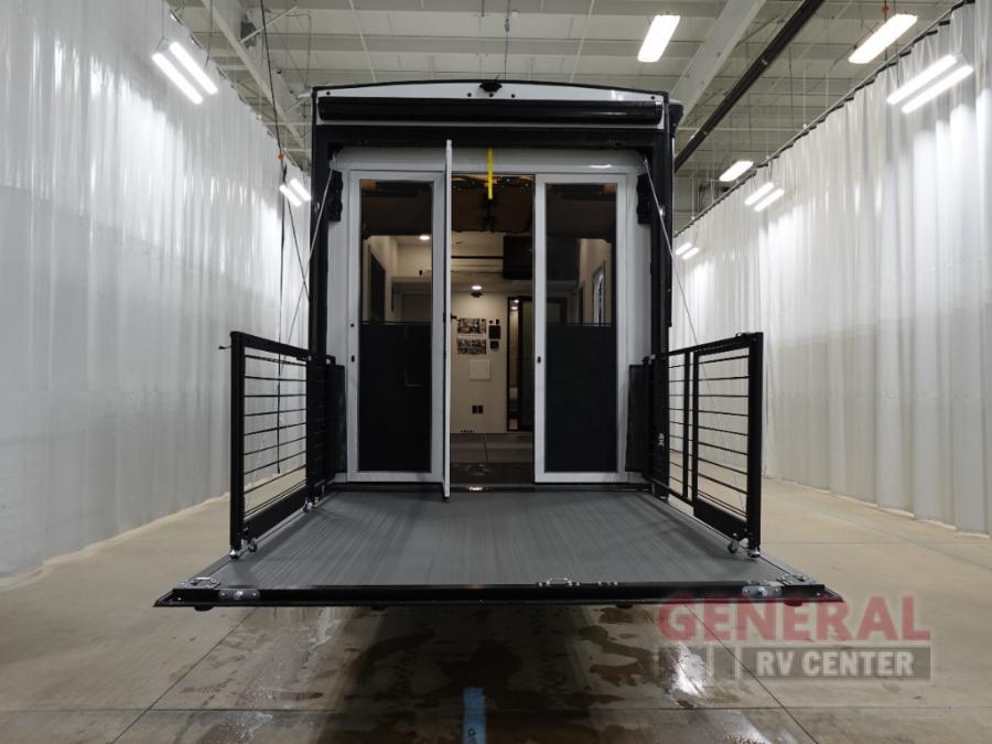 Prepare to be amazed by all the features packed into this toy hauler! There are triple slides that will provide your crew with more space, a 16' separate garage flex area that can sleep five with the loft included, plus a bath and a half for added convenience. The chef in your group will love the middle kitchen with a waterfall island that converts to a counter peninsula, a pull-out pantry, a GE Energy Star 19 cu. ft. refrigerator with ice and filtered water, and much more. In the combined kitchen and living area you'll find a spacious sofa with heat and massage, a fireplace, a TV, plus convenient dog bowls and shoe storage. After your toys are unloaded from the garage, you can relax on the independent dual couches with a Fold-N-Stow table in between. You will find the front private bedroom with a king bed slide out will provide a great night's rest, and you'll also find a walk-in closet, under-bed storage, and a sliding dresser top with hidden storage for special belongings.