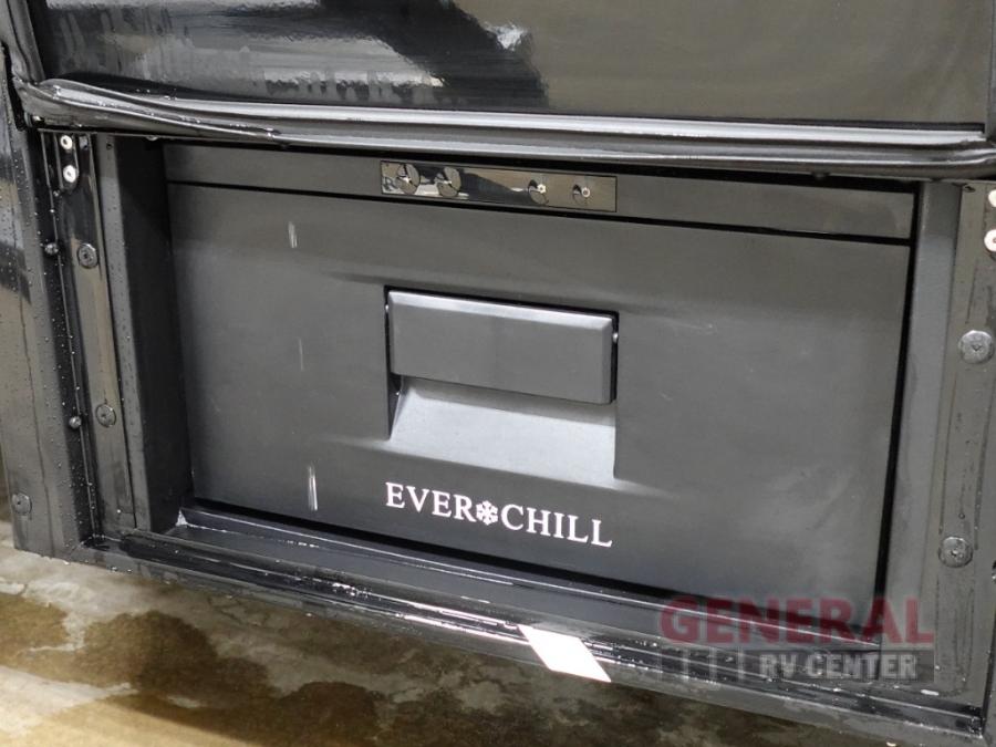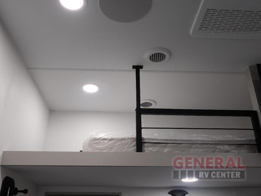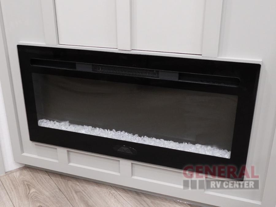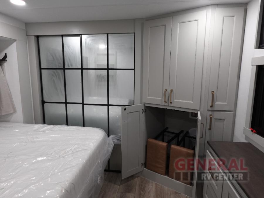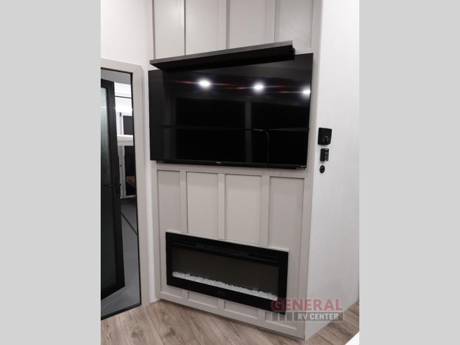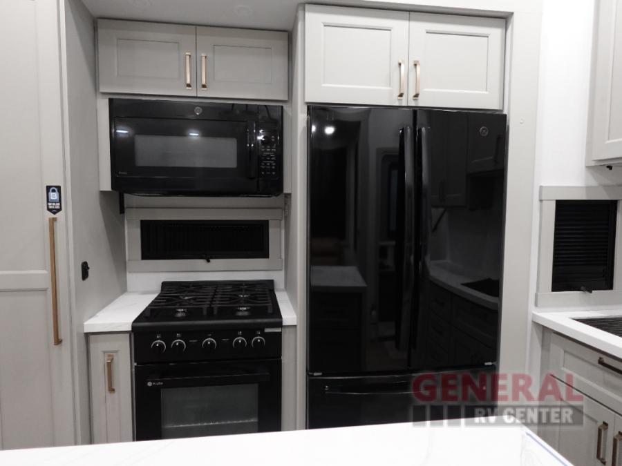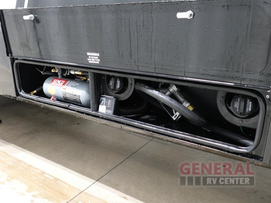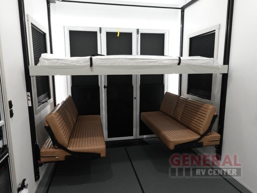 Prepare to be amazed by all the features packed into this toy hauler! There are triple slides that will provide your crew with more space, a 16' separate garage flex area that can sleep five with the loft included, plus a bath and a half for added convenience. The chef in your group will love the middle kitchen with a waterfall island that converts to a counter peninsula, a pull-out pantry, a GE Energy Star 19 cu. ft. refrigerator with ice and filtered water, and much more. In the combined kitchen and living area you'll find a spacious sofa with heat and massage, a fireplace, a TV, plus convenient dog bowls and shoe storage. After your toys are unloaded from the garage, you can relax on the independent dual couches with a Fold-N-Stow table in between. You will find the front private bedroom with a king bed slide out will provide a great night's rest, and you'll also find a walk-in closet, under-bed storage, and a sliding dresser top with hidden storage for special belongings.