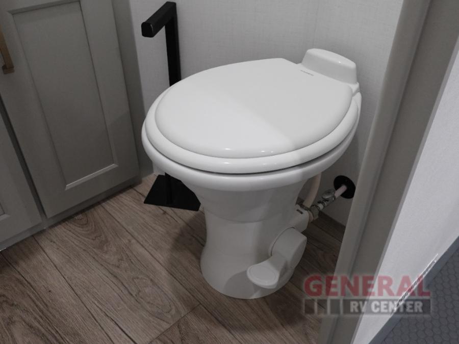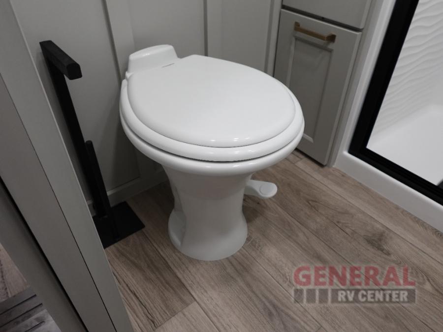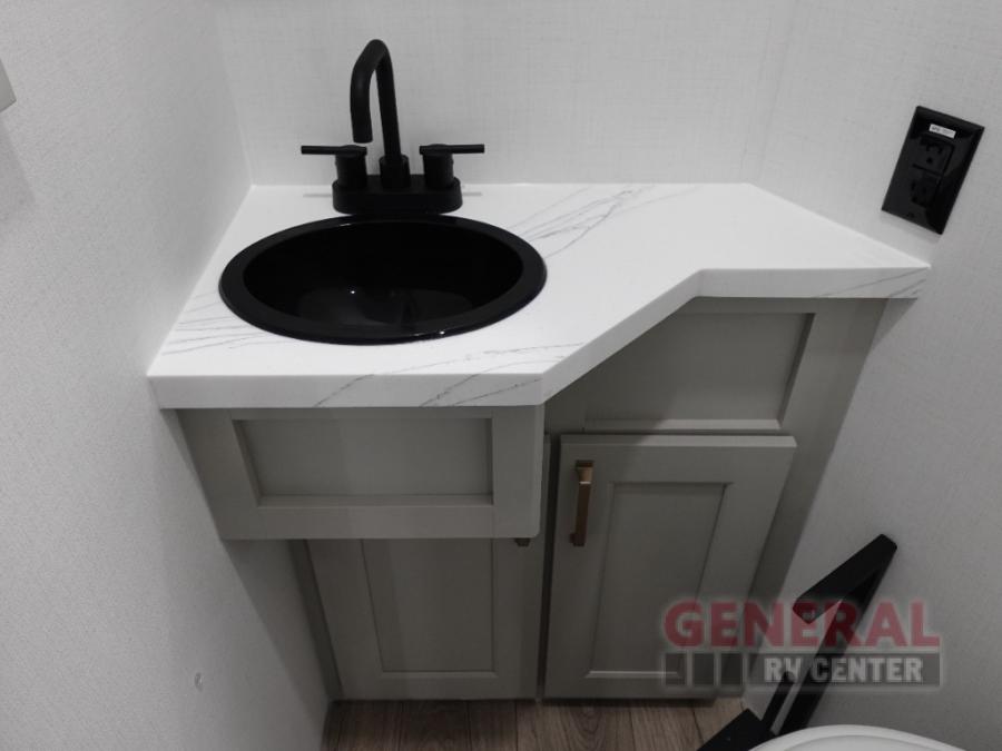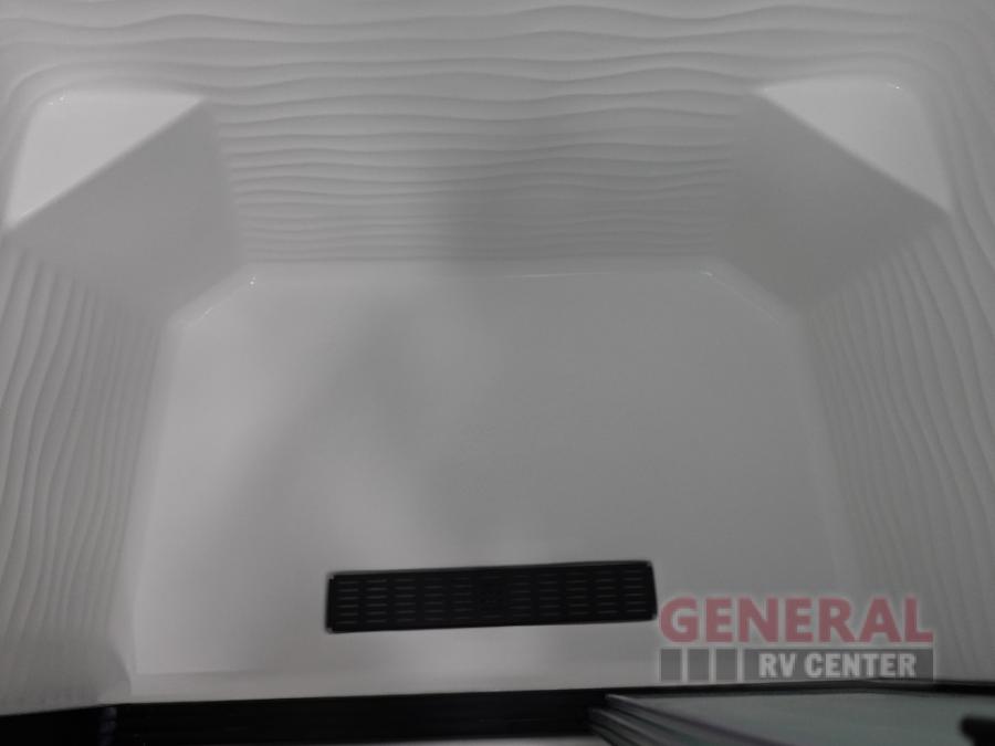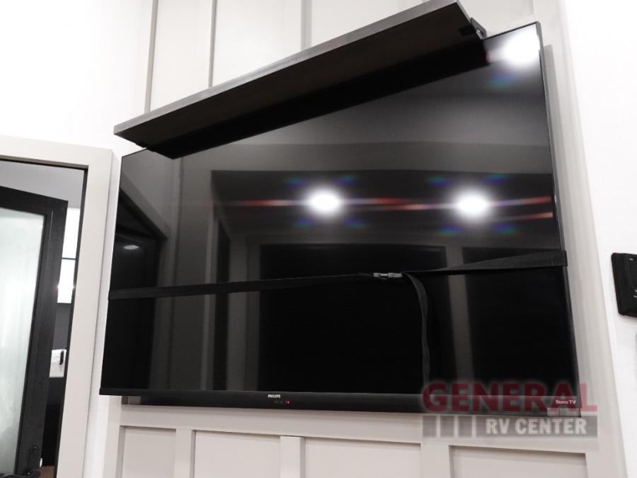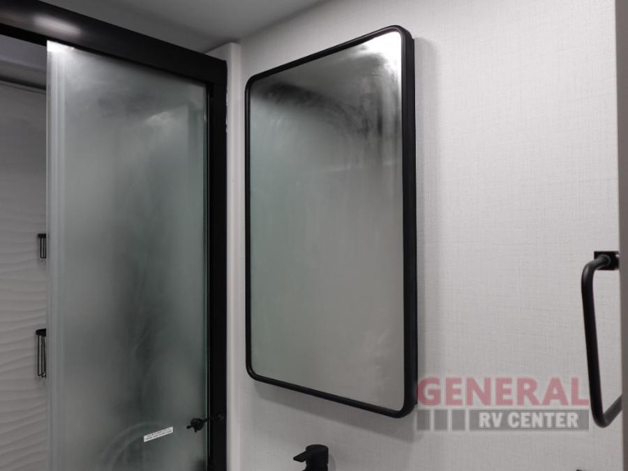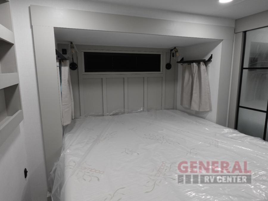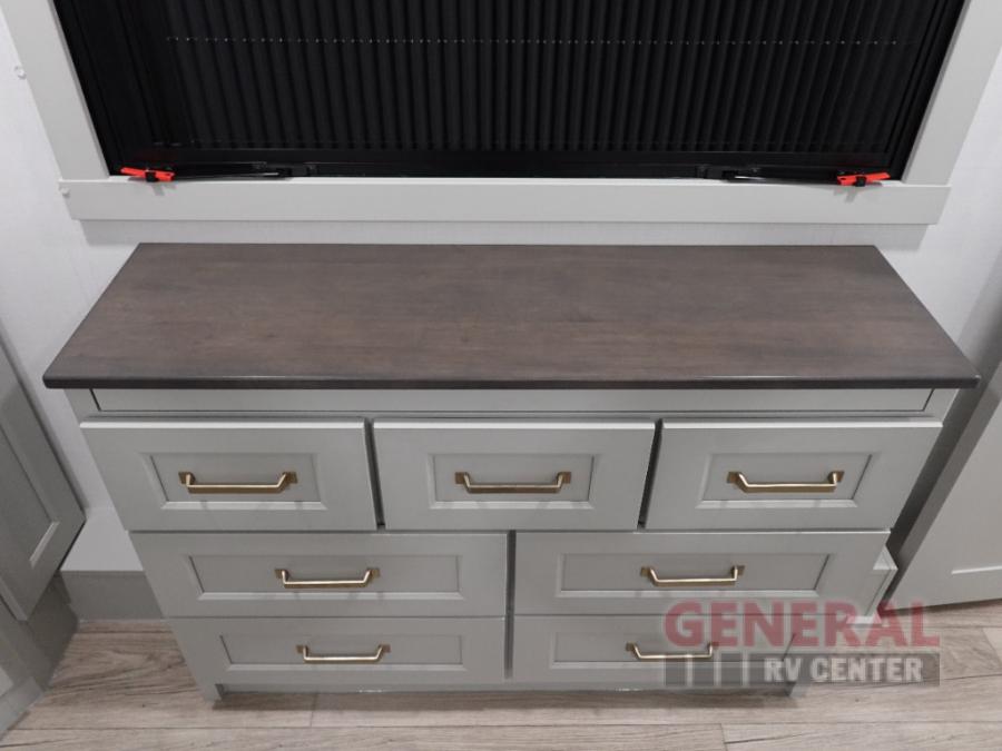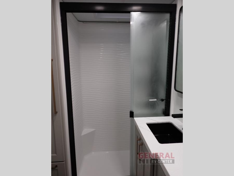 Prepare to be amazed by all the features packed into this toy hauler! There are triple slides that will provide your crew with more space, a 16' separate garage flex area that can sleep five with the loft included, plus a bath and a half for added convenience. The chef in your group will love the middle kitchen with a waterfall island that converts to a counter peninsula, a pull-out pantry, a GE Energy Star 19 cu. ft. refrigerator with ice and filtered water, and much more. In the combined kitchen and living area you'll find a spacious sofa with heat and massage, a fireplace, a TV, plus convenient dog bowls and shoe storage. After your toys are unloaded from the garage, you can relax on the independent dual couches with a Fold-N-Stow table in between. You will find the front private bedroom with a king bed slide out will provide a great night's rest, and you'll also find a walk-in closet, under-bed storage, and a sliding dresser top with hidden storage for special belongings.