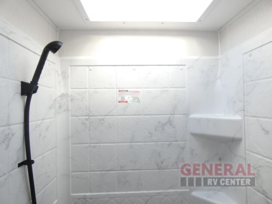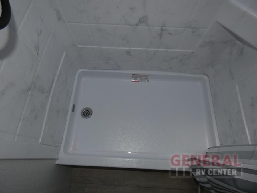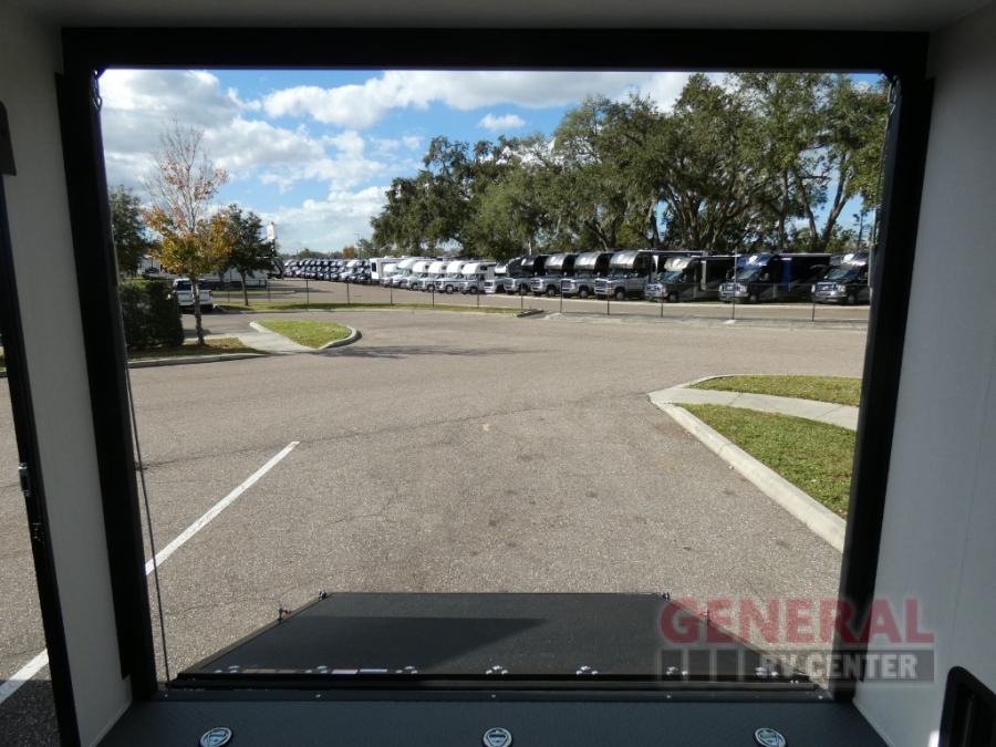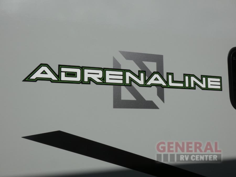 With any Adrenaline toy hauler travel trailer by Coachmen, the required Exterior Value package includes a one-piece Tufflex PVC roof membrane, a fiberglass front cap with rock guard to help against road debris, heavy duty Dexter axles with Nev-R-Adjust brakes and E-Z Lube, and aluminum wheels. Some exterior standards include a heated and enclosed underbelly, a patio ready ramp door with cables for an outdoor above ground space to enjoy, a power tongue jack for easy setup, and an outside spray port to clean off your toys. The interior standards include HD rubberized oil/gas/moisture resistant flooring in the garage area, hidden hinge cabinets and doors, a rear detachable screen, and USB charging ports in multiple locations for your electronics to mention a few.