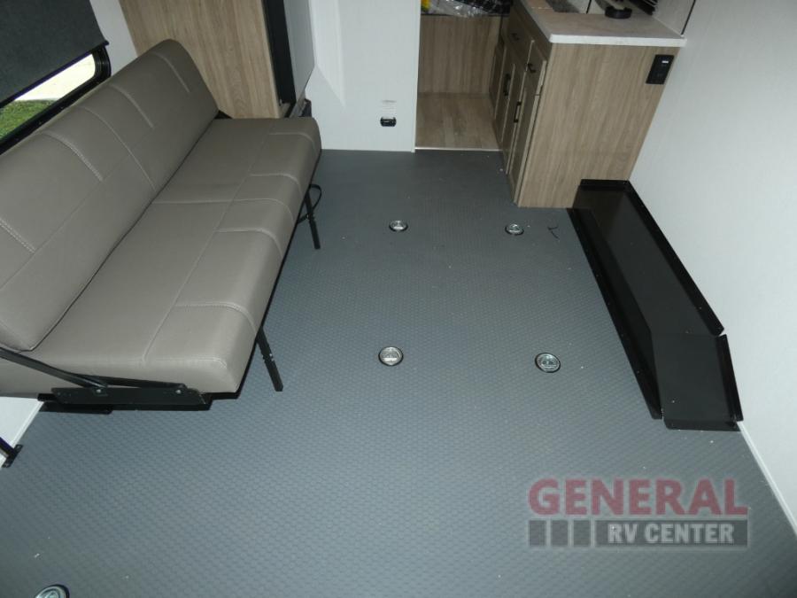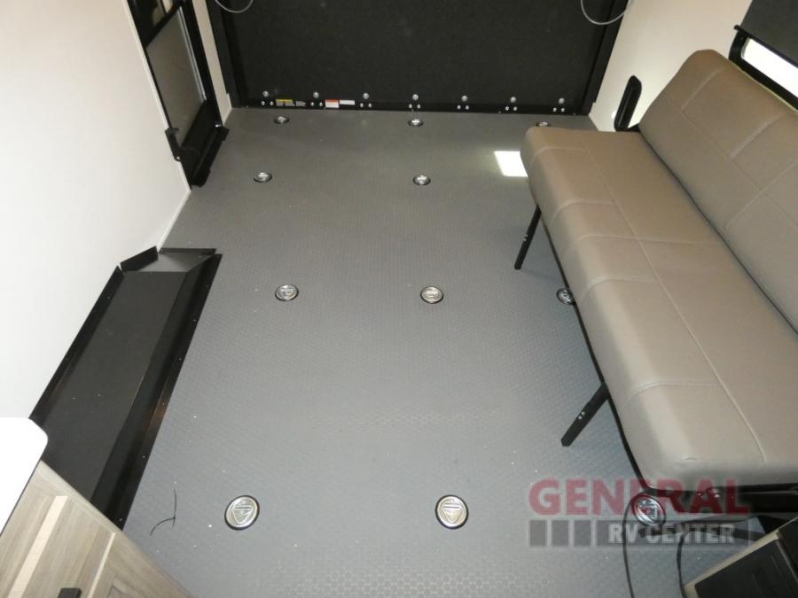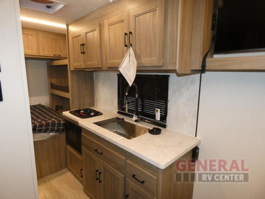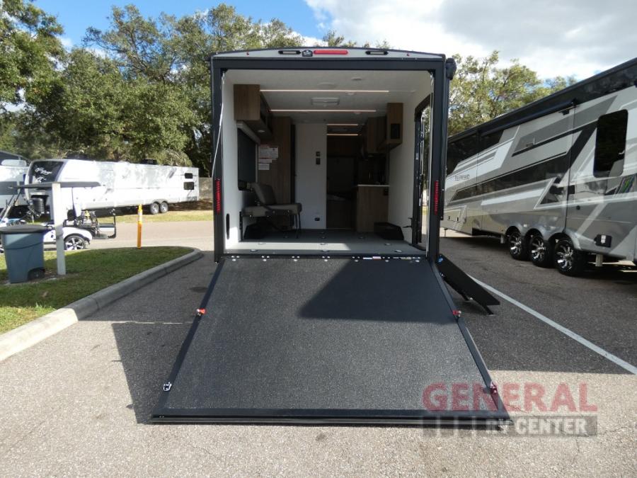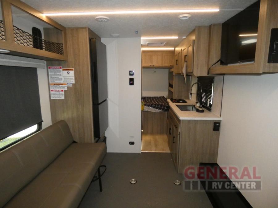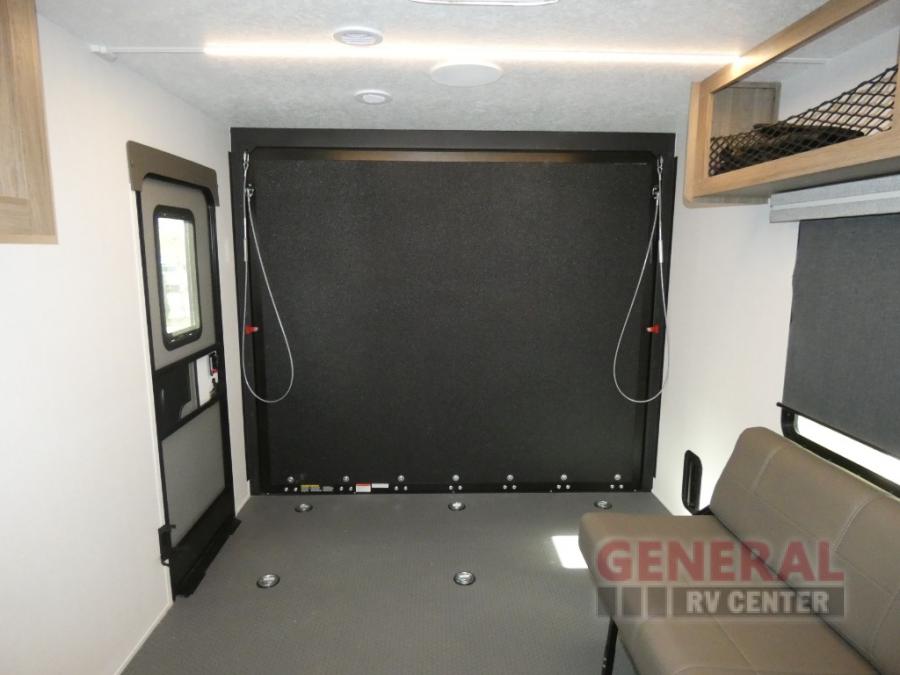 This toy hauler is perfect for three campers looking for adventure. There is 11' 7" total garage space to store your toys plus a ramp door for easy unloading. The rollover sofa with a free-standing table provides a place to dine together and let a guest sleep over. There is also an overhead shelf with a cargo net above the sofa for a smart storage space. A galley kitchen includes a two burner cooktop with a microwave below to cook meals, along with a 10 cu. ft. 12V refrigerator for food storage. You can sleep soundly each night on the 54" x 80" RV queen bed, and there is storage at the foot of the bed plus an overhead shelf for your things.