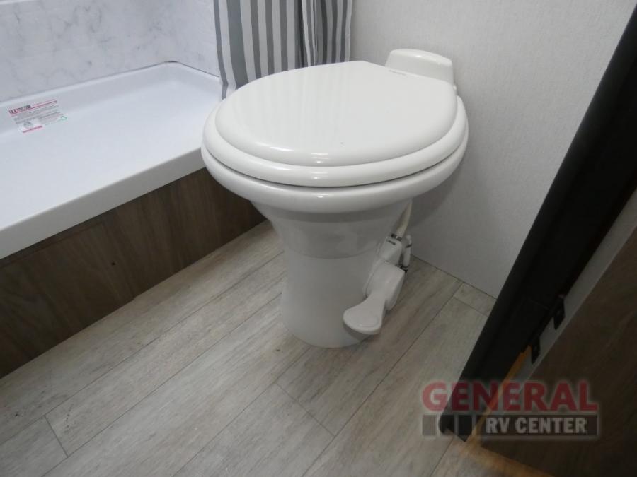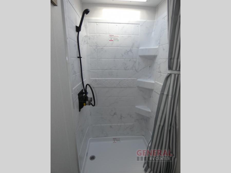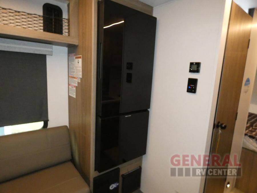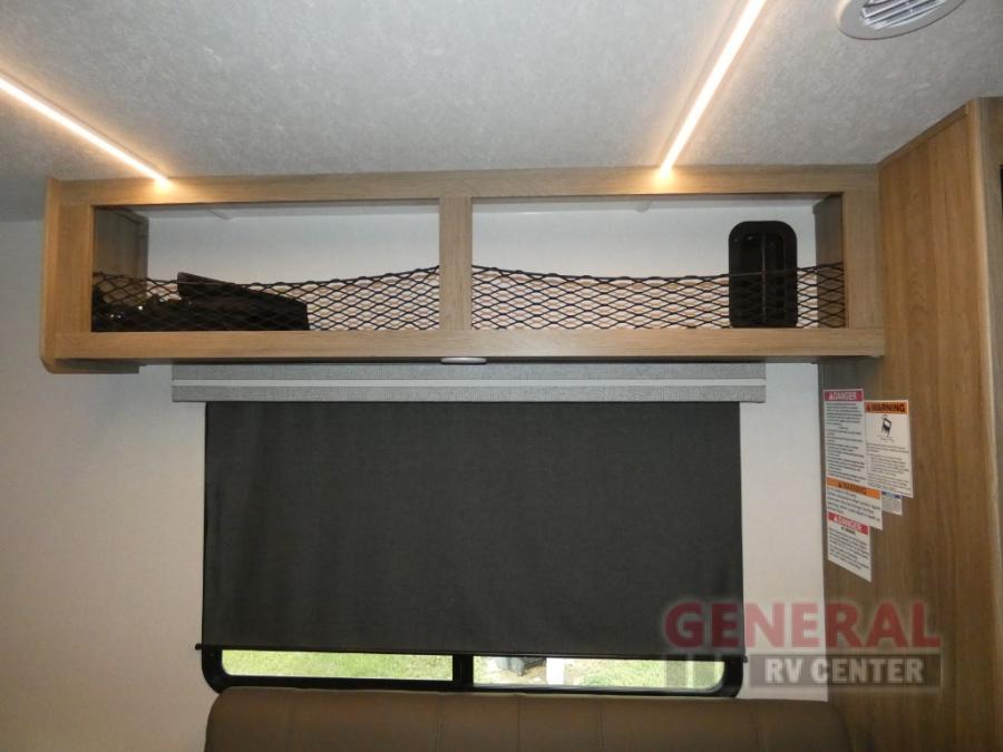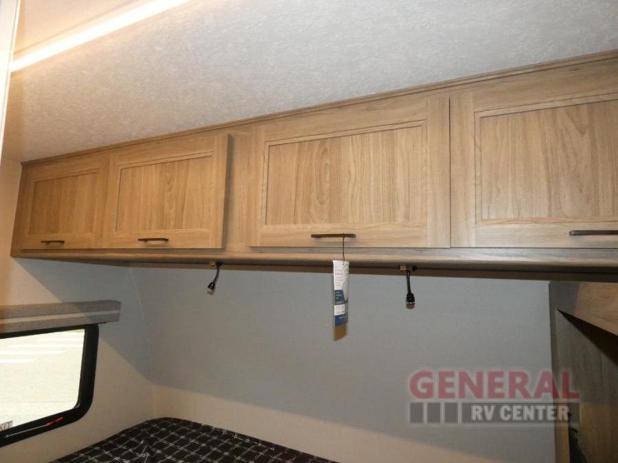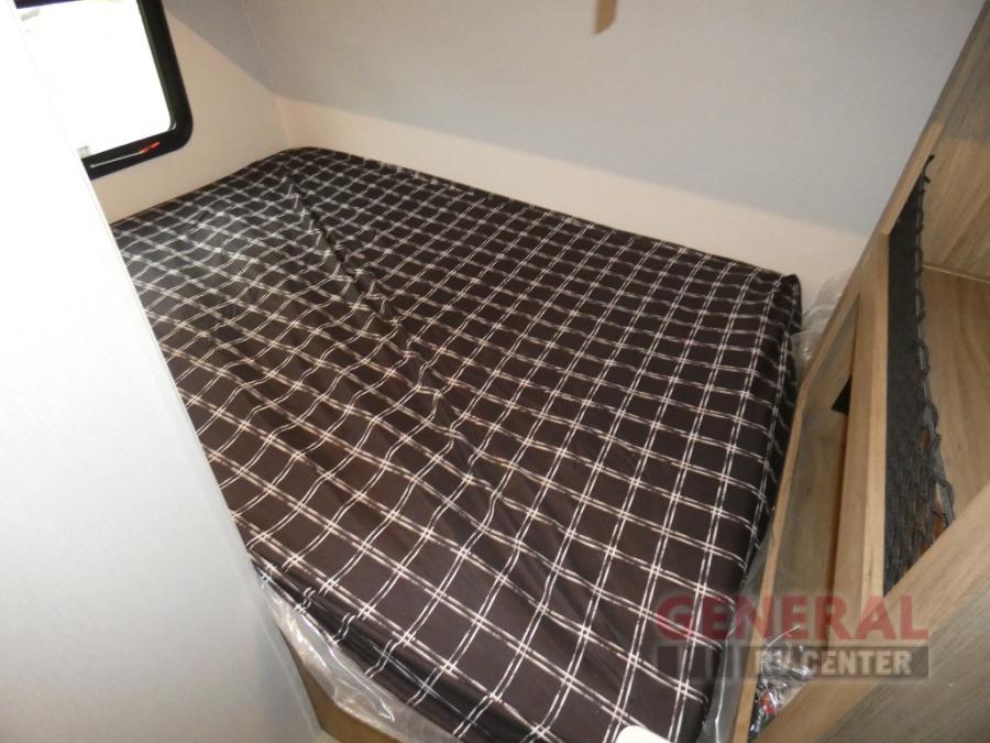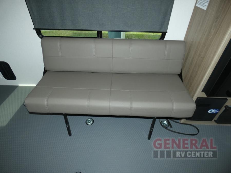 This toy hauler is perfect for three campers looking for adventure. There is 11' 7" total garage space to store your toys plus a ramp door for easy unloading. The rollover sofa with a free-standing table provides a place to dine together and let a guest sleep over. There is also an overhead shelf with a cargo net above the sofa for a smart storage space. A galley kitchen includes a two burner cooktop with a microwave below to cook meals, along with a 10 cu. ft. 12V refrigerator for food storage. You can sleep soundly each night on the 54" x 80" RV queen bed, and there is storage at the foot of the bed plus an overhead shelf for your things.