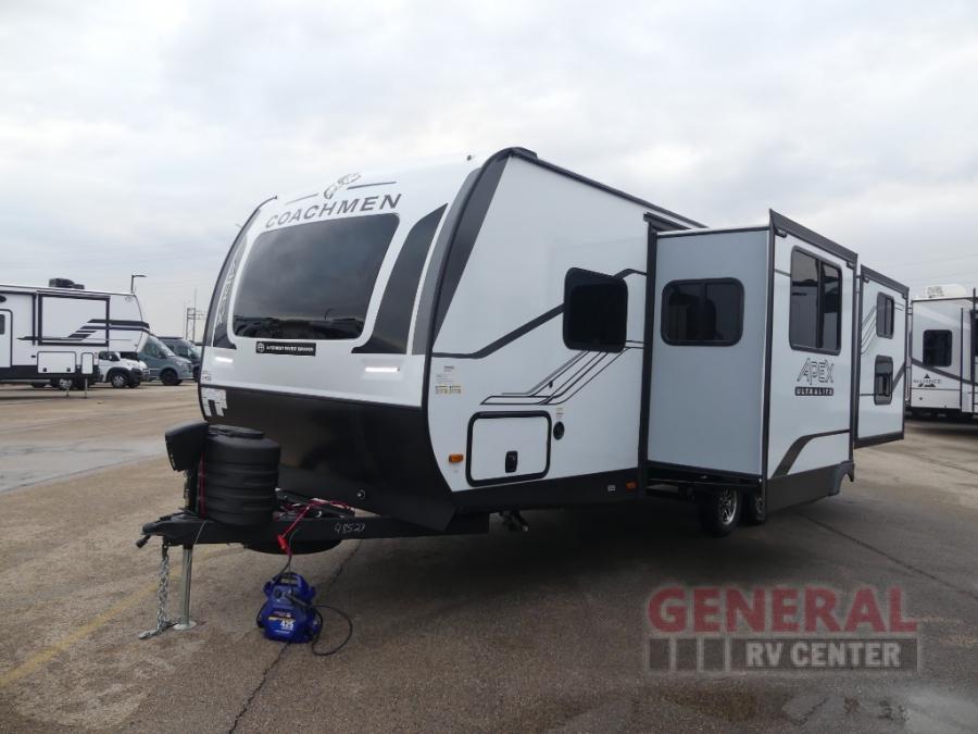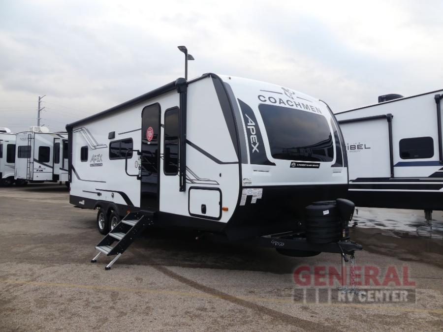 Lightweight living and camping is found with the Apex Ultra-Lite travel trailers by Coachmen. These eco-friendly units are made to last thanks to the Azdel composite sidewalls, the laminated aluminum floor, and the vacuum-bonded laminated crowned roof. Easy lube axles make towing easier than ever, plus there is a friction hinge entrance door, a 200-watt solar panel with a 30 Amp control charger, and slam latch baggage door catches for easy unloading. Some of the interior comforts you'll fall in love with are the one-piece seamless edge countertops, the hard valances with night shades, the matte black hardware, and the Casino Bisque cabinetry. The Apex Ultra-Lite trailers also include a USB charge station, plus a digital TV antenna with cable hook-ups and Wi-Fi capability for the option to stay connected as you camp!