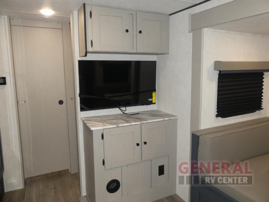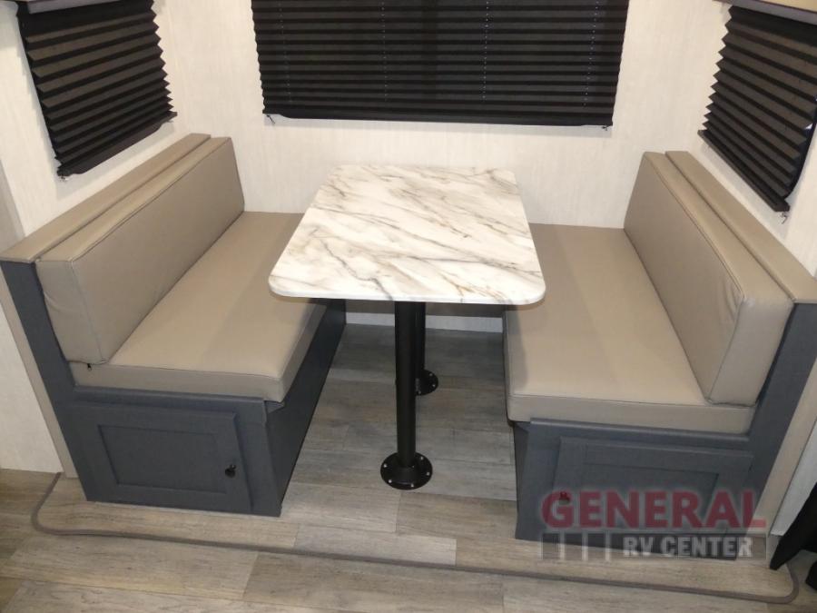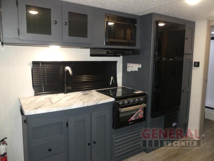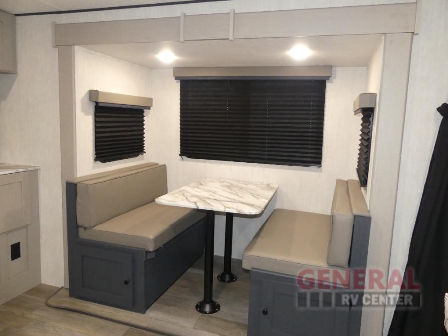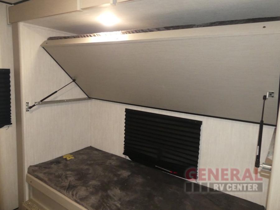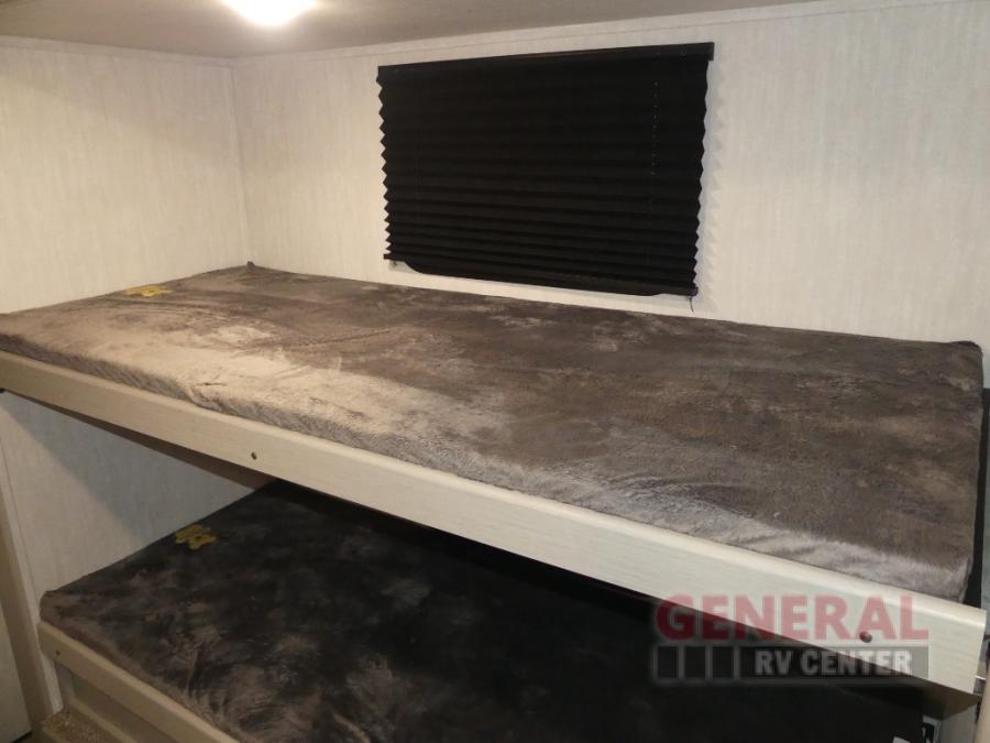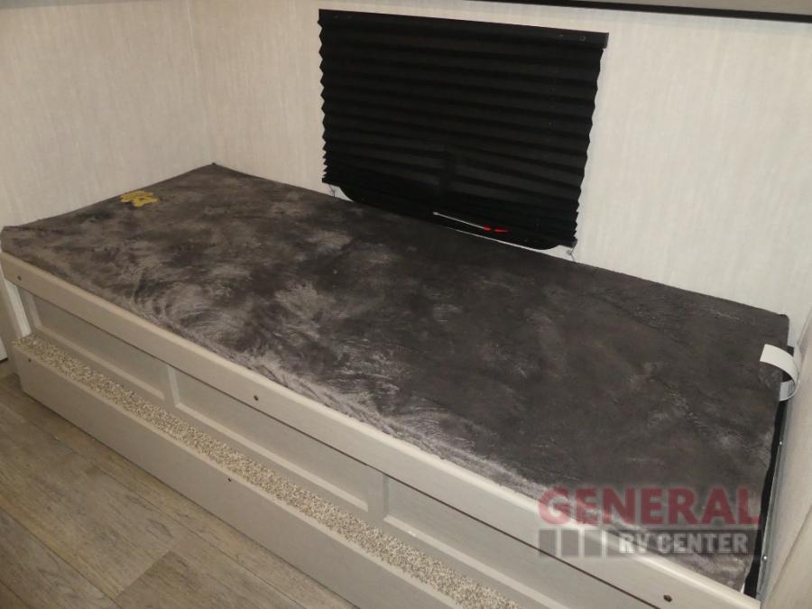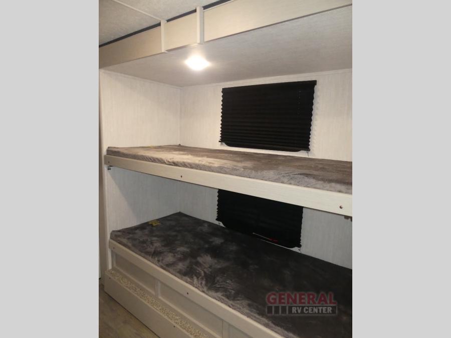 The whole gang will love weekend stays at the campground in this double slide out trailer! The little ones or your guests can take the rear corner bunkhouse that includes flip-up bunks. You'll have the queen bed with super storage up front all to yourselves, and the dual wardrobes plus overhead cabinet will help keep your space tidy. The chef of your group will have a three burner cooktop and an air fryer to cook meals, and there is a booth dinette with a table for dining space. In the evening, you can stay in to watch a movie LED Smart TV, or head outdoors to relax under the power awning.