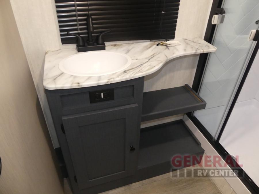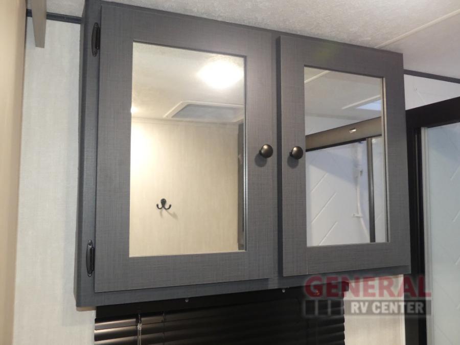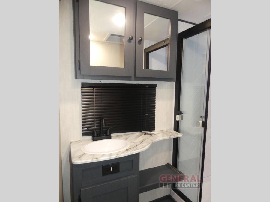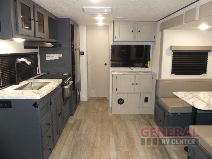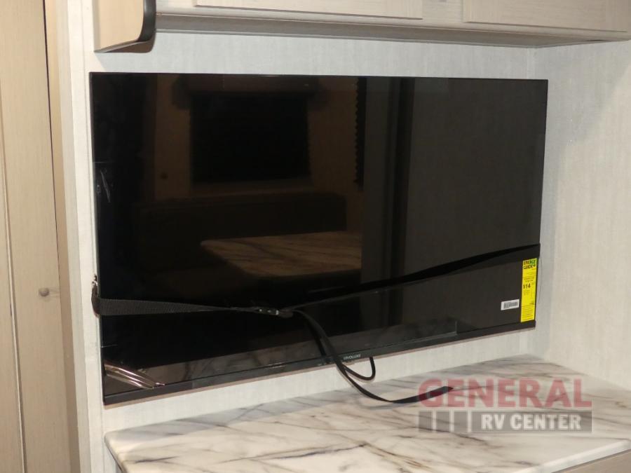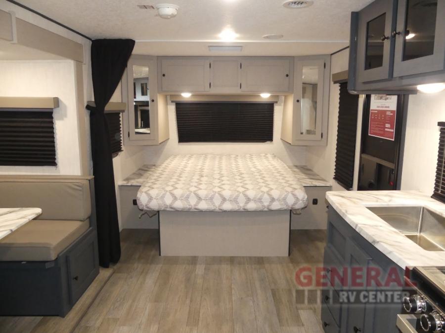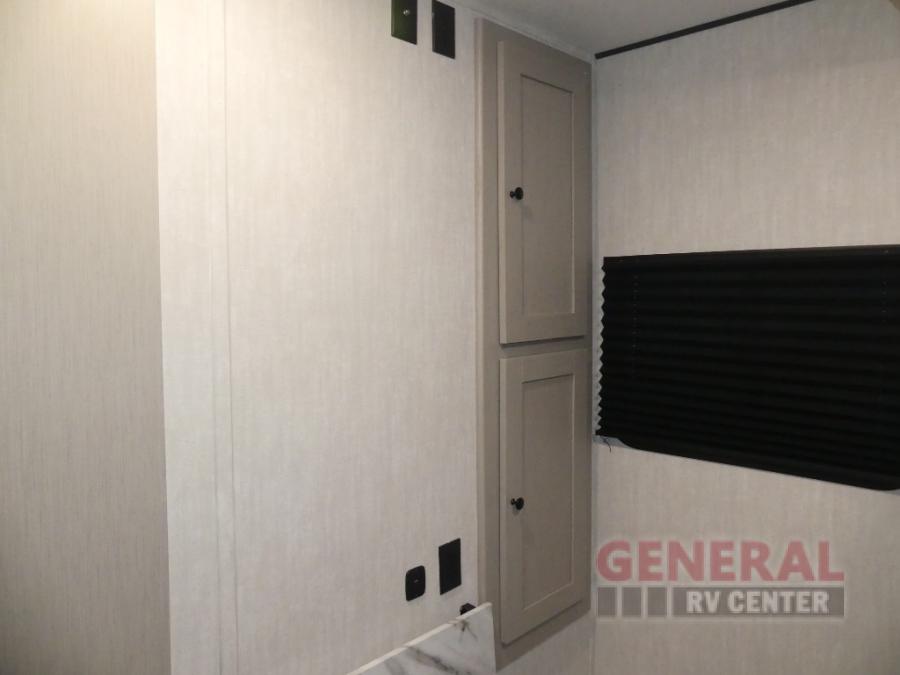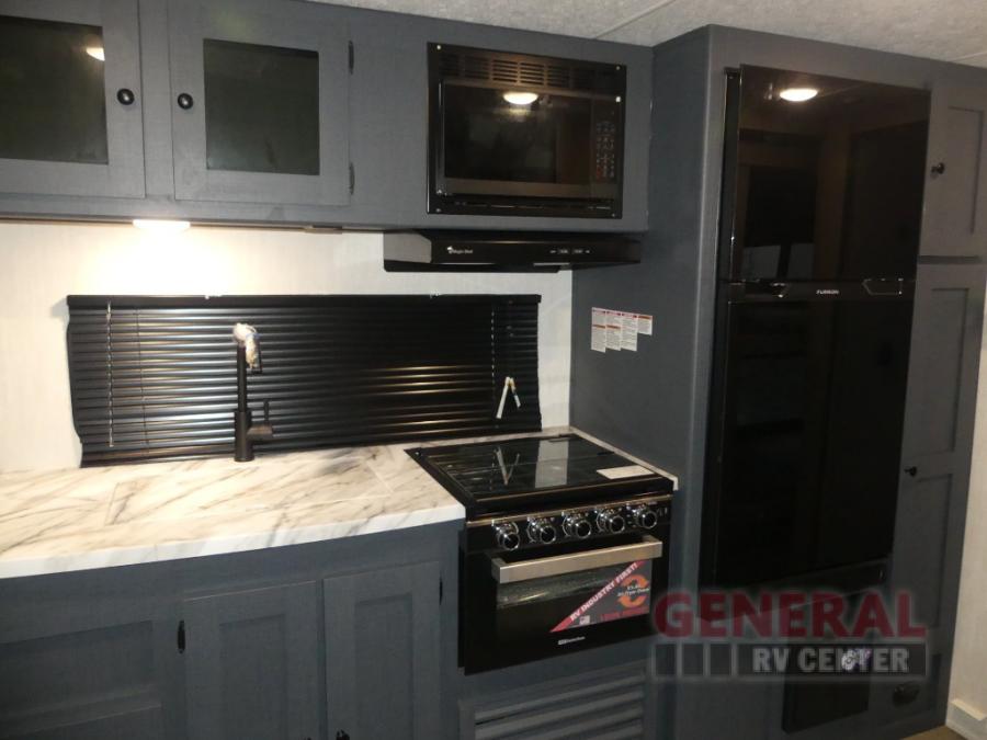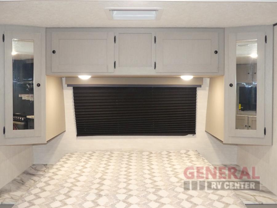 The whole gang will love weekend stays at the campground in this double slide out trailer! The little ones or your guests can take the rear corner bunkhouse that includes flip-up bunks. You'll have the queen bed with super storage up front all to yourselves, and the dual wardrobes plus overhead cabinet will help keep your space tidy. The chef of your group will have a three burner cooktop and an air fryer to cook meals, and there is a booth dinette with a table for dining space. In the evening, you can stay in to watch a movie LED Smart TV, or head outdoors to relax under the power awning.