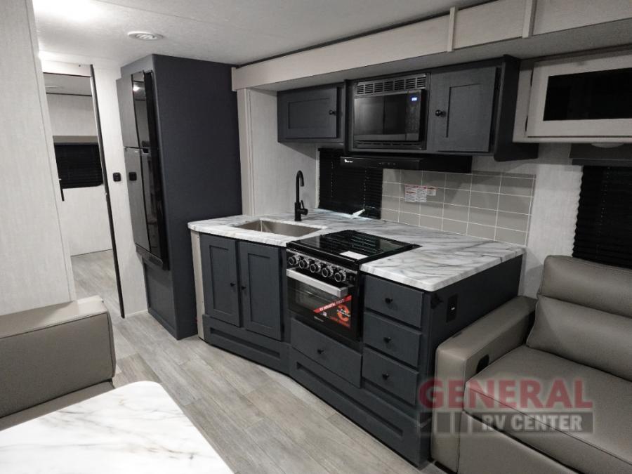 Double slides, a bunkhouse, plus a private bedroom and sleeping for nine make this model ready for anything! There is a private bunkhouse with a slide out futon and an overhead bunk, plus a second bunk for the kids to enjoy. Up front, a queen bed with super storage will provide two a comfortable night's rest in a private bedroom, and any other guests can sleep on the booth dinette and sofa in the main living area. The chef can cook indoors, or outdoors on the outside kitchen, and since there is an 18' power awning with LED lights, you can enjoy a bit of outdoor living space as well!