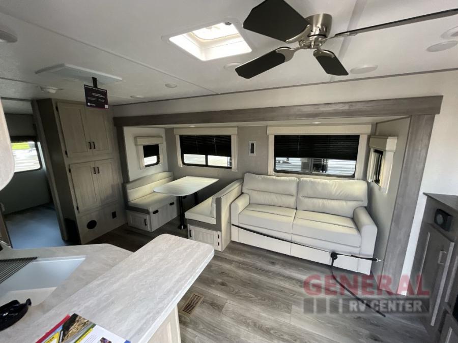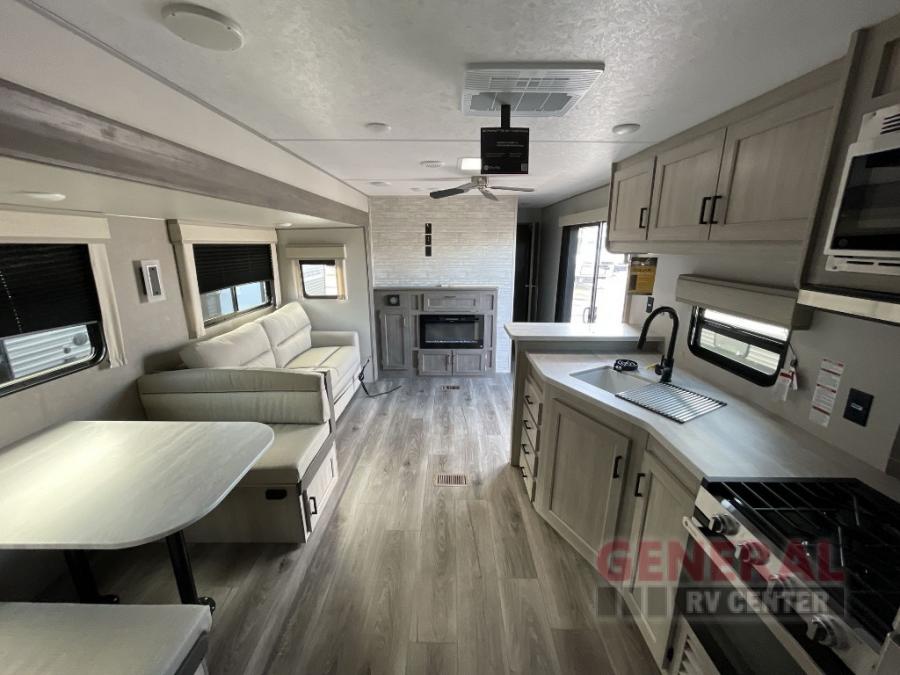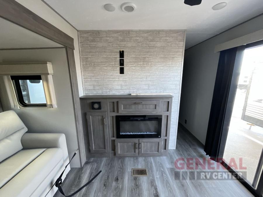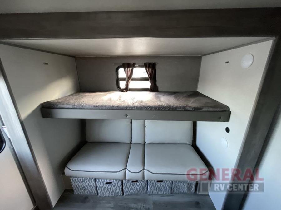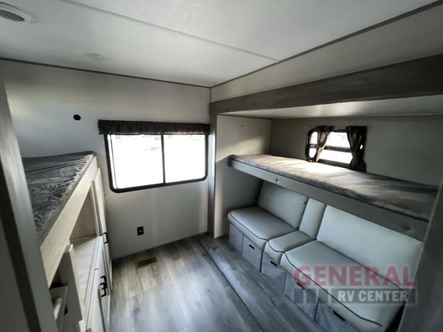 This is the perfect trailer to enjoy long vacations with friends and family. The rear bunkhouse includes a jackknife sofa and flip-up bunk within a slide out, plus storage totes beneath the sofa and a loft bed/bunk across the room. When you want to do a little entertaining, the main living area will be the perfect spot to do so with its tri-fold sofa, booth dinette, and entertainment center with a fireplace. The private front bedroom with its own exterior entry door features a queen bed slide out as a nice retreat, and with a separate entry door you can easily slip out for late-night star gazing or an early morning walk.