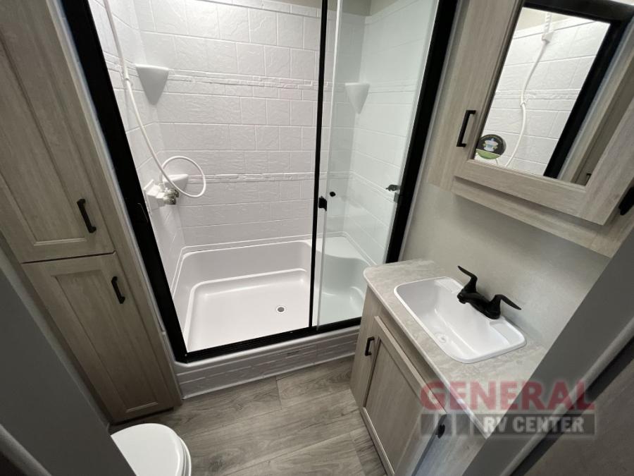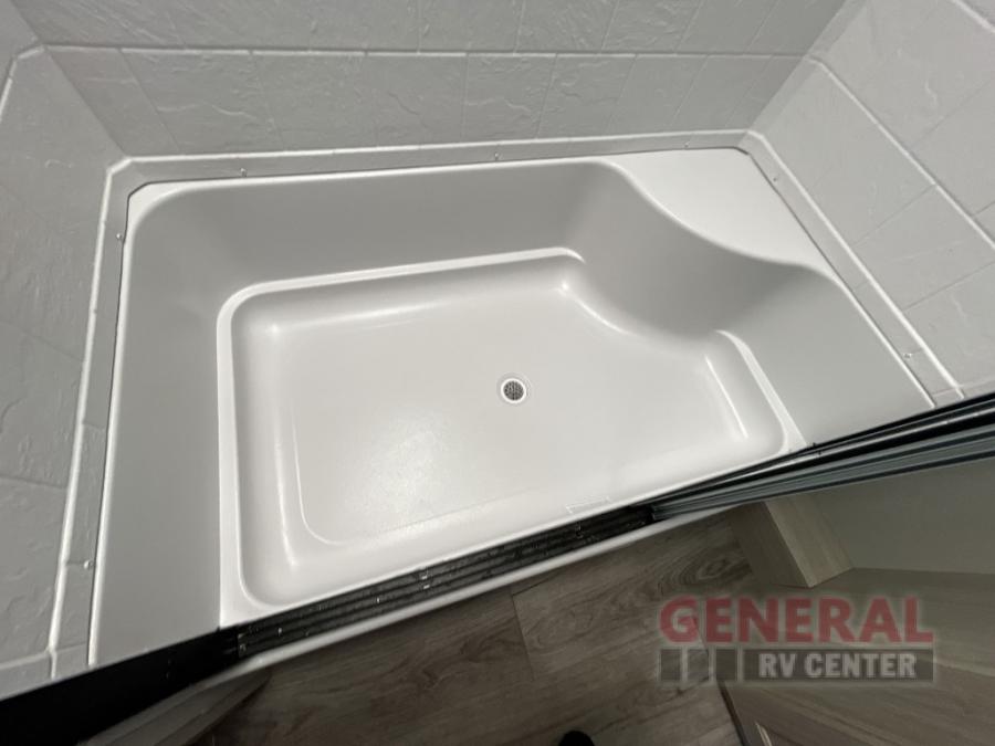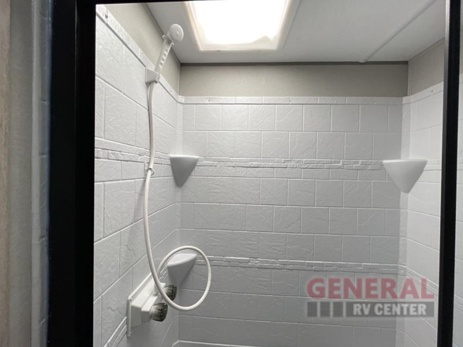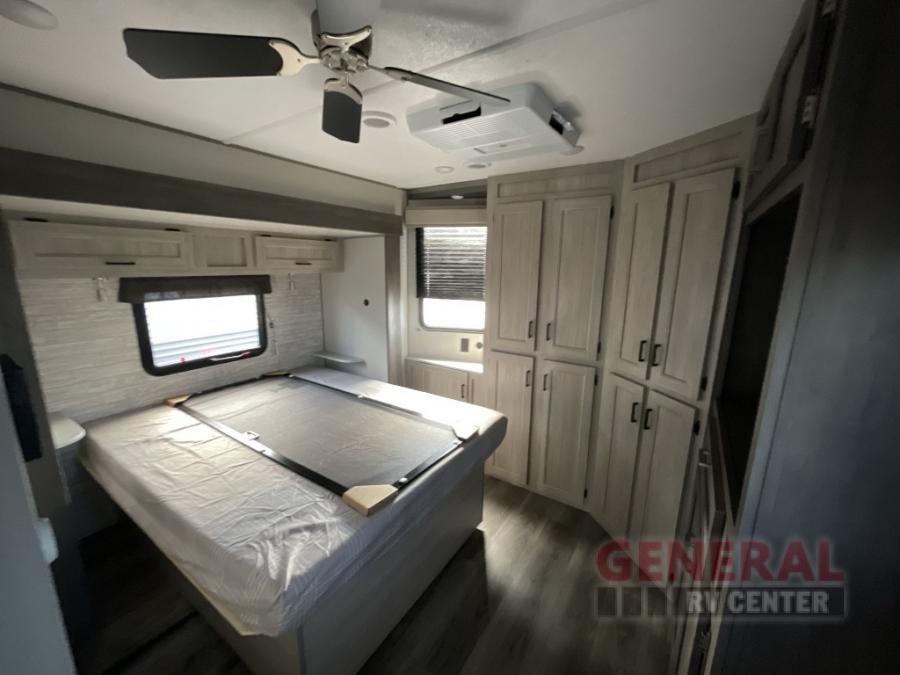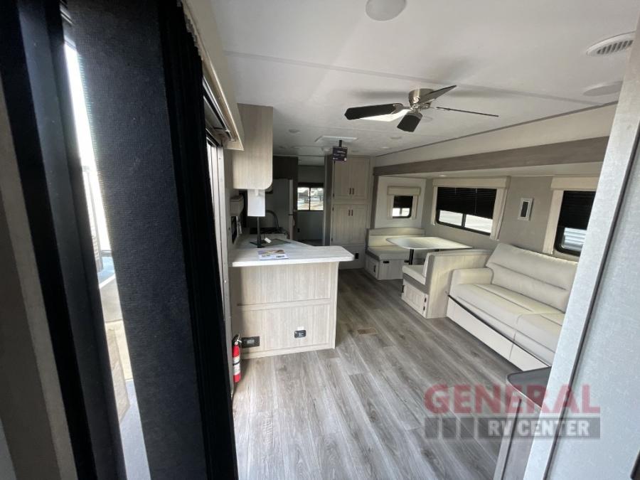 This is the perfect trailer to enjoy long vacations with friends and family. The rear bunkhouse includes a jackknife sofa and flip-up bunk within a slide out, plus storage totes beneath the sofa and a loft bed/bunk across the room. When you want to do a little entertaining, the main living area will be the perfect spot to do so with its tri-fold sofa, booth dinette, and entertainment center with a fireplace. The private front bedroom with its own exterior entry door features a queen bed slide out as a nice retreat, and with a separate entry door you can easily slip out for late-night star gazing or an early morning walk.