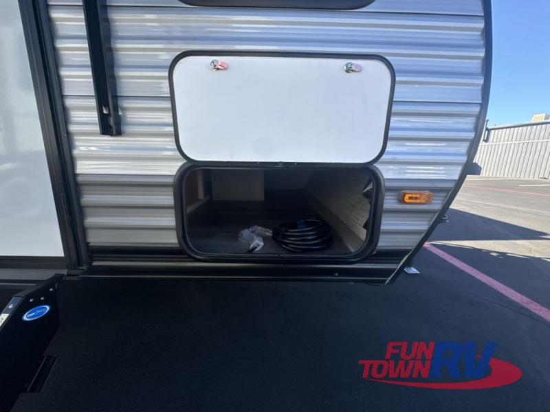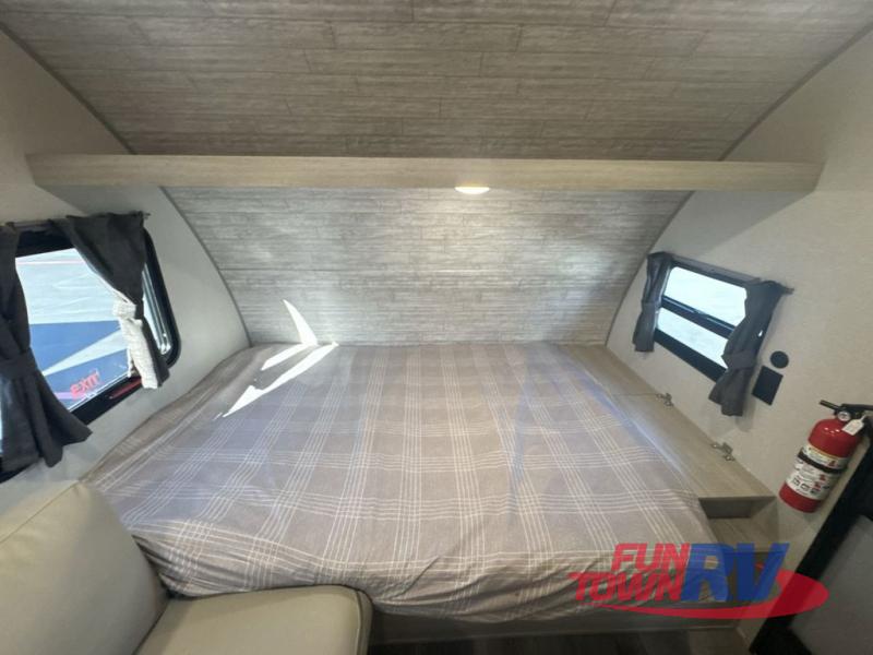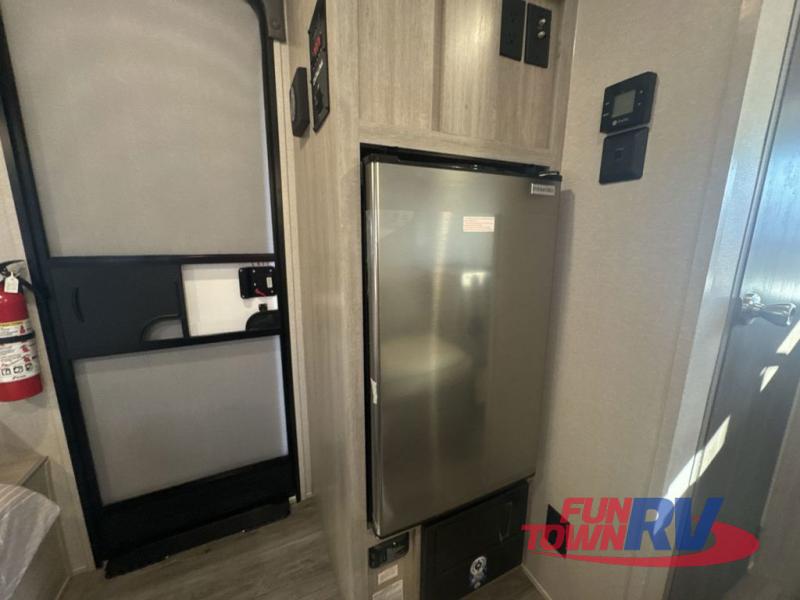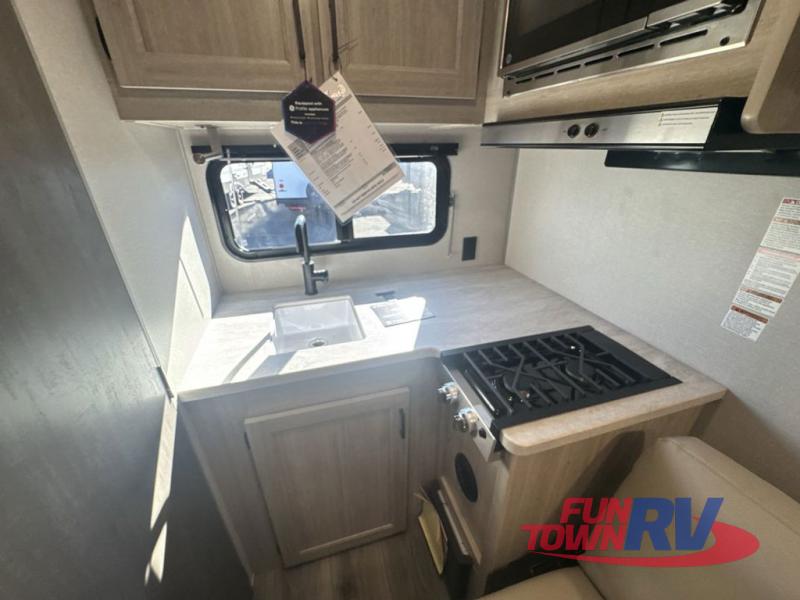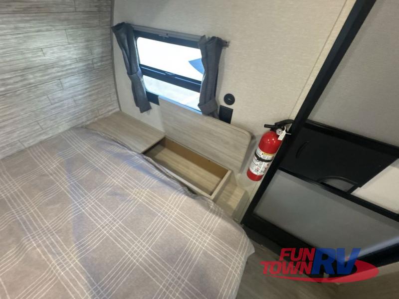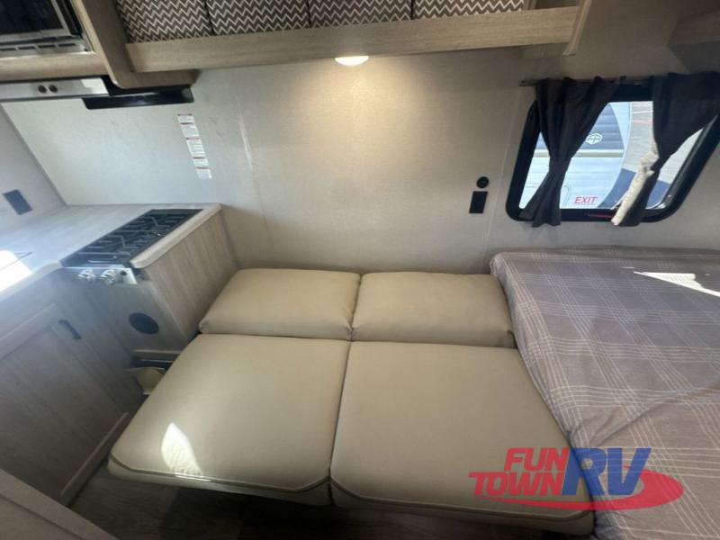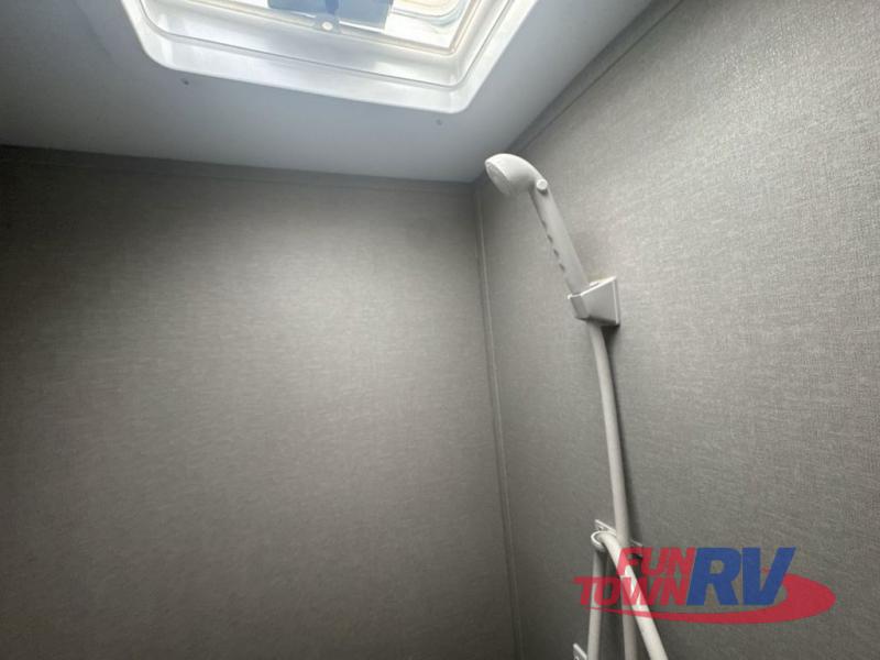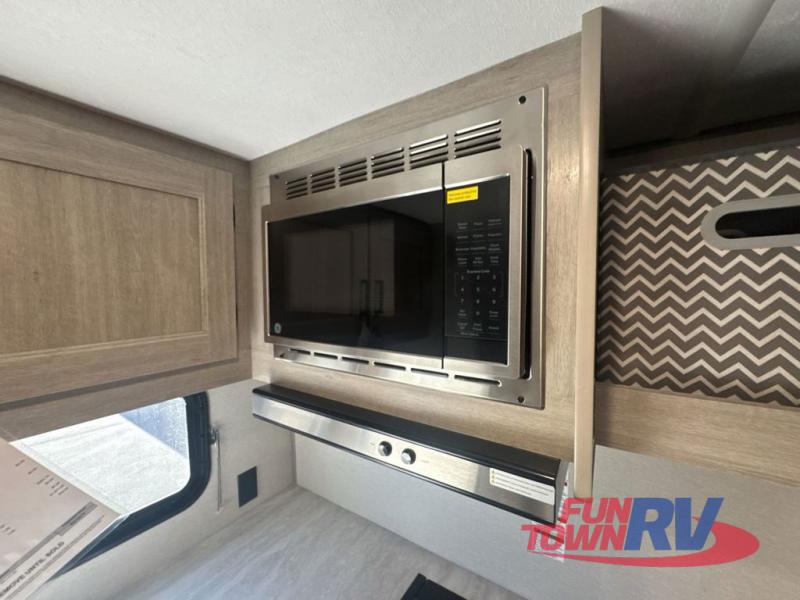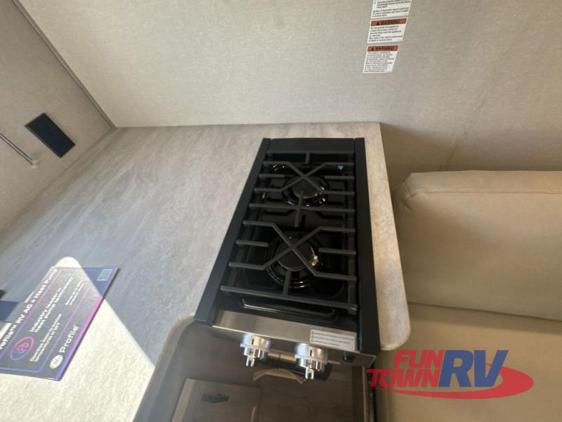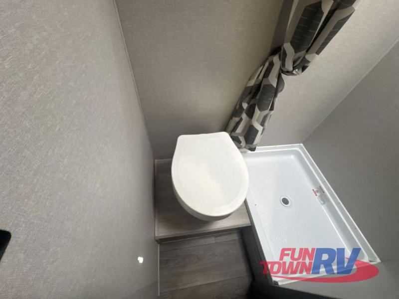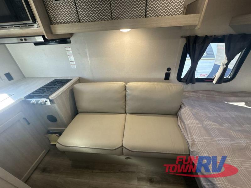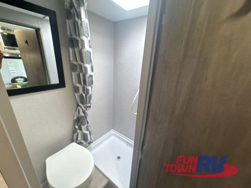 Lightweight camping is easier than you think with this travel trailer in tow! The front 54" x 74" queen bed will provide a great night's rest each night, while your overnight guest takes the 60" Jack knife sofa. There is a handy shelf above the front bed for your belongings plus a shelf with bins over the sofa. A private bath includes a 24" x 32" shower and a toilet with a mirror behind it so you can freshen up each day. You'll also find a two burner cooktop and microwave oven to make meals each day plus a 3.3 cu. ft. 12V refrigerator for food storage!