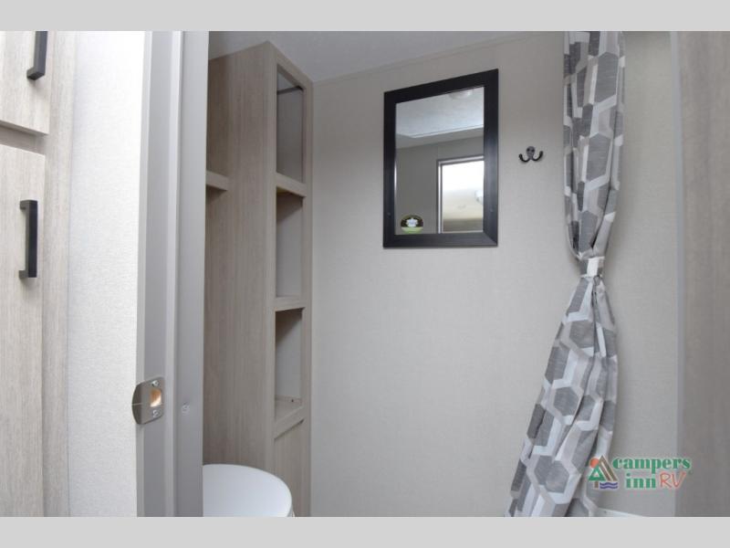 - Full Rear Bath: The 36" x 30" shower, 12V 14" power vent fan, and marine toilet with foot flush in the rear bath offer a private, comfortable space to freshen up. The linen closet keeps your towels close at hand.