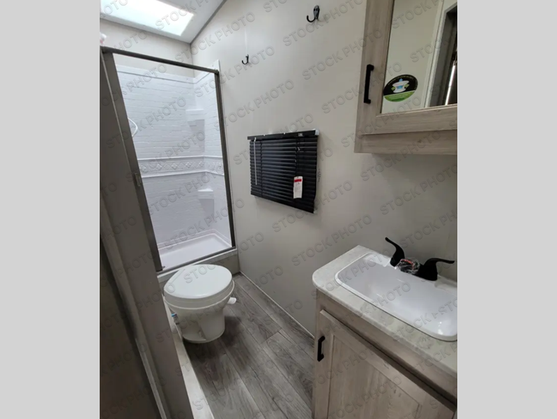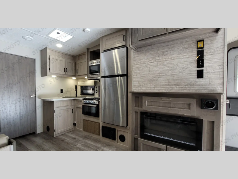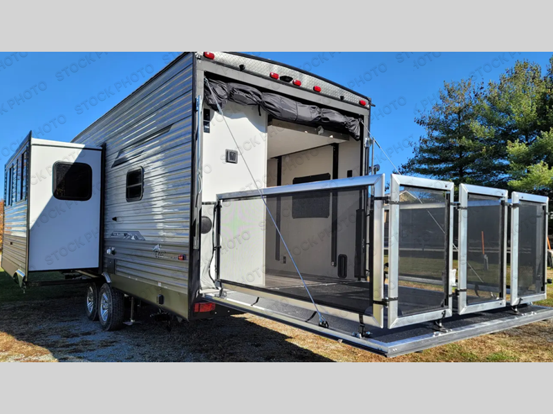This toy hauler has lots of room for toys and guests! You will love the retreat of the front private bedroom with a queen bed, dual wardrobes and its own entry door. Additional guests can sleep in the double-size bunks with an electric trac bed lift in the cargo area, also with its own entry door. A rear corner bath makes efficient use of space and includes a 24" x 32" shower and a medicine cabinet. The main living area features an entertainment center that can be upgraded with an optional fireplace for maximum coziness. Relax on the sofa or the U-shaped dinette. You'll also appreciate the kitchen with its L-shaped counter, corner sink, microwave, GE stainless 10.7 cu. ft. 12V refrigerator, and three-burner range. Or step outside and use the camper kitchen with a griddle and mini refrigerator!