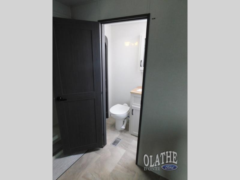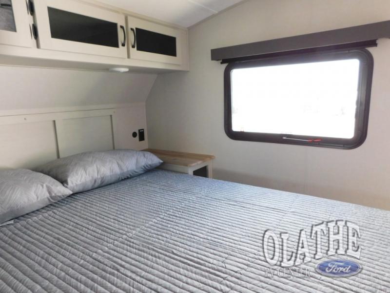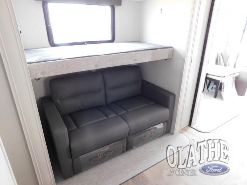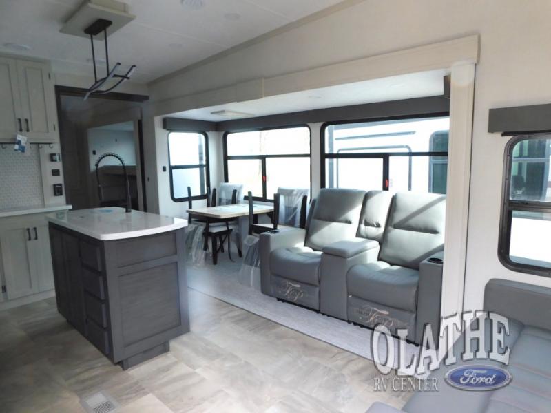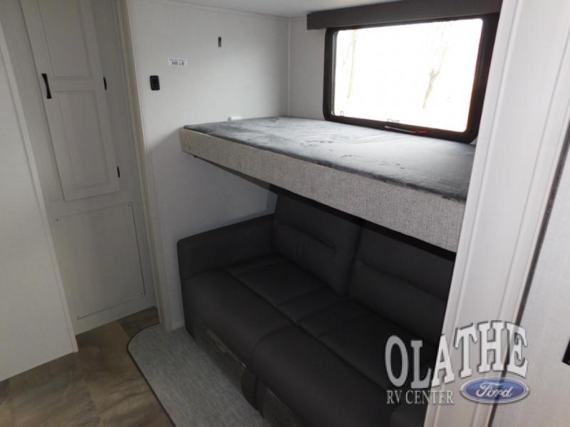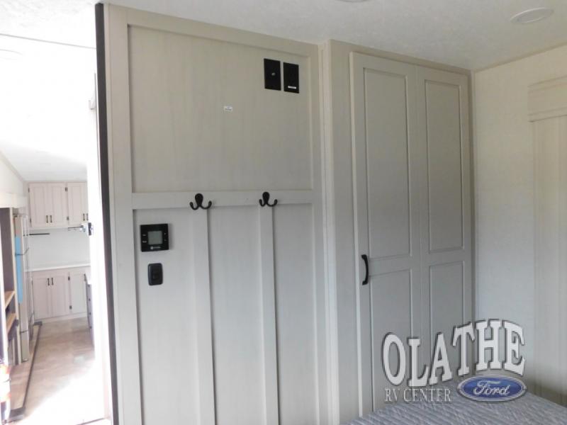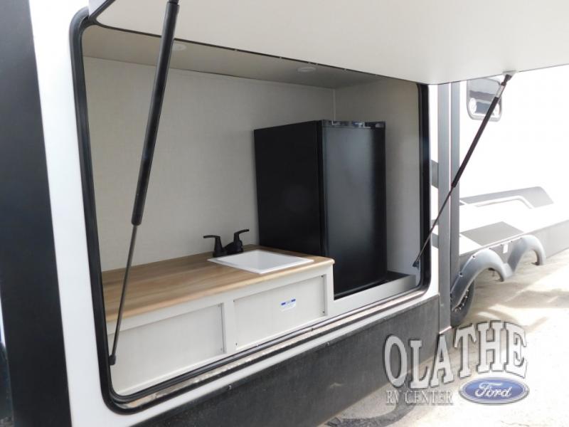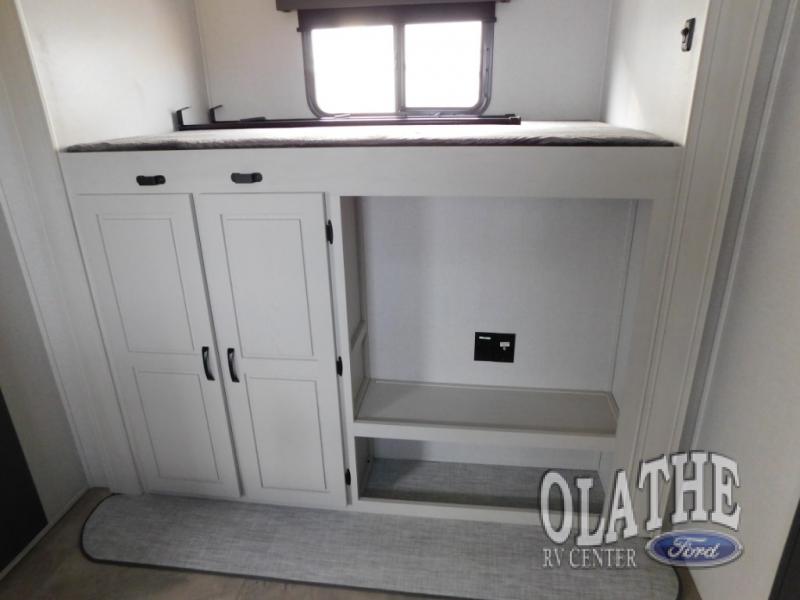 Camping with a large group of friends or family is easier than ever in this roomy fifth wheel for seven to eight. There are two full baths, with your guests having their own bath with its own exterior entry door in in the bunkhouse; how convenient! The chef of your group will find all they need in the interior kitchen, or they can cook on the outside kitchen. Inside, there is comfortable seating spaces on the sofa, the theatre seating, and the free-standing table, plus you can enjoy the 50" 4K Smart LED TV within the entertainment center for even more fun. Having your own bedroom to retreat to each night will be much appreciated. There is a queen bed, wardrobe slide out, dual nightstands, and even washer and dryer prep!