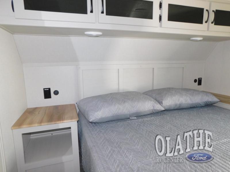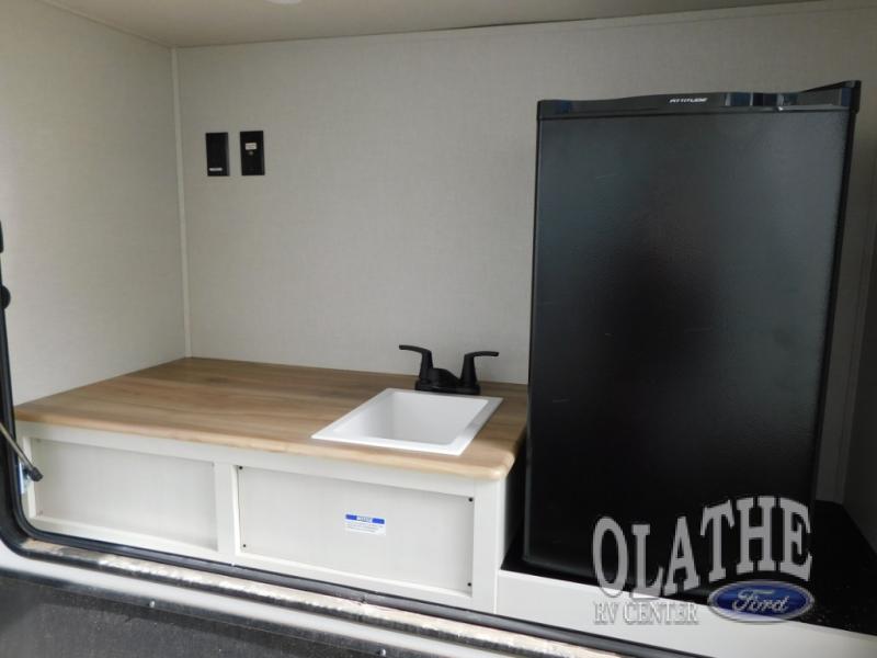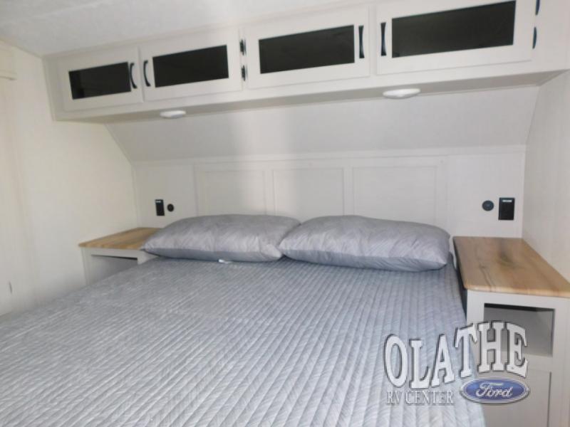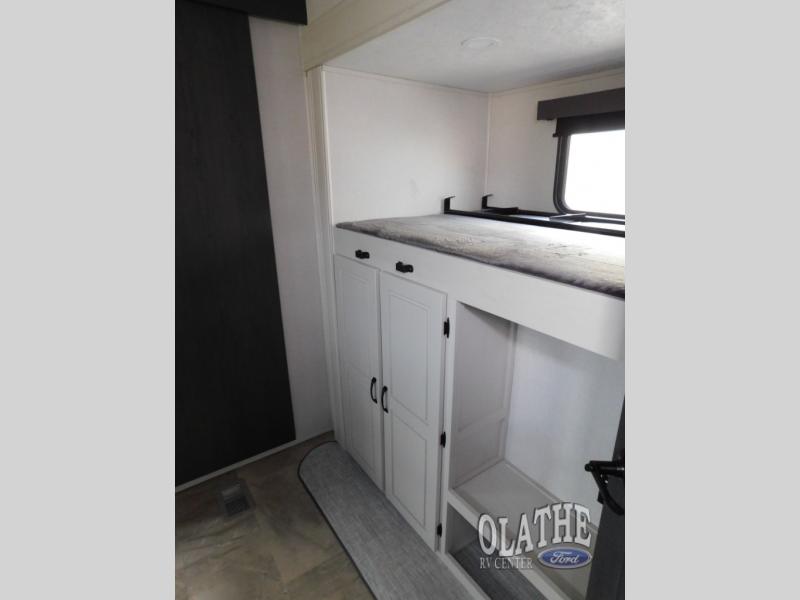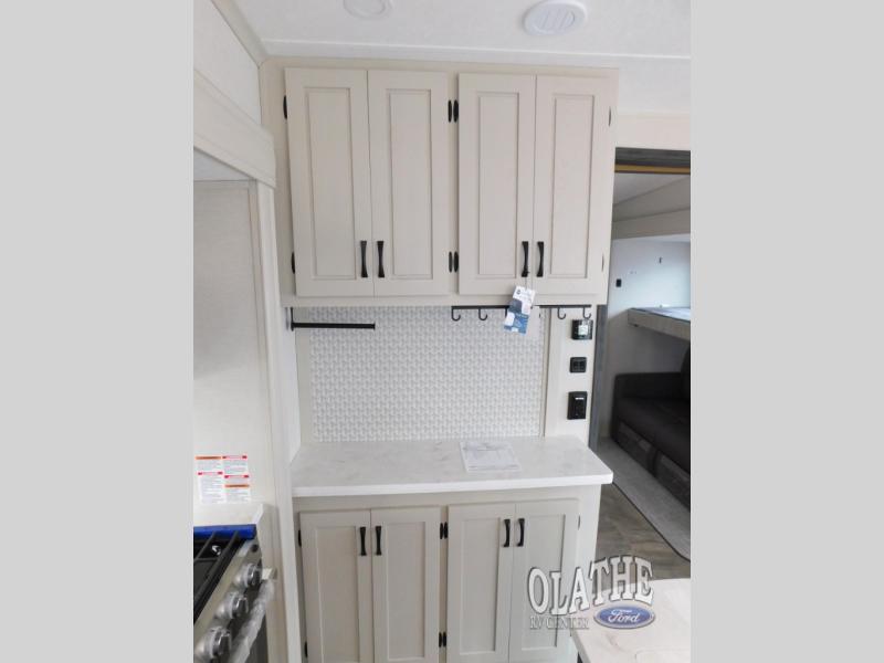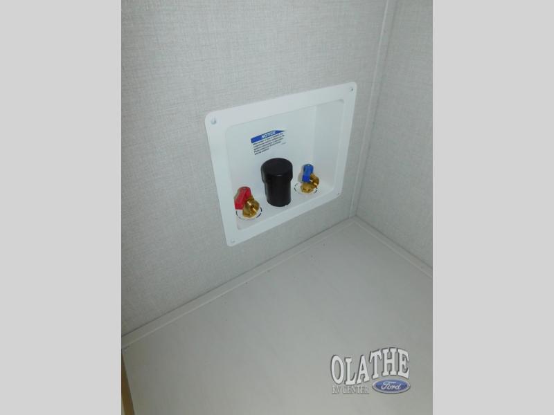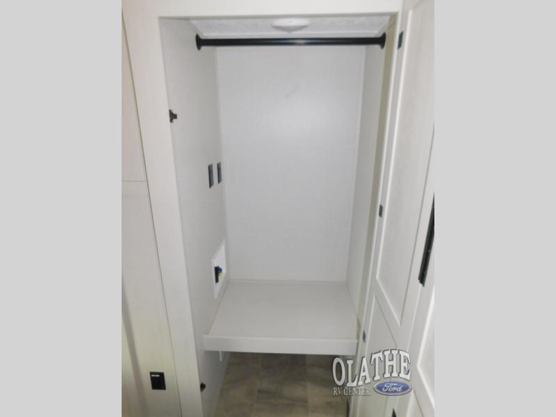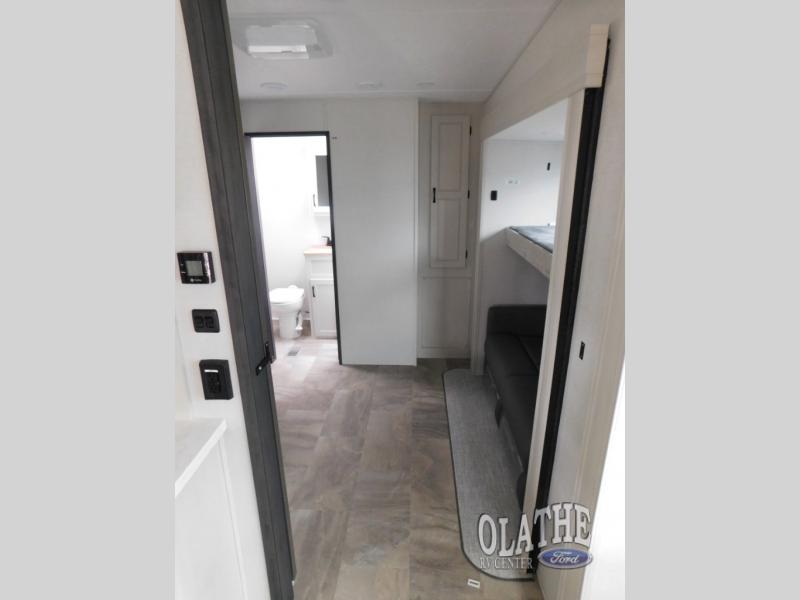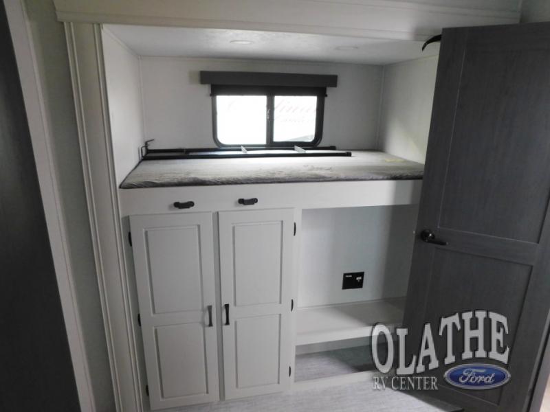 Camping with a large group of friends or family is easier than ever in this roomy fifth wheel for seven to eight. There are two full baths, with your guests having their own bath with its own exterior entry door in in the bunkhouse; how convenient! The chef of your group will find all they need in the interior kitchen, or they can cook on the outside kitchen. Inside, there is comfortable seating spaces on the sofa, the theatre seating, and the free-standing table, plus you can enjoy the 50" 4K Smart LED TV within the entertainment center for even more fun. Having your own bedroom to retreat to each night will be much appreciated. There is a queen bed, wardrobe slide out, dual nightstands, and even washer and dryer prep!