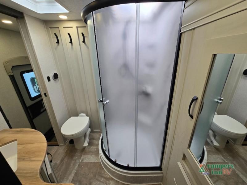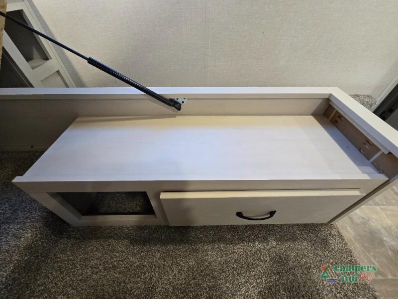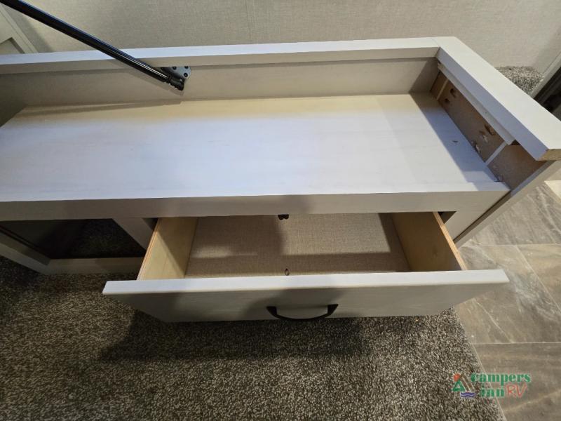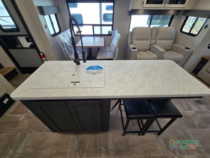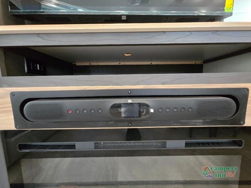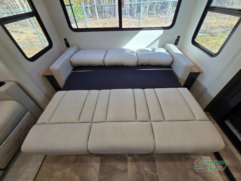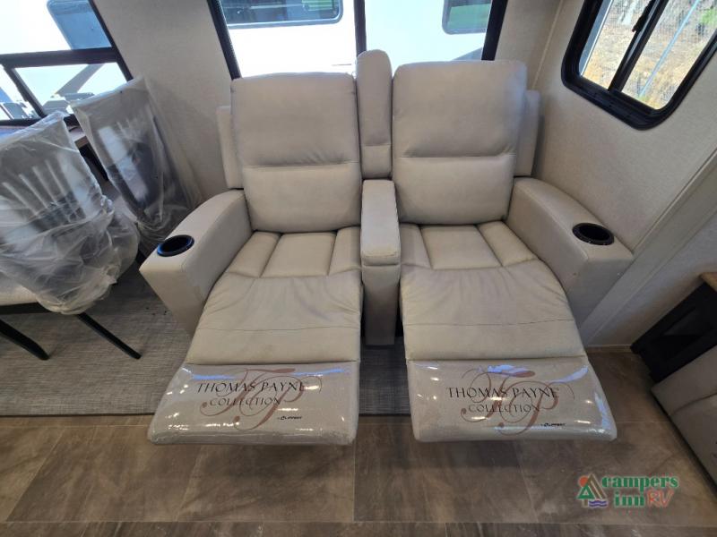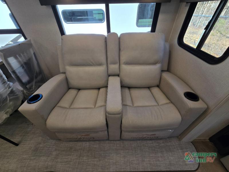 - Rear Living Area: A spacious, inviting area perfect for relaxing after a day of adventure. It offers a 78" tri-fold hide-a-bed sofa and theater seating, all positioned across from the entertainment center for optimal viewing.