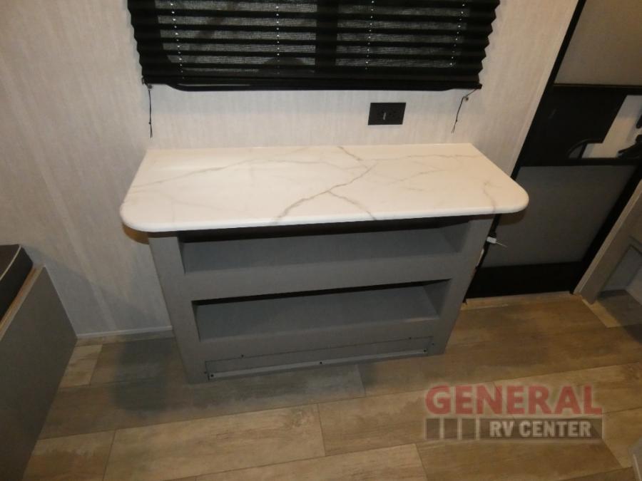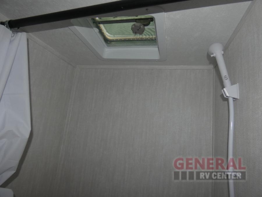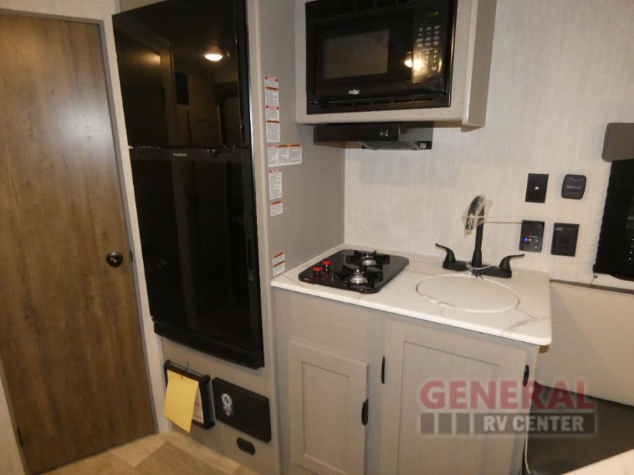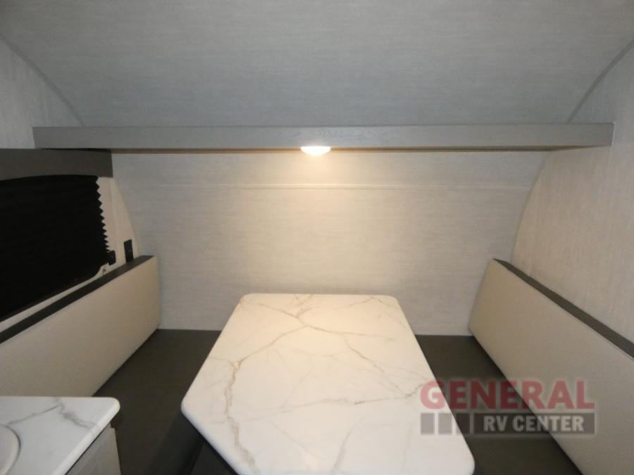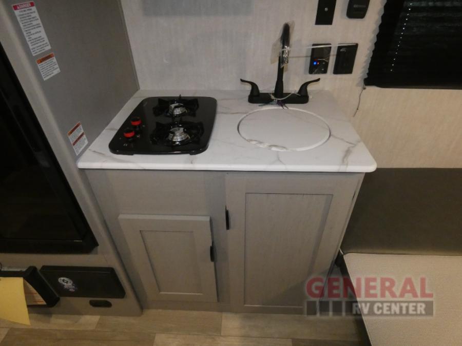 Tired of tent camping and sleeping on the ground? This lightweight travel trailer can accommodate you nicely with a dry and comfortable place to stay while enjoying nature. Inside, you will find a booth dinette for plenty of space to sit and stretch your legs, or enjoy a meal. The booth dinette easily converts to sleeping space at night. You might also enjoy your morning breakfast or coffee at the bar top with two stools.  A 24" x 36" shower and toilet provide a convenience to your camping trips, no late nights running to the campground bathroom in the dark. And, the kitchen features a two burner cooktop and refrigerator so you can cook inside when you'd rather not deal with campfire smoke over an open fire. There is also plenty of storage for your things between the overhead cabinets and shelves, wardrobe/pantry near the door, and within exterior storage as well.