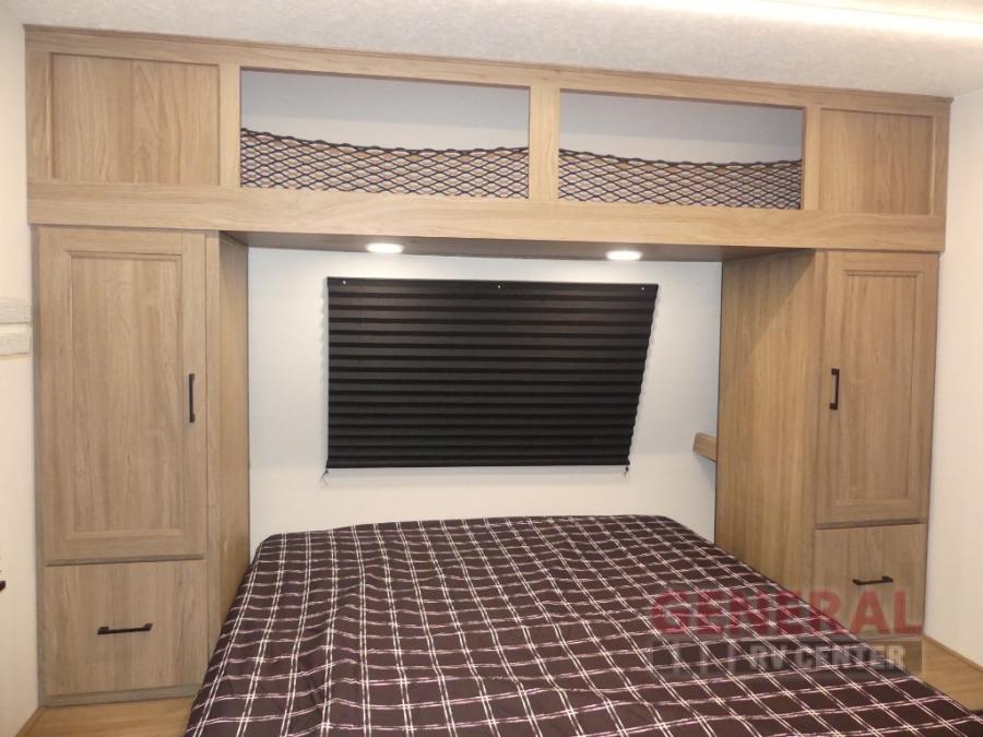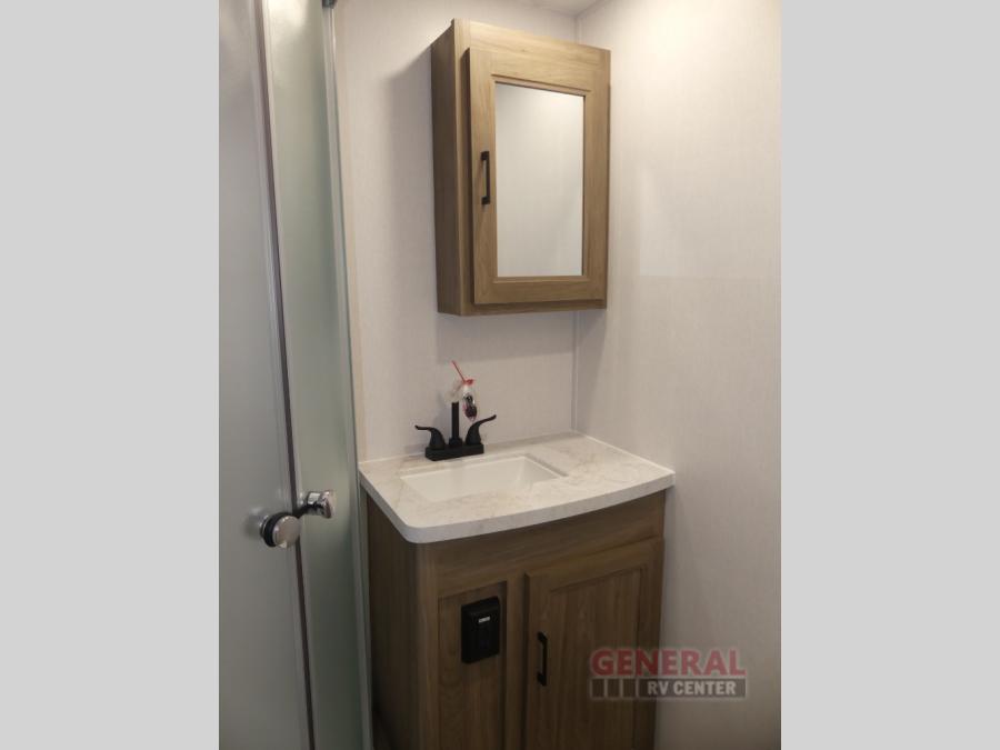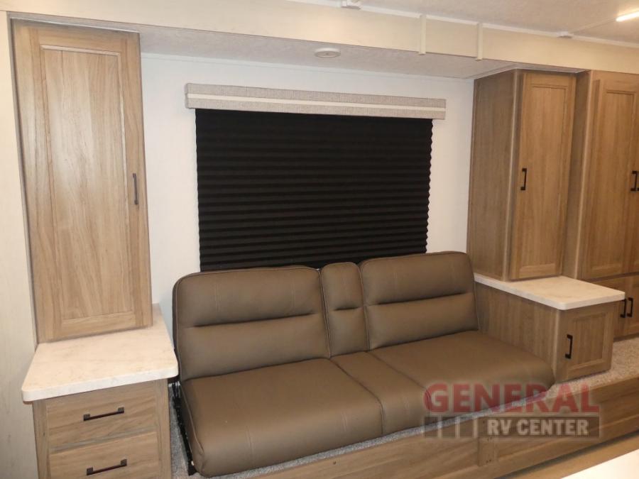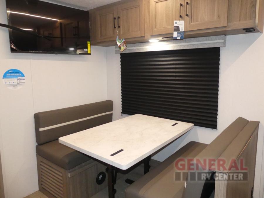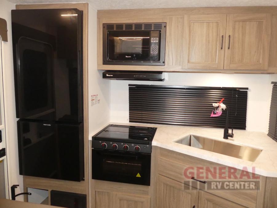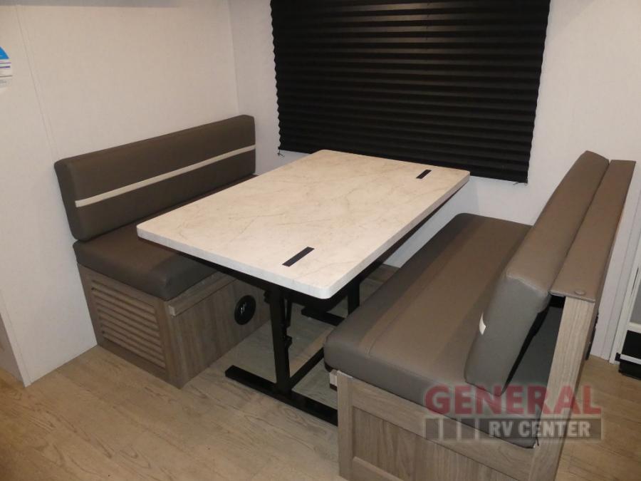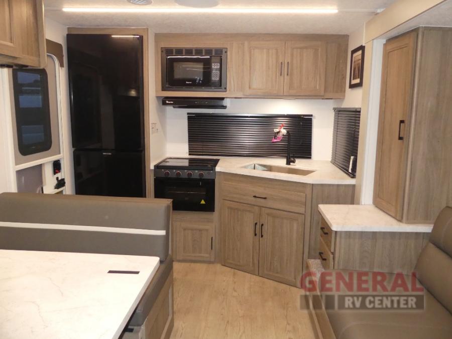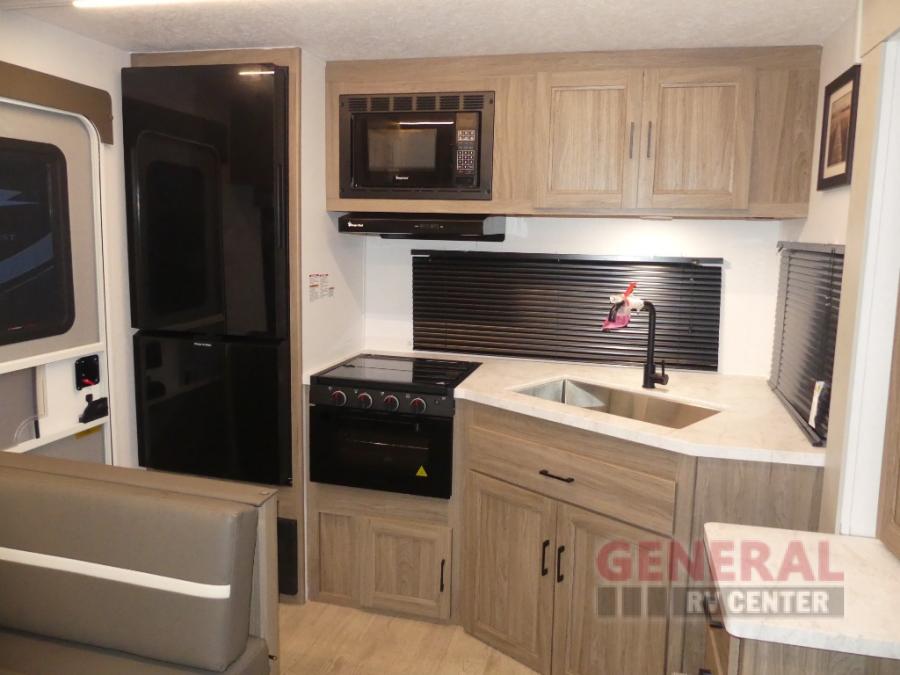This travel trailer will feel a little more like home since there is a semi-private front bedroom with a queen bed, dual wardrobes, and a bedroom privacy curtain. On the opposite end, the rear kitchen will let you make meals each day on the dual-burner cooktop and microwave oven, plus there is a 12V refrigerator to keep food fresh. A large slide out includes a sofa, dual pantries with end tables, plus a wardrobe with a bench where you can pull your hiking boots off. And a booth dinette provides the perfect place to dine and play games together!