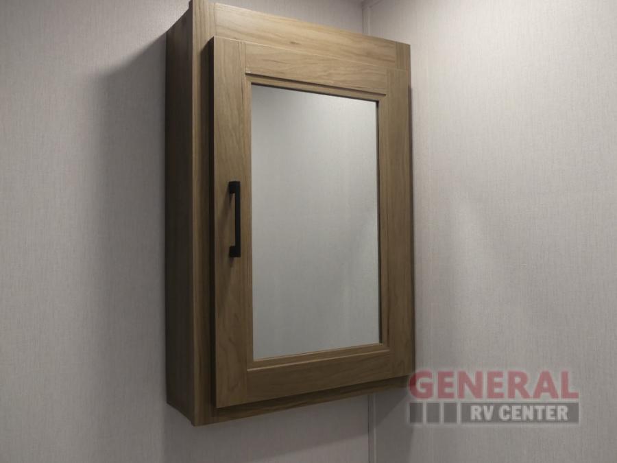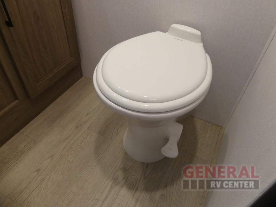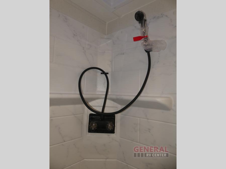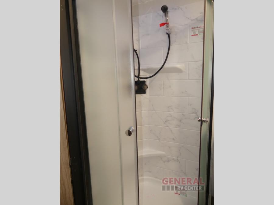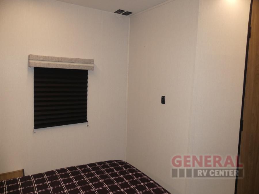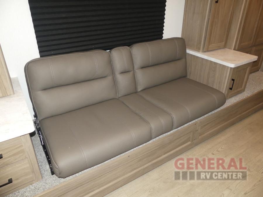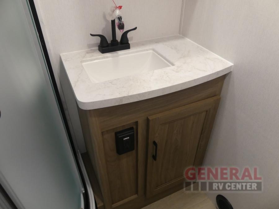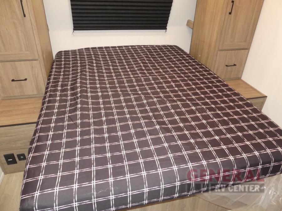 This travel trailer will feel a little more like home since there is a semi-private front bedroom with a queen bed, dual wardrobes, and a bedroom privacy curtain. On the opposite end, the rear kitchen will let you make meals each day on the dual-burner cooktop and microwave oven, plus there is a 12V refrigerator to keep food fresh. A large slide out includes a sofa, dual pantries with end tables, plus a wardrobe with a bench where you can pull your hiking boots off. And a booth dinette provides the perfect place to dine and play games together!