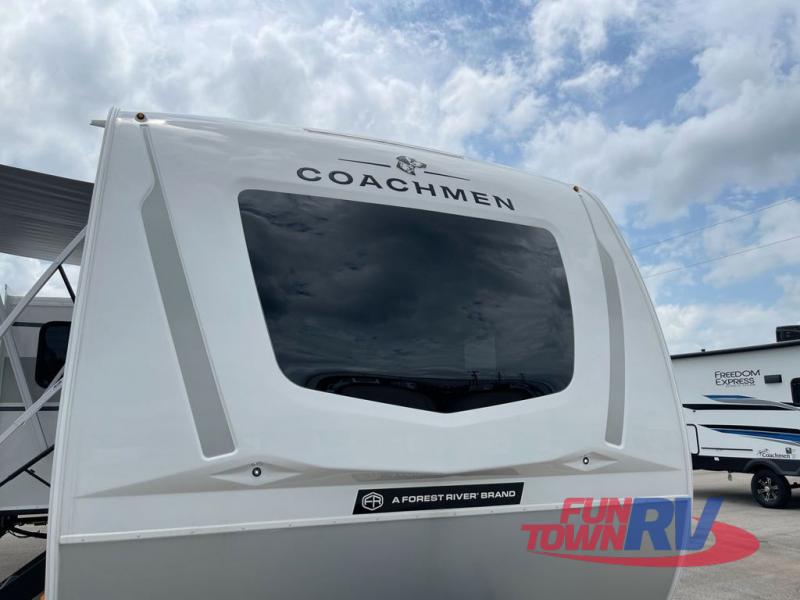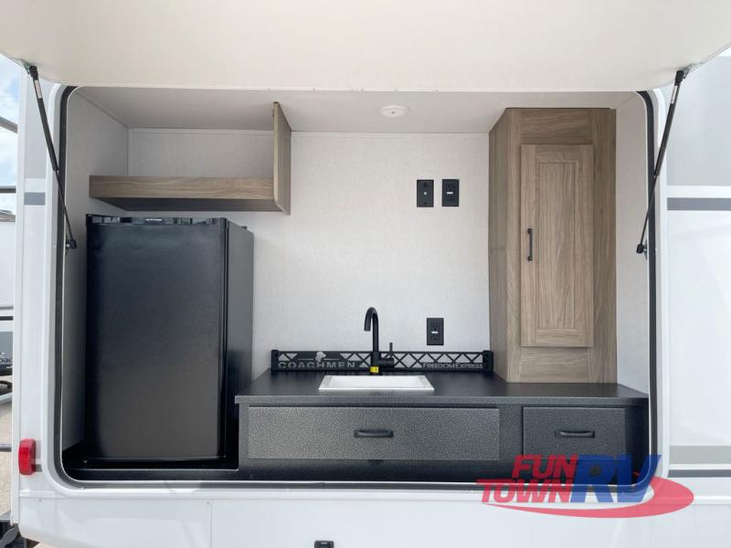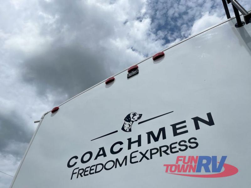 With any Freedom Express Ultra Lite travel trailer by Coachmen you will appreciate quality construction materials, such as vacuum bonded walls with Azdel composite, a 3/4 gel coated fiberglass cap with an automotive glass windshield, and a heated enclosed underbelly. Each model also features Tufflex PVC roofing, front rock guard, and E-Z Lube axles for smooth towing. Inside, you'll find kitchen backsplash, hidden hinge cabinetry, and wear-resistant vinyl flooring throughout. The power tongue jack included with the Ultra Lite Express Package will make set-up a breeze, and each model includes back-up camera prep and they are Freedom solar ready if you plan to go off-grid. Enjoy lightweight camping with a Freedom Express Ultra Lite travel trailer today!