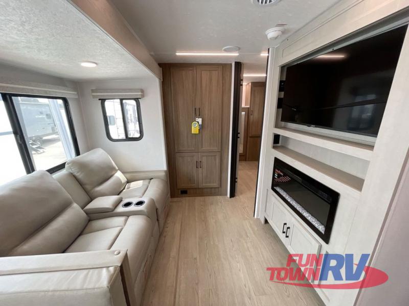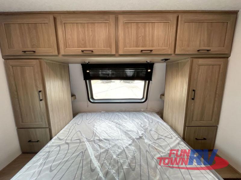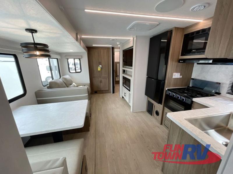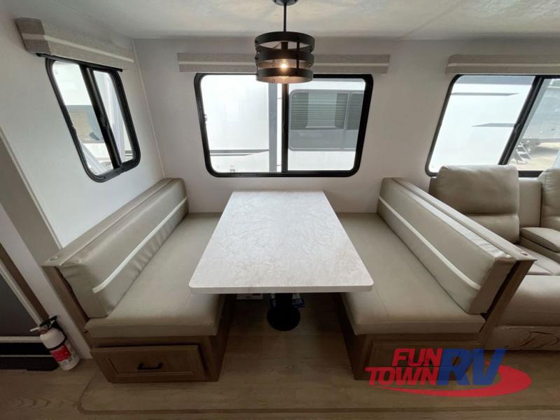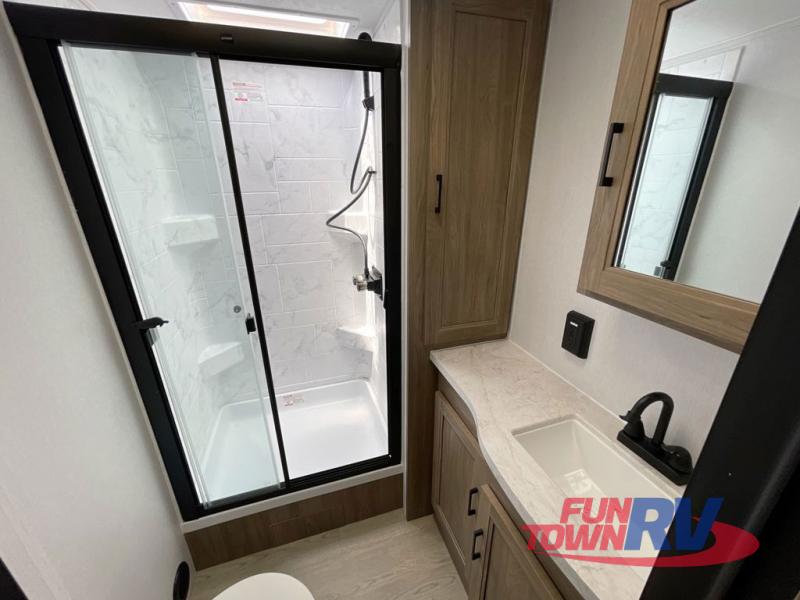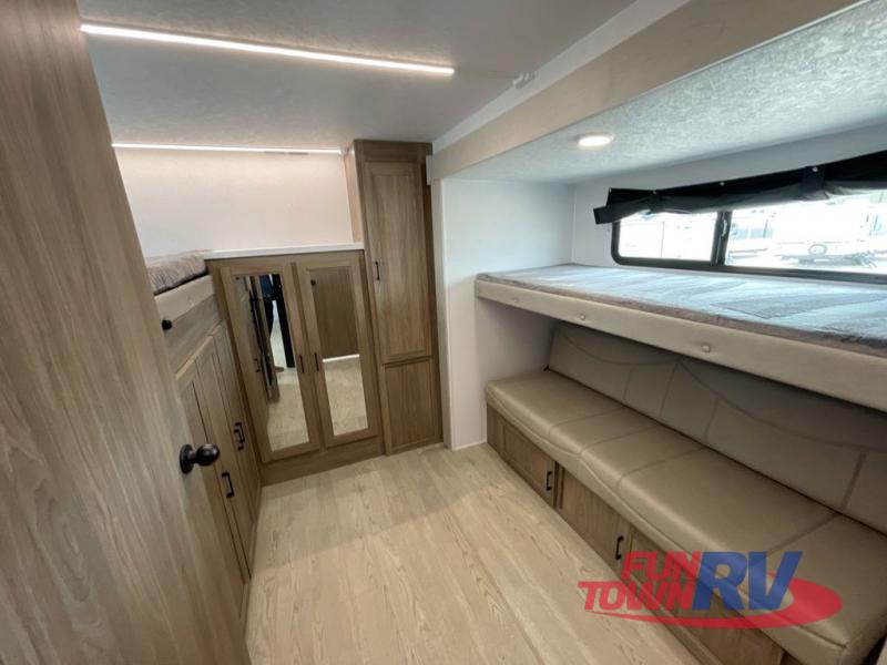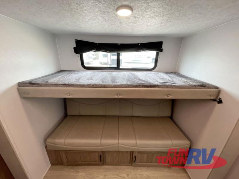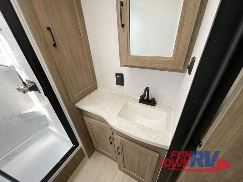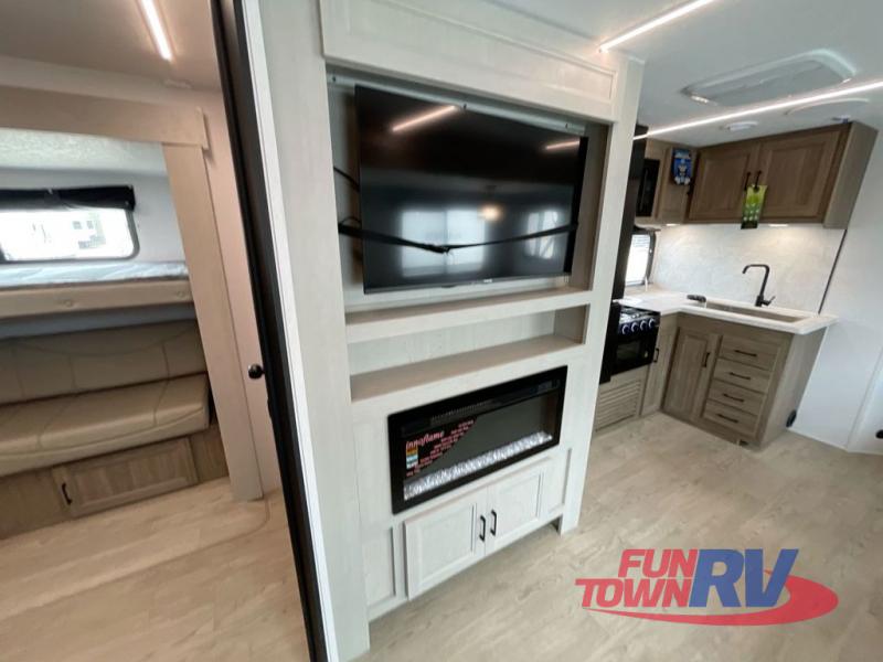 You will love taking a big group camping in this spacious travel trailer! The rear bunkhouse offers a flexible space with bunks plus a roll-over sofa. A half bath in the bunkhouse is ultra convenient, while the full bath includes a 30" x 36" shower.  At the front you will enjoy privacy in the queen bedroom, which has vaulted underbed storage, dual wardrobes, plus a linen closet with its own laundry bag for extra convenience. Everyone will want to gather in the living area with its entertainment center with fireplace. The hide-a-bed sofa offers even more sleeping space, or swap it out for the optional theater seats for extra relaxation. The kitchen is well-equipped and the 76" dinette booth will have plenty of room. There's an outdoor camp kitchen as well if you'd prefer to cook outside.