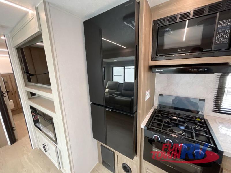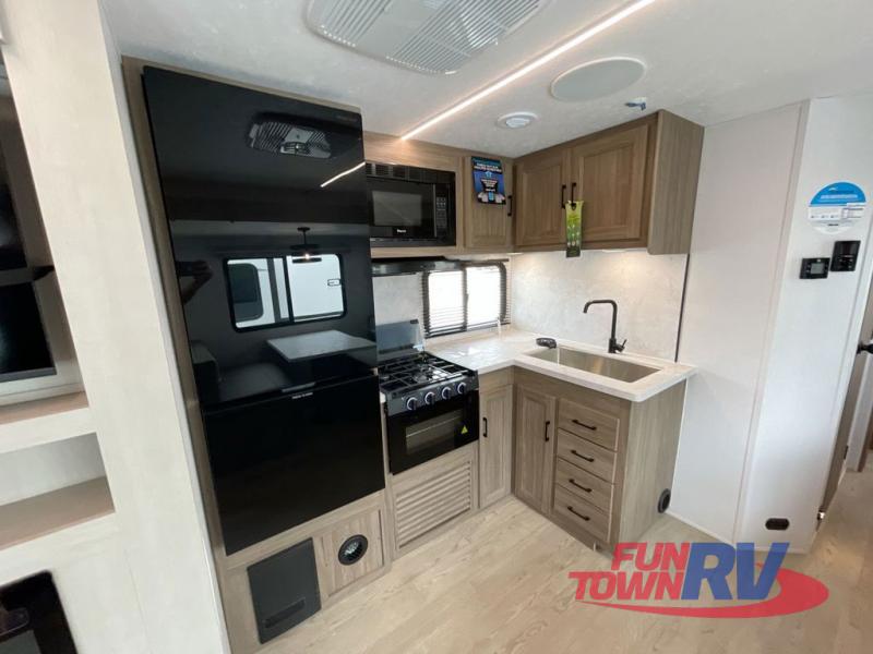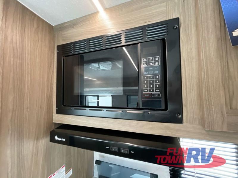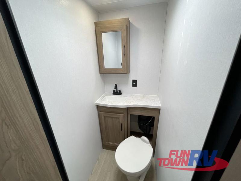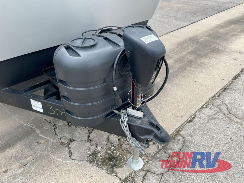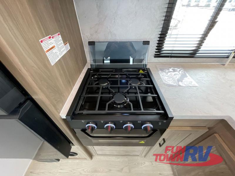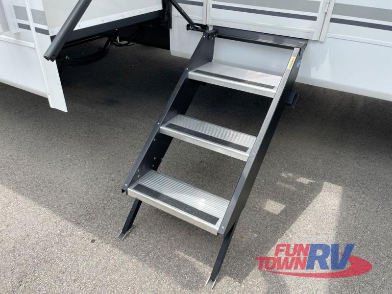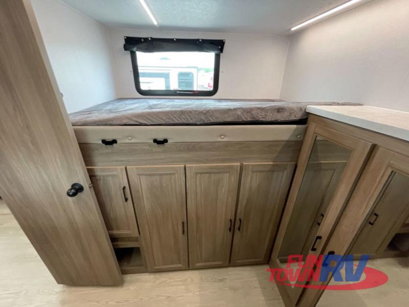 You will love taking a big group camping in this spacious travel trailer! The rear bunkhouse offers a flexible space with bunks plus a roll-over sofa. A half bath in the bunkhouse is ultra convenient, while the full bath includes a 30" x 36" shower.  At the front you will enjoy privacy in the queen bedroom, which has vaulted underbed storage, dual wardrobes, plus a linen closet with its own laundry bag for extra convenience. Everyone will want to gather in the living area with its entertainment center with fireplace. The hide-a-bed sofa offers even more sleeping space, or swap it out for the optional theater seats for extra relaxation. The kitchen is well-equipped and the 76" dinette booth will have plenty of room. There's an outdoor camp kitchen as well if you'd prefer to cook outside.
