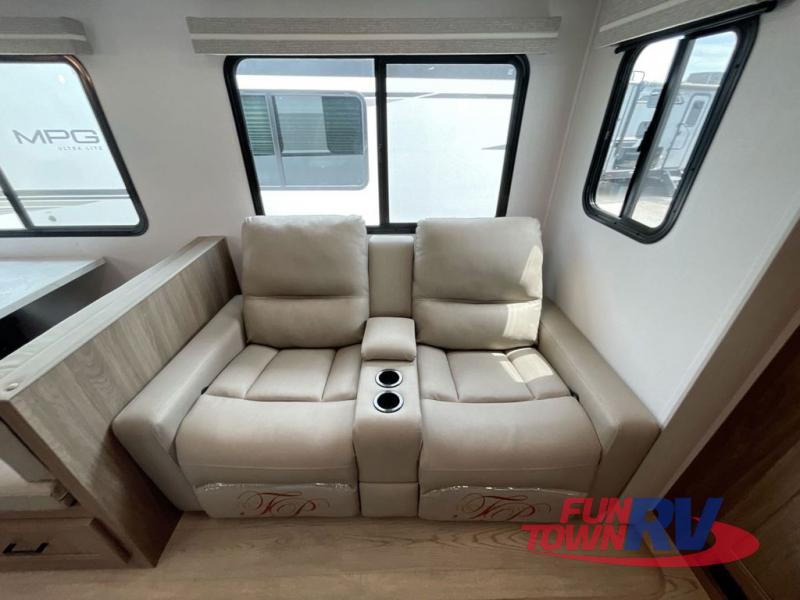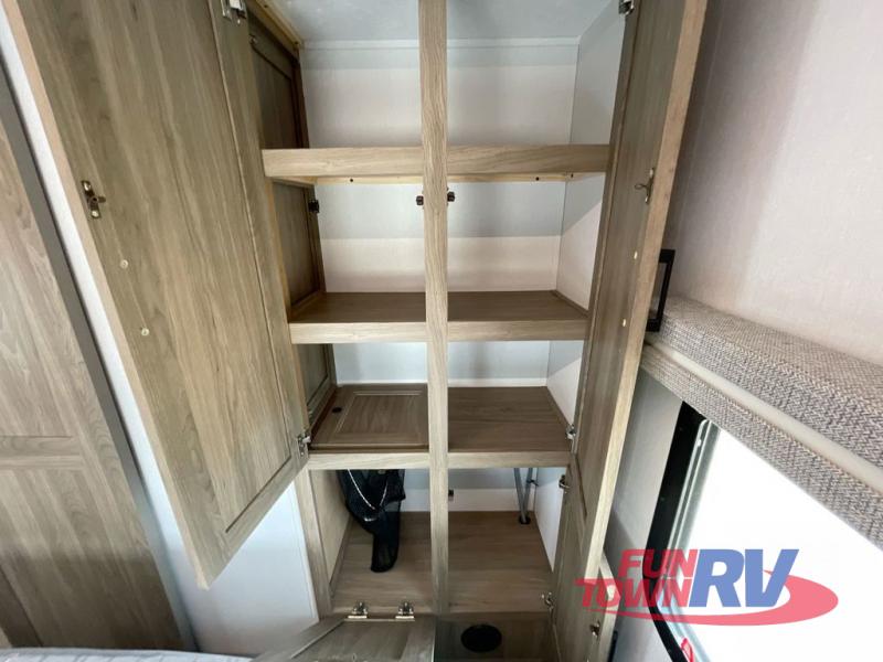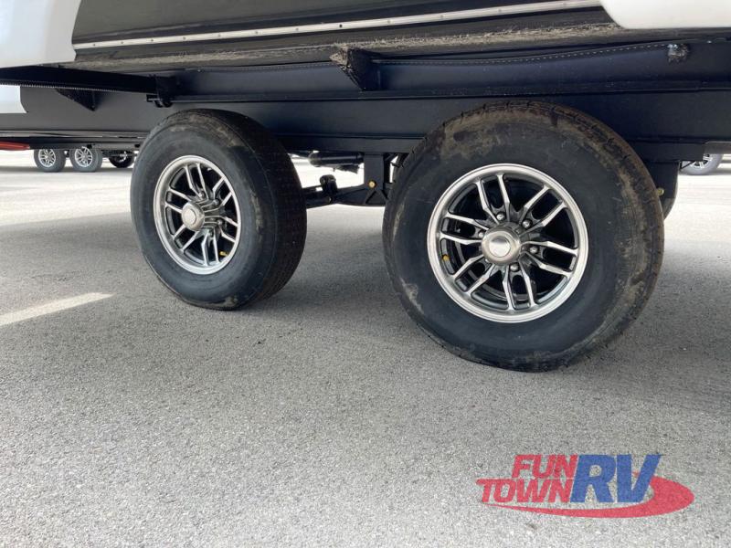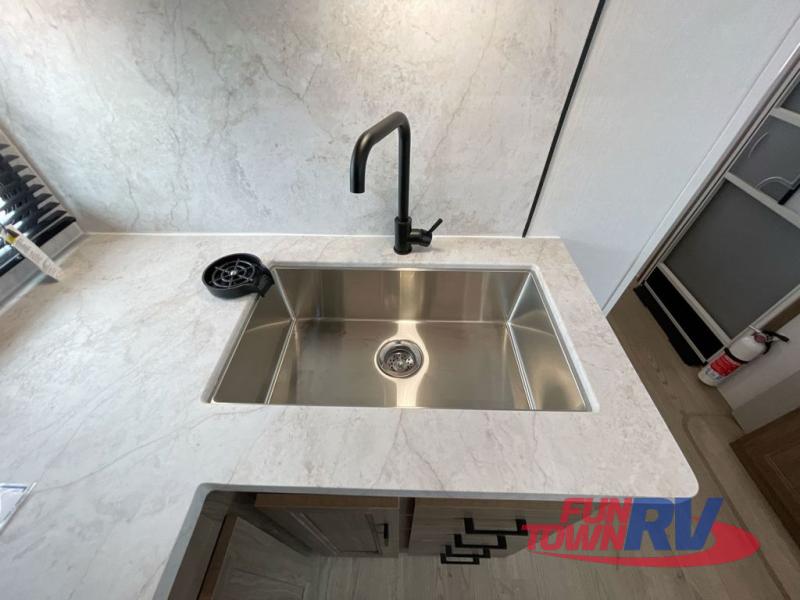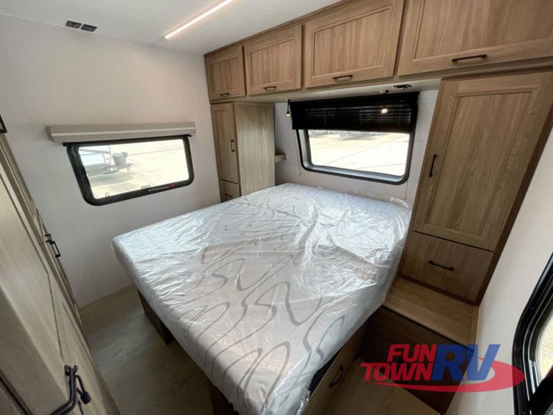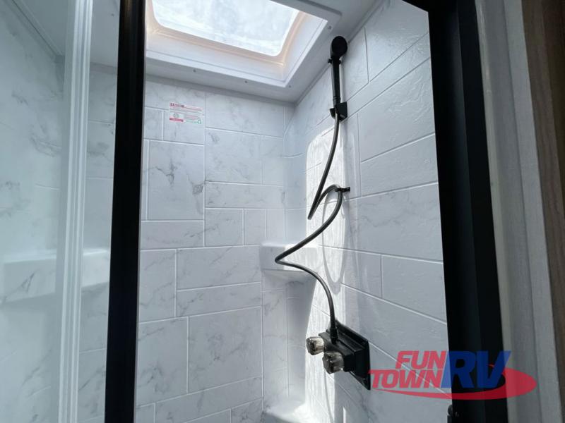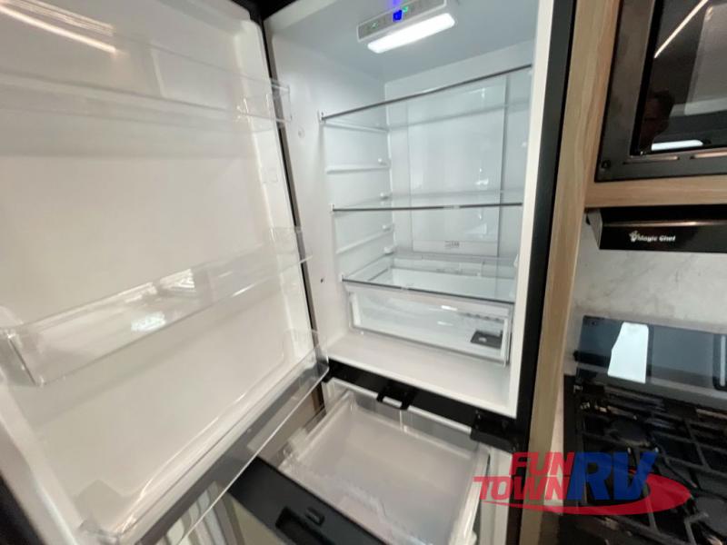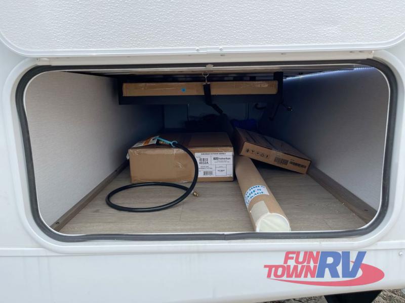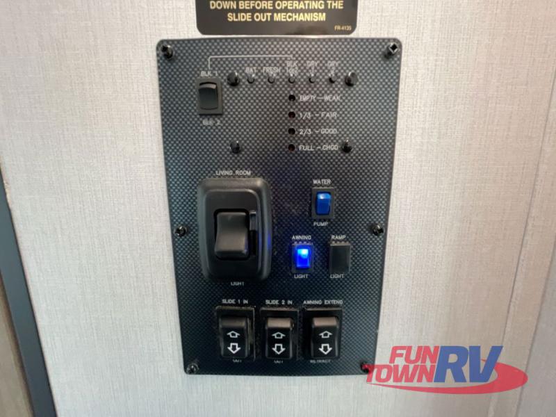 You will love taking a big group camping in this spacious travel trailer! The rear bunkhouse offers a flexible space with bunks plus a roll-over sofa. A half bath in the bunkhouse is ultra convenient, while the full bath includes a 30" x 36" shower.  At the front you will enjoy privacy in the queen bedroom, which has vaulted underbed storage, dual wardrobes, plus a linen closet with its own laundry bag for extra convenience. Everyone will want to gather in the living area with its entertainment center with fireplace. The hide-a-bed sofa offers even more sleeping space, or swap it out for the optional theater seats for extra relaxation. The kitchen is well-equipped and the 76" dinette booth will have plenty of room. There's an outdoor camp kitchen as well if you'd prefer to cook outside.