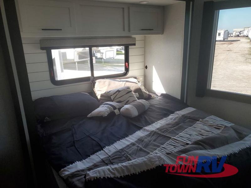 Each Hampton destination trailer by CrossRoads RV includes a one-piece fiberglass front cap, tinted glass windows, and an outside faucet that will surely come in handy when wanting to rinse off your hands or even shoes after exploring outdoors. Each is constructed with a fiberglass roof and floor insulation with radiant tech foil, an enclosed underbelly, and severe weather welded mounts and rain gutters along the entire roof line. And, the Convenience package that comes standard includes KeyTV, a microwave, a quilted bedspread, a power vent in the bathroom, and more. Other interior features offered include decorative accent lighting, an 8-foot floor to ceiling height, a patio door with a swing-out assist rail, and two-toned wood fascia. So choose your destination, select your favorite Hampton, and start feeling at home when you are actually on vacation!