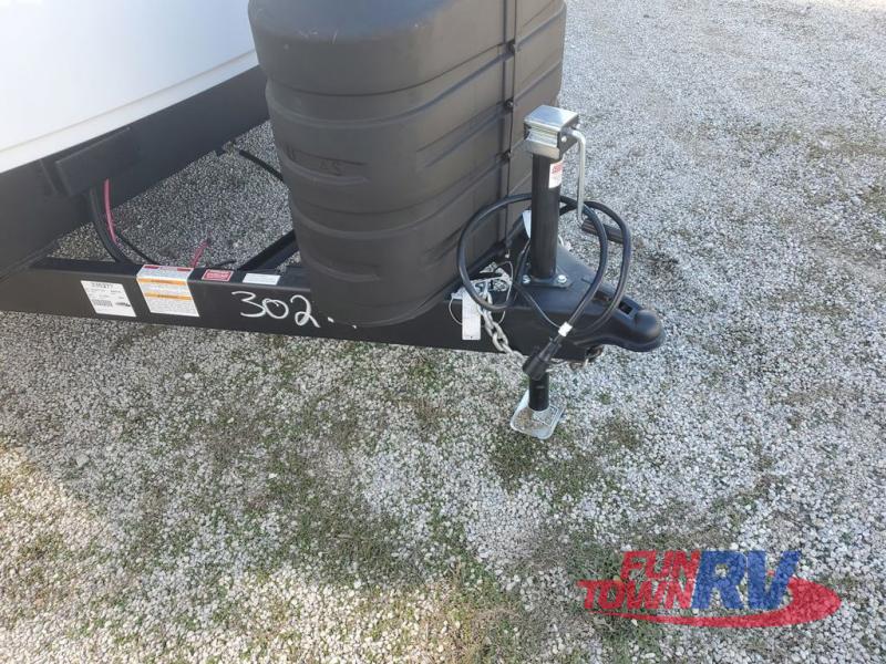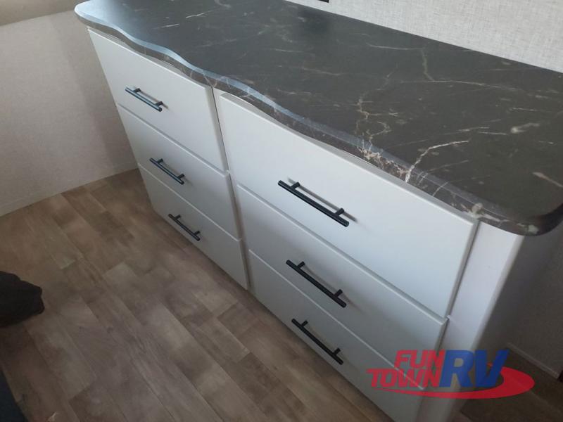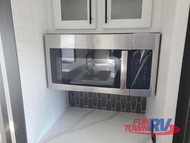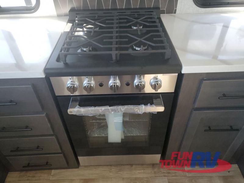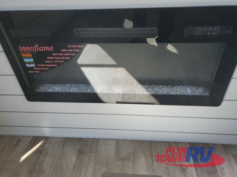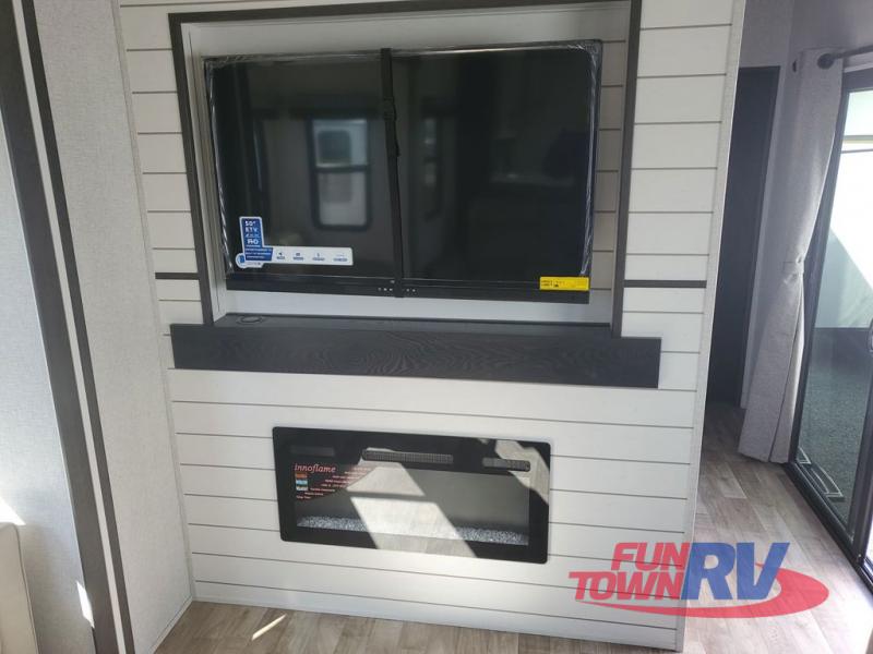 Extended stays in this destination trailer are made complete with family and friends. The chef of your group will love the spacious rear kitchen with plenty of overhead cabinets, a pantry/cabinet, plus a four burner cooktop. Everyone can be visiting in the middle living room while dinner is being made. Here, you'll find a hide-a-bed sofa, theater seating, plus fireplace with a 50" TV. The full bath lets you clean up each day, and the front private bedroom will feel just like home with a king bed slide out and tons of storage space for your necessities.