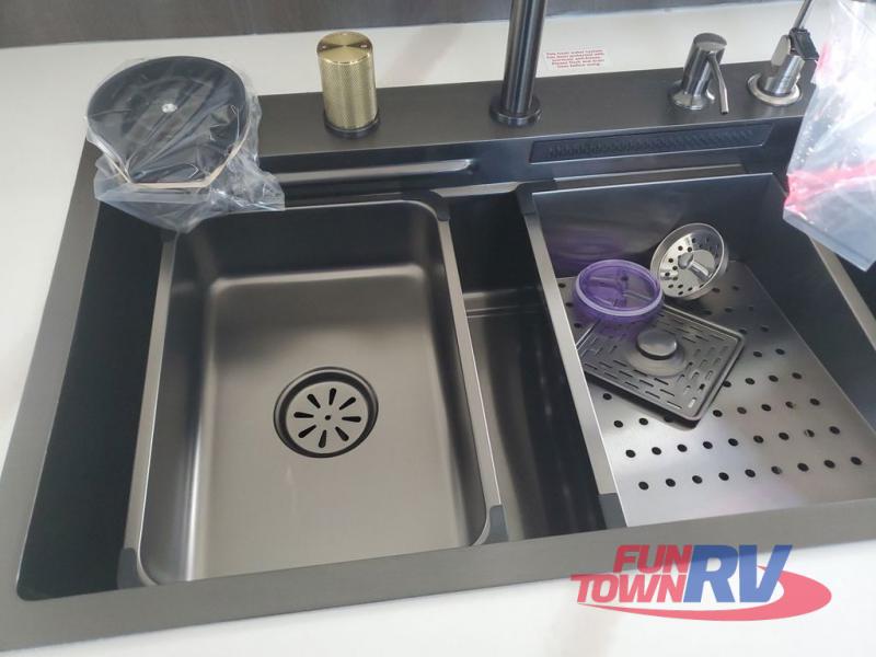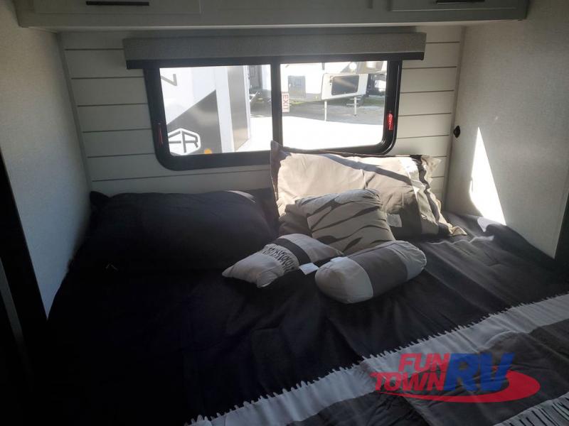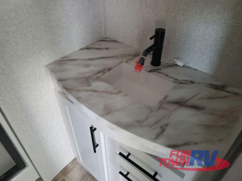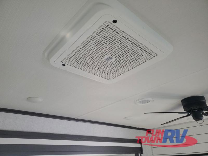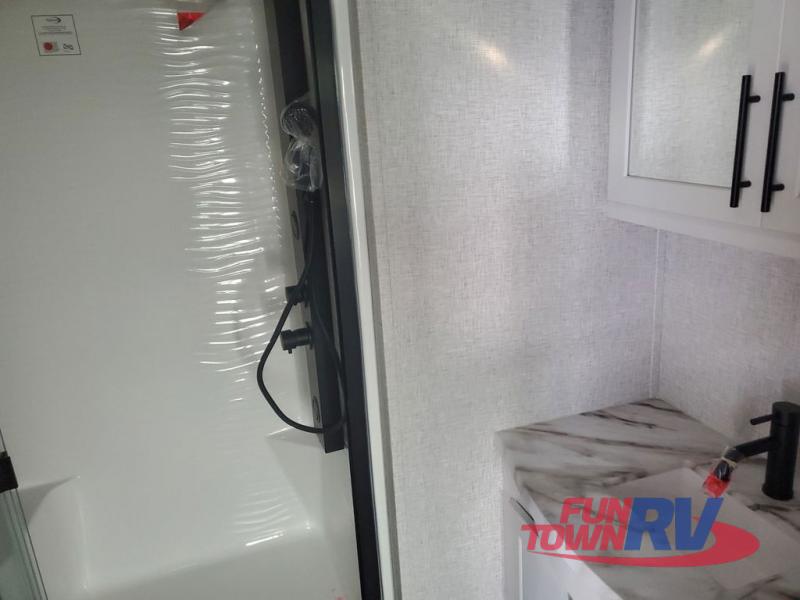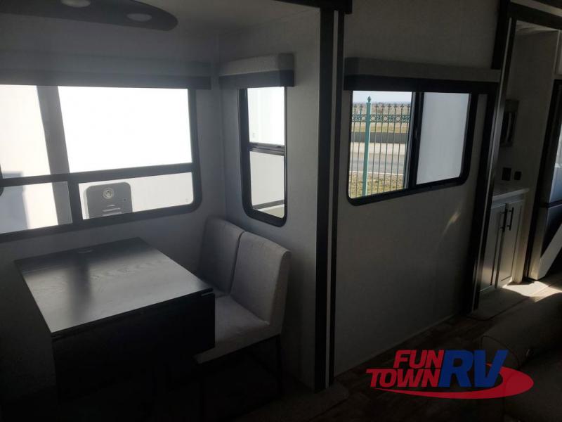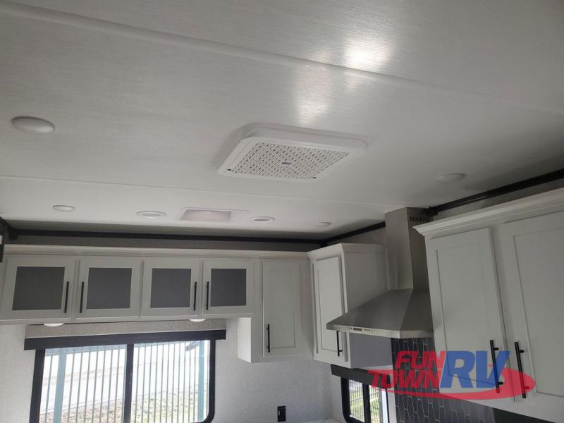 Extended stays in this destination trailer are made complete with family and friends. The chef of your group will love the spacious rear kitchen with plenty of overhead cabinets, a pantry/cabinet, plus a four burner cooktop. Everyone can be visiting in the middle living room while dinner is being made. Here, you'll find a hide-a-bed sofa, theater seating, plus fireplace with a 50" TV. The full bath lets you clean up each day, and the front private bedroom will feel just like home with a king bed slide out and tons of storage space for your necessities.