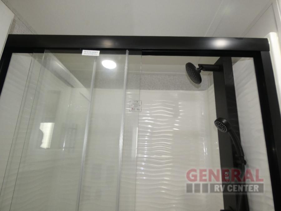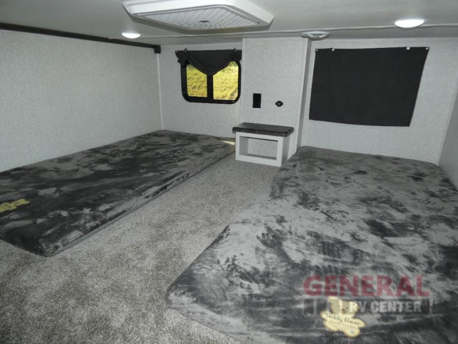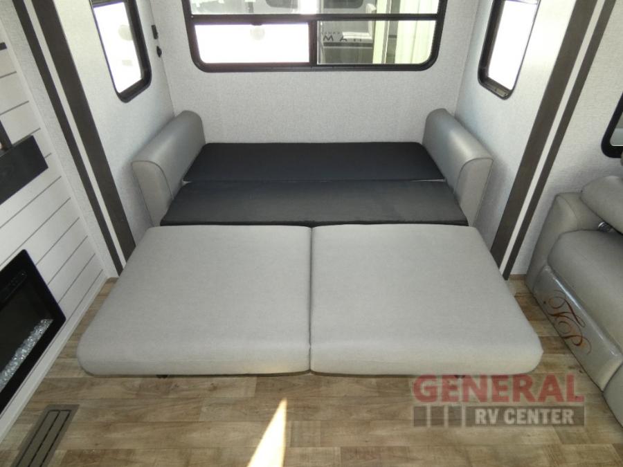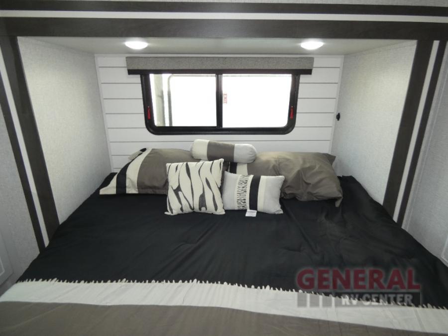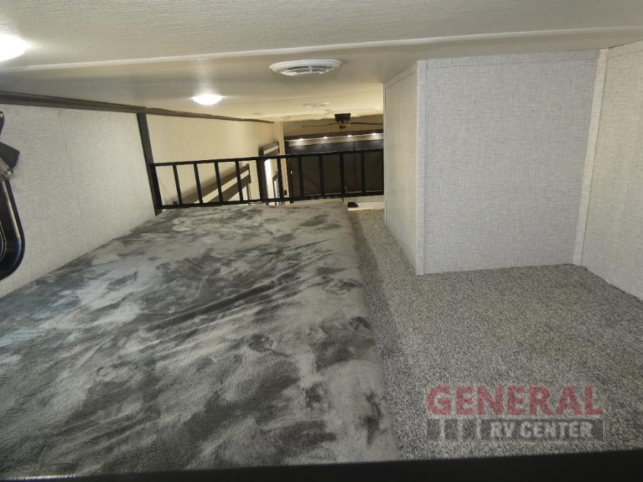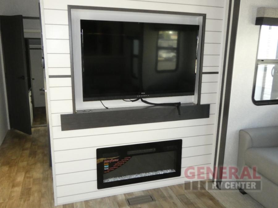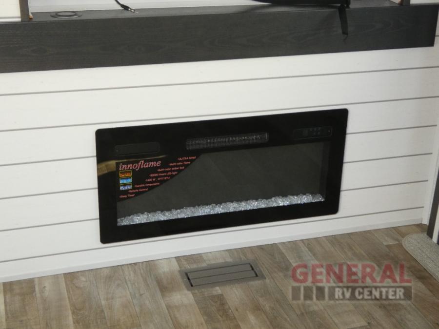 Are you looking for a destination trailer that can fit your whole crew? Look no further than this unit with four slides, three bunk mats in the loft areas, plus a spacious full bath that will allow everyone to stay clean each day. The front kitchen is any chef's dream with its ample counter space, pantry/cabinet, residential four burner range, and residential refrigerator. After dinner is cleaned up, everyone can meet in the middle living area to watch a movie on the 50" TV, and the fireplace here will make it feel more like home.