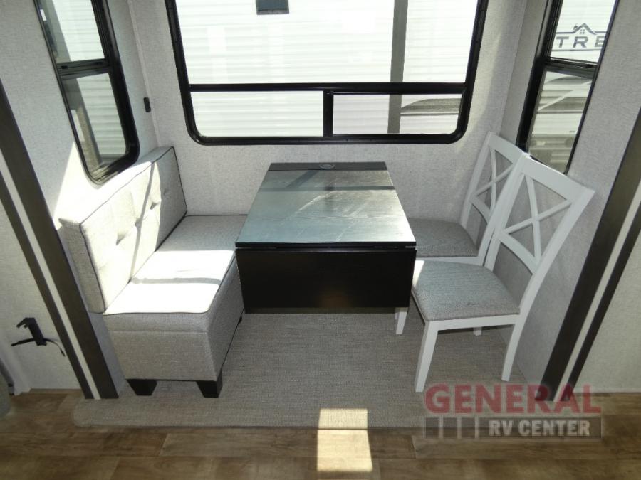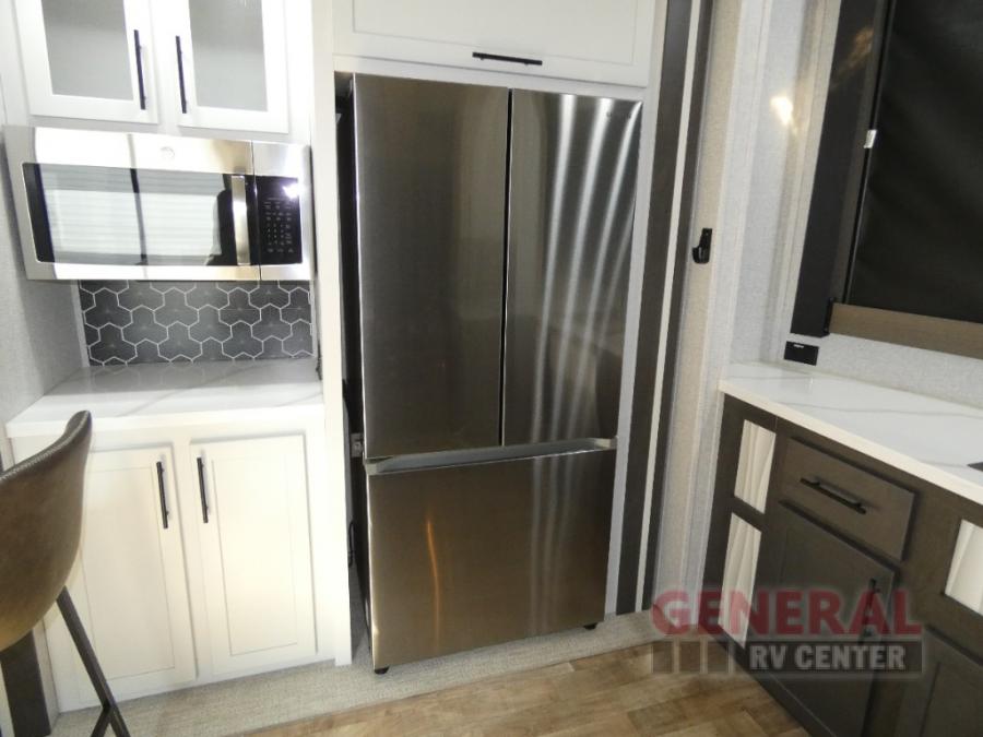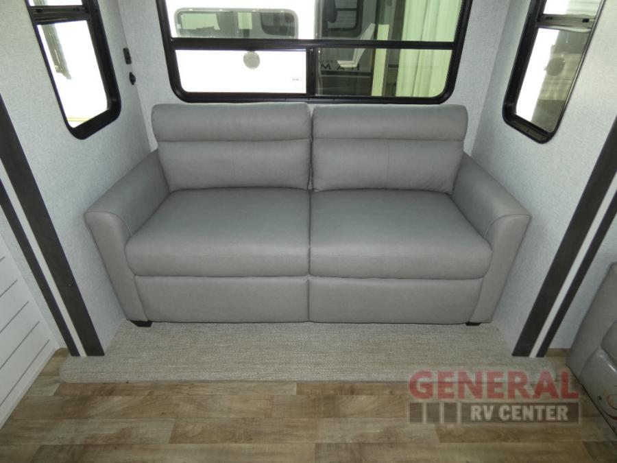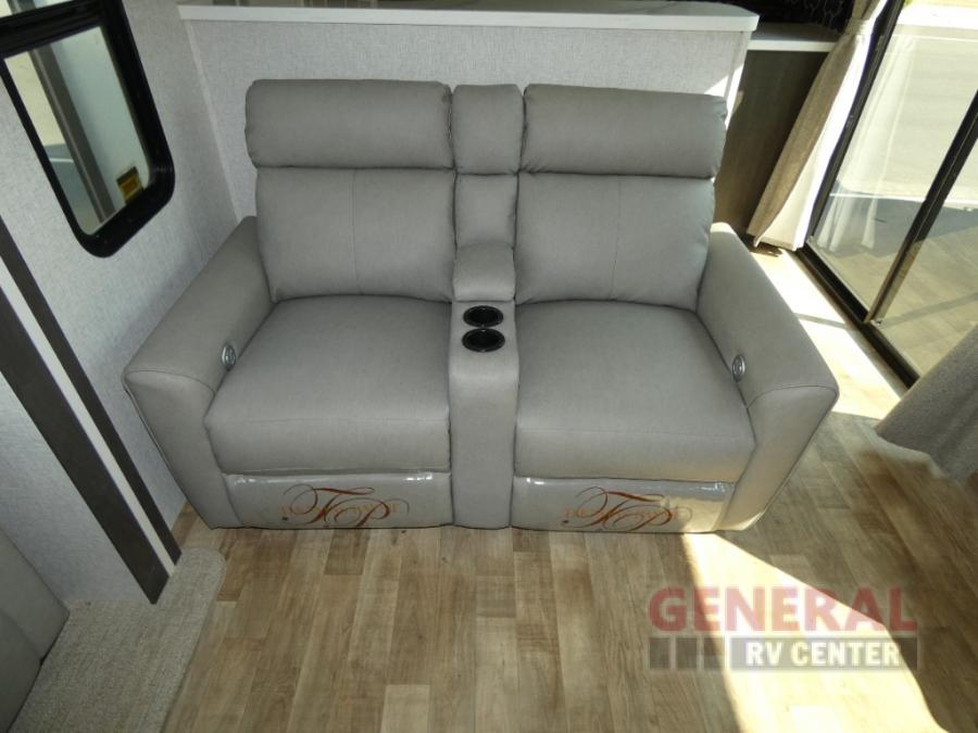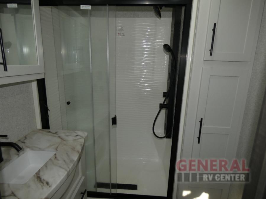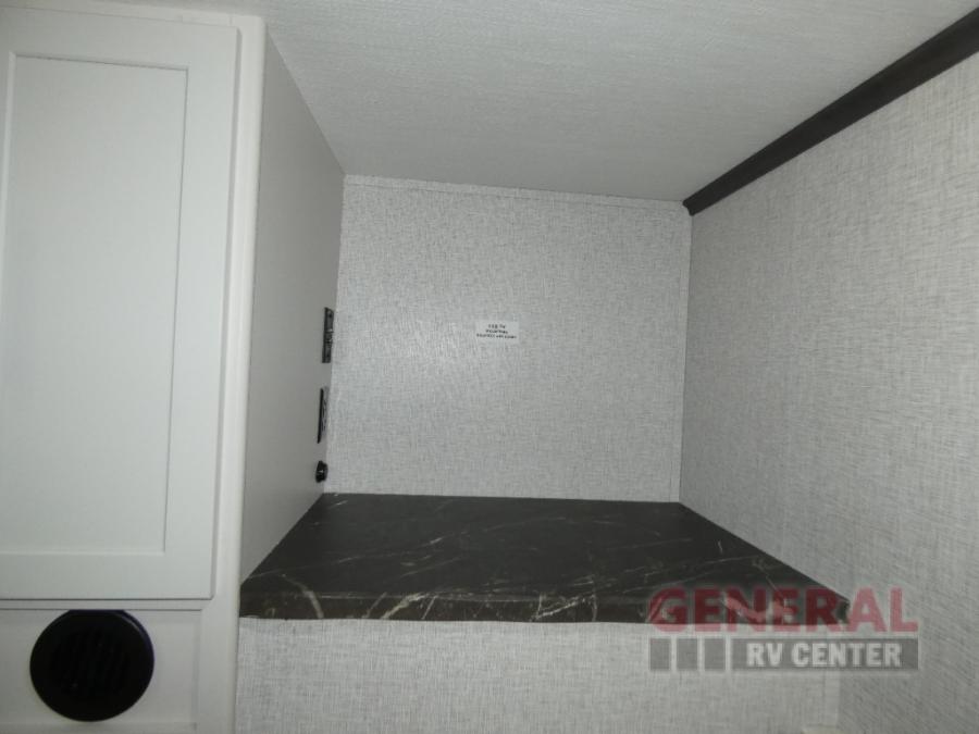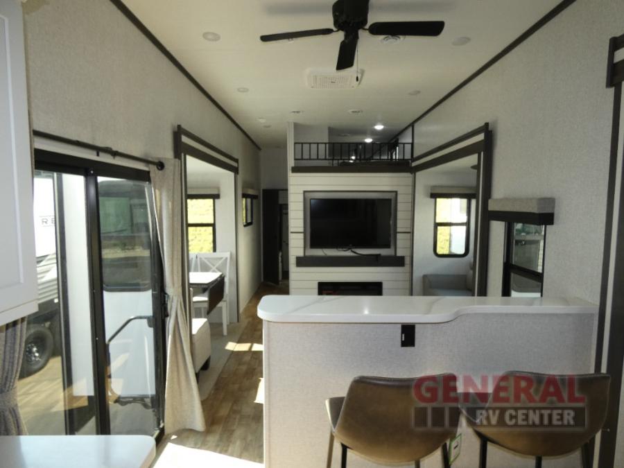 Are you looking for a destination trailer that can fit your whole crew? Look no further than this unit with four slides, three bunk mats in the loft areas, plus a spacious full bath that will allow everyone to stay clean each day. The front kitchen is any chef's dream with its ample counter space, pantry/cabinet, residential four burner range, and residential refrigerator. After dinner is cleaned up, everyone can meet in the middle living area to watch a movie on the 50" TV, and the fireplace here will make it feel more like home.
