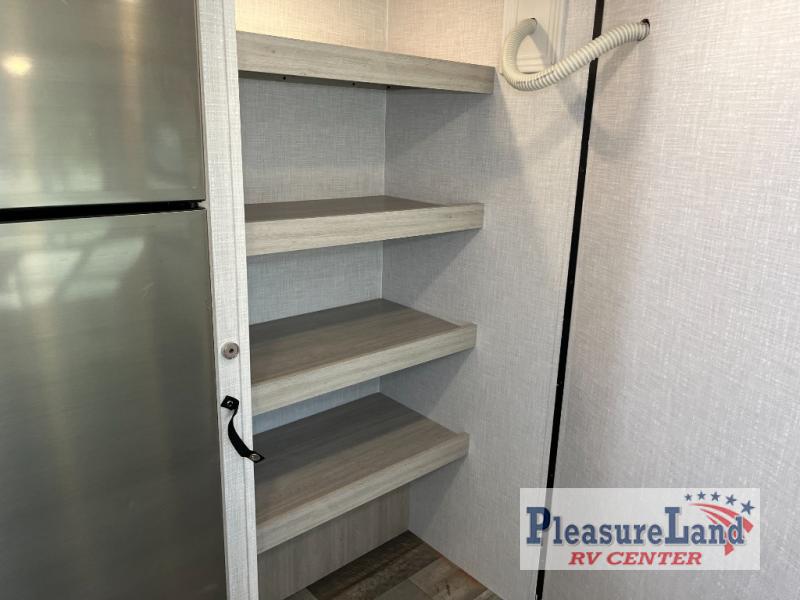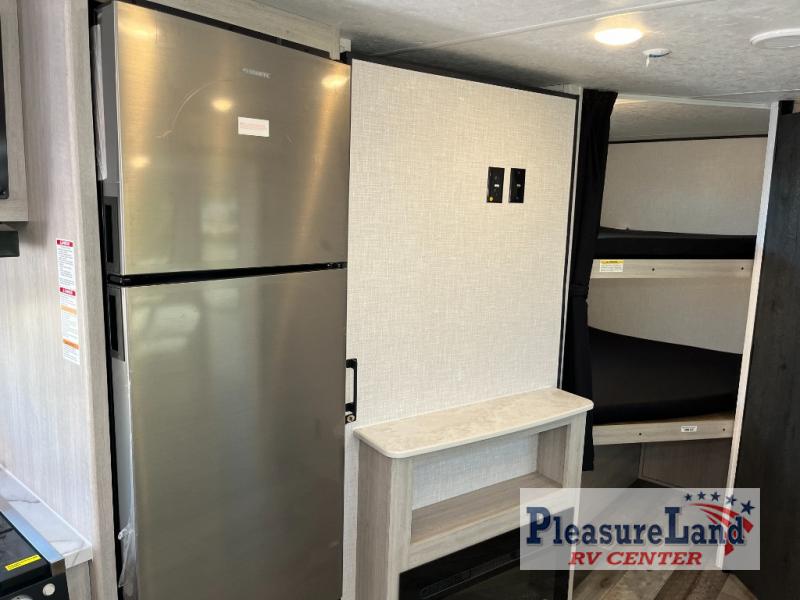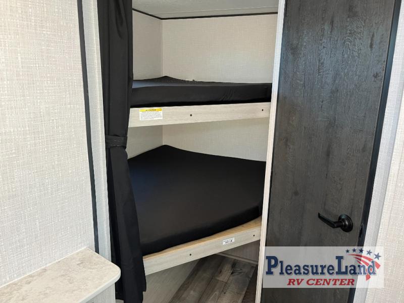 This spacious travel trailer is perfect for the group who loves to travel and camp. You'll have the front private bedroom all to yourselves that includes a queen bed, dual wardrobes and dual shelves to keep your space tidy. There is also a 36" sliding door that will save on space! Your guests or kids can sleep on the double-size bunks, and the full bath with a tub is right next to the bunks for easy nighttime use. The combined kitchen and living area will be a favorite place to hang out with its large slide out, 60" sofa and booth dinette, plus a fireplace with a hidden pantry behind for snacks galore!